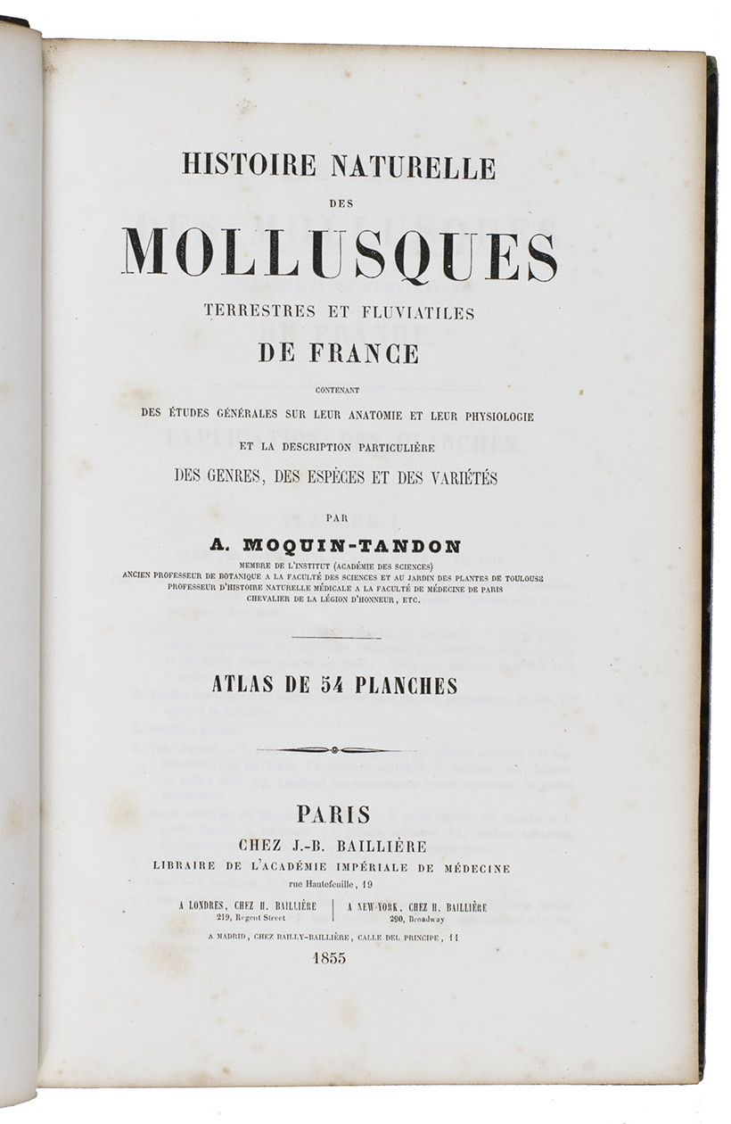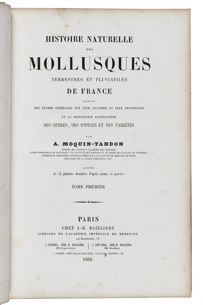 The French botanist Alfred Moquin-Tandon (1804-1863), professor of zoology and botany at Marseille and Toulouse, published his present history of French molluscs in 1855, the fruit of nearly twenty years of labour. It is recognised as one of the finest studies of molluscs from the mid-nineteenth century.