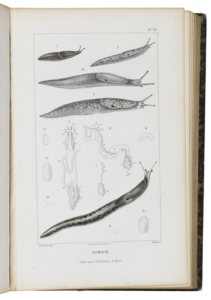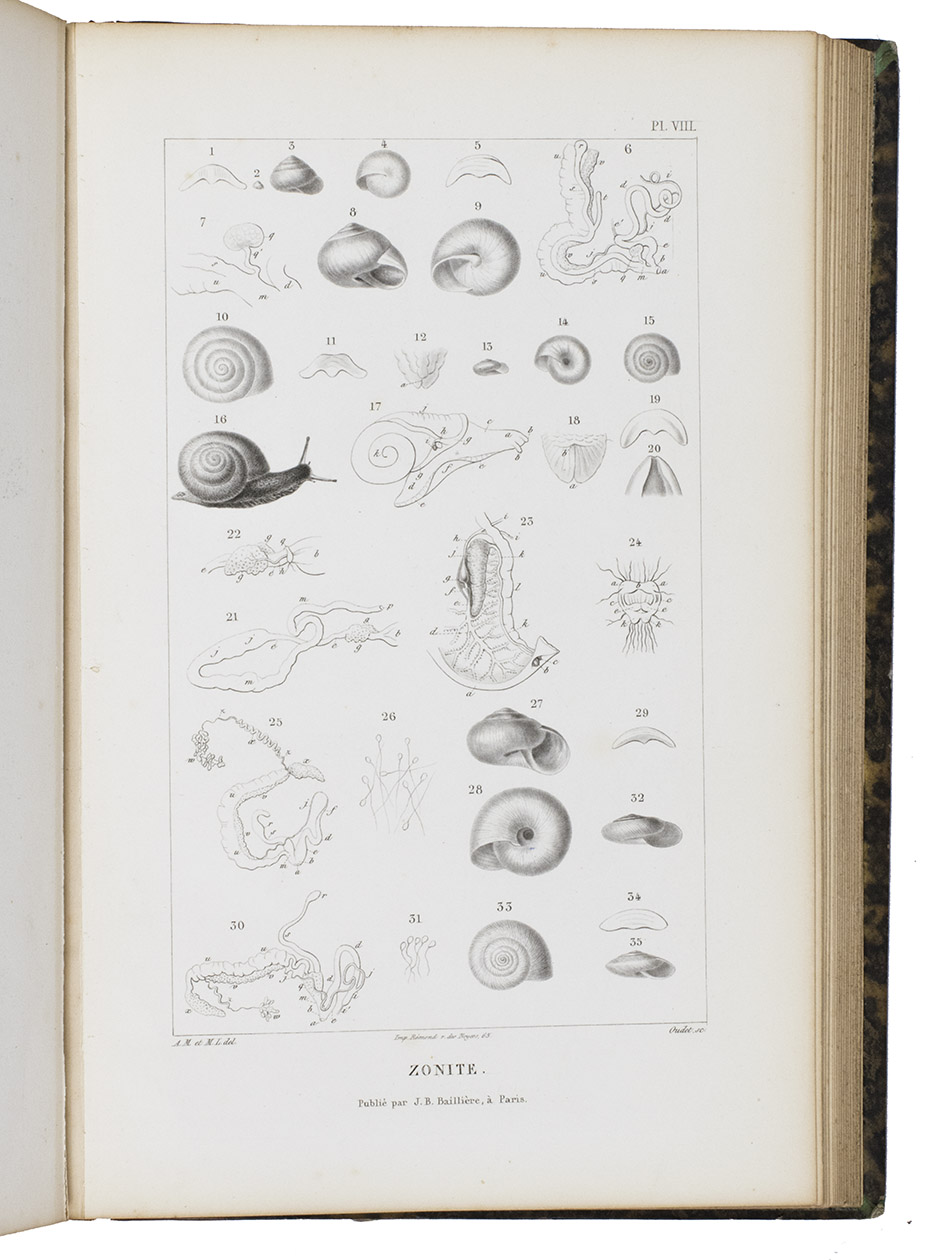 The two main volumes present all known families and species of molluscs in France at the time of writing. Moquin-Tandon provides a detailed description of each sort, their shapes, physical attributes and habitats. The atlas volume depicts shells and living animals as well as their radulae, genitals, sensory organs and nervous systems. Each plate depicts one type of mollusc and its various subspecies. Alfred Moquin-Tandons Histoire naturelle des mollusques ... de France set the standard for the description as well as the depiction of molluscs due to his taxonomic accuracy and the level of detail in the plates. The 54 uncoloured plates were printed by Rémond using his fine and detailed printing technology.