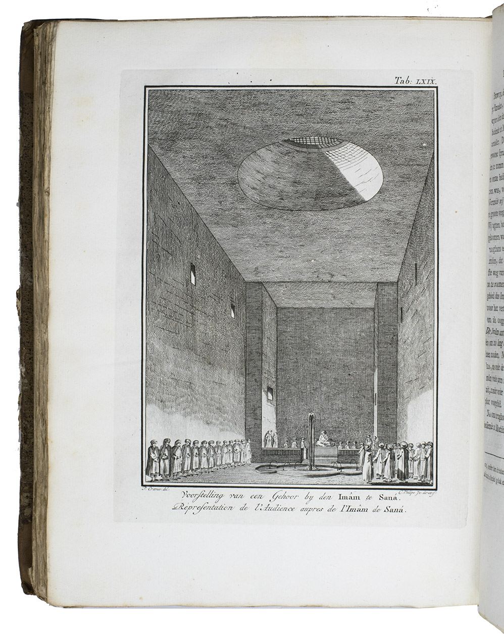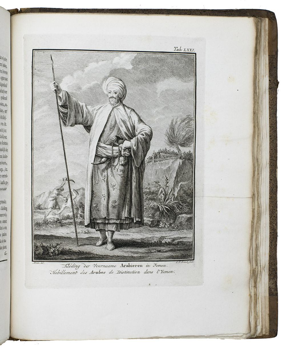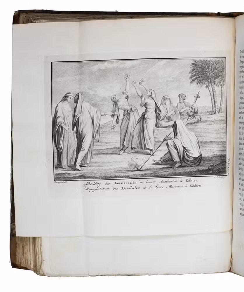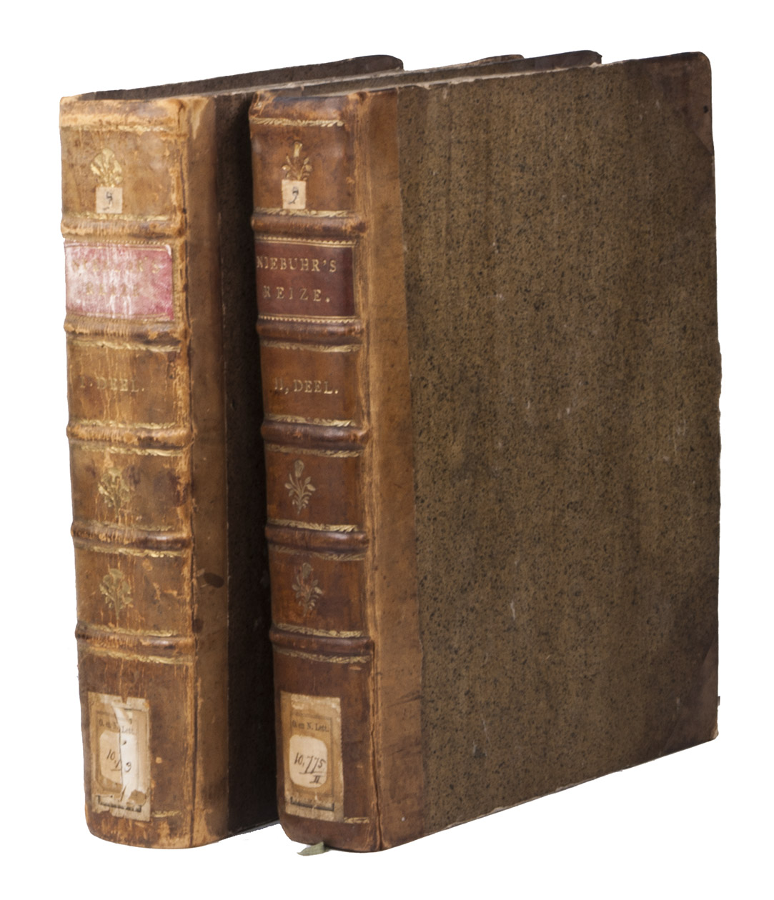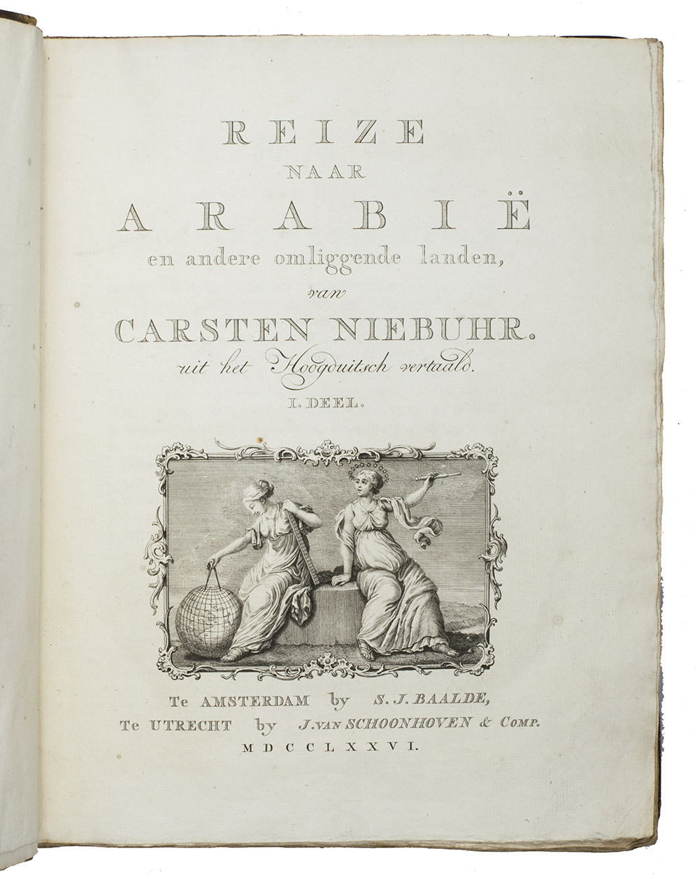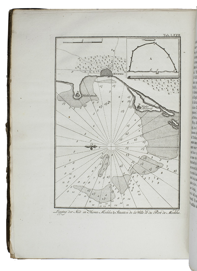 Amsterdam, S.J. Baalde; Utrecht, J. van Schoonhoven & Comp. (vol. 1) and Bartholomeus Wild (vol. 2) (colophons: printed in Utrecht by Johan Joseph Besseling), 1776-1780. 2 volumes. 4to (27.5 x 22 cm). With 2 engraved title-pages, each with the same vignette, 35 maps and plans (9 folding and the large map of Yemen coloured by hand in red and green outlines), 21 views (12 folding) and 69 other illustrations (19 folding) of people, sculptures and examples of ancient script, engraved by C. Philips, Th. and C.H. Koning, C.J. de Huyser, C.F. Fritsch, C. Brouwer and others. Half calf, sprinkled paper sides, gold-tooled spine with a red title label with gold lettering. VIII (I and III blank), [6], 484, [2]; [1], [1 blank], [1], [1 blank], [12], 455, [1] pp.