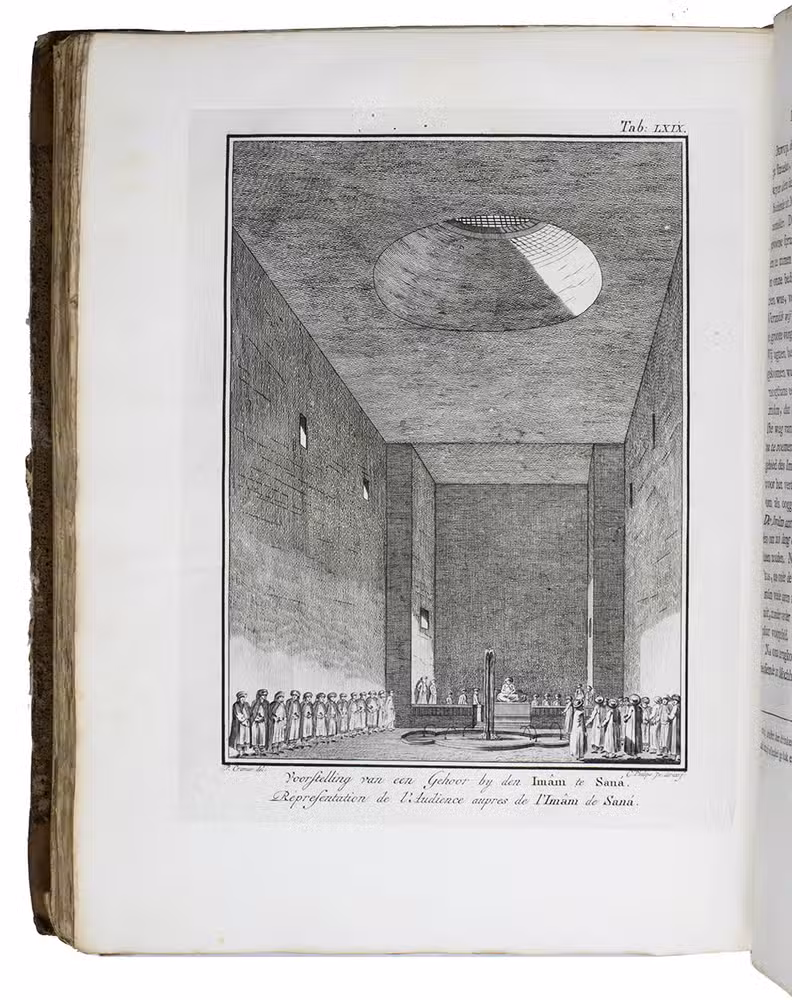 Carsten Niebuhr (1733-1815) was a Danish-German traveller and surveyor. He studied mathematics and became an engineer and as such joined a scientific expedition to the Middle East, sent out by King Frederick V of Denmark in 1760-1761. "The expedition had been proposed by the Hebrew scholar Johann David Michaëlis of Göttingen for the purpose of illustrating certain passages of the Old Testament ..." (Howgego). The expedition took Niebuhr and five others from Copenhagen to Constantinople and on to Egypt, the Arabian Peninsula and even India.