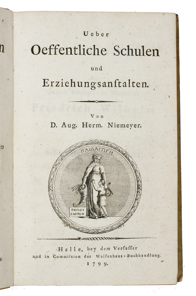 First edition of a German plan of education, with the additions for the second and third editions of Grundsätzen der Erziehung und des Unterrichts bound in at the end and the extra title-page for these additions facing the main title-page. The book proposes an overall plan and program for the organisation of public schools in Prussia and in the whole of Germany; not only for general education in primary schools and for professional education in agrarian, technical, industrial, commercial and art schools, in schools for girls, etc., but also for education in military academies, universities and for special education in orphanages, schools for the blind, deaf-mute children, etc.