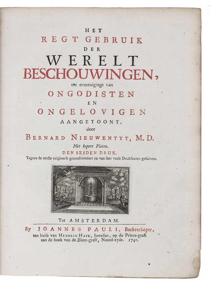 The sixth corrected edition of this comprehensive argument for the existence of God based on the purposefulness of nature. Nieuwentyt wanted to convince atheists and unbelievers (notably Spinozists) of the existence of God by describing the intricacies and laws of nature. The work was pivotal in introducing the new experimental philosophy of Boyle and others into the Dutch Republic.