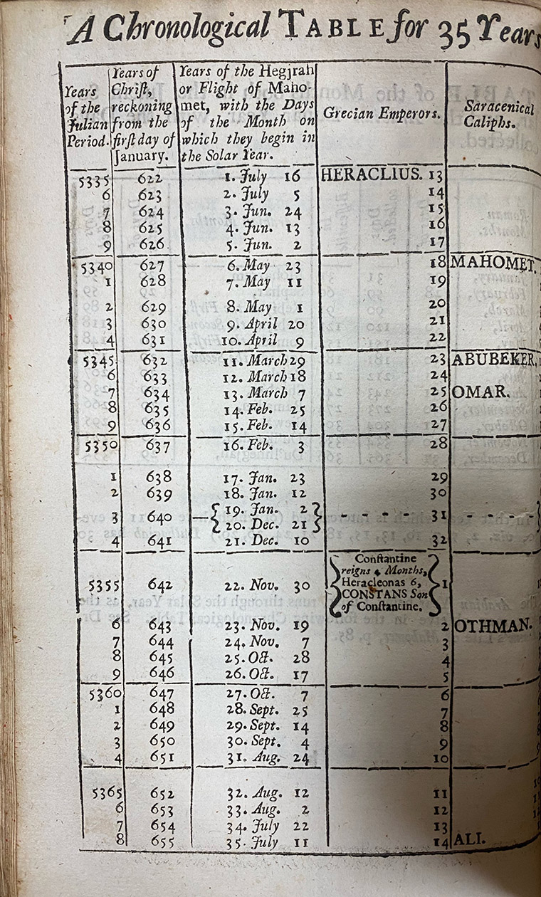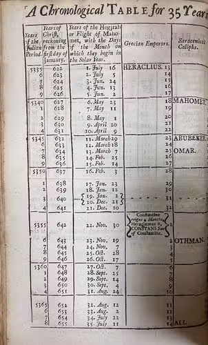 First edition of the author's most famous work. The orientalist Simon Ockley (1678-1720) was educated at Queens' College, Cambridge. He became fellow of Jesus College and vicar of Swavesey, and in 1711 was appointed professor of Arabic at the University. His History of the Saracens (as he called the 1718 second edition of the present work and the second volume added at that time) long enjoyed a great reputation; unfortunately Ockley took as his main authority a MS. in the Bodleian of pseudo-Wakidi's Futúh al-Shám, which is more historical romance than history. He also translated from the Arabic the Second Book of Esdras" (Enc. Brit.). For some reason, the present copy an alternative version of the dedication to Henry Aldrich, probably from the second edition of 1718, inserted in the middle of the preface, after p. XX. The 1718 edition was printed for the same four publishers (plus one more) and seems likely to come from the same printing office.