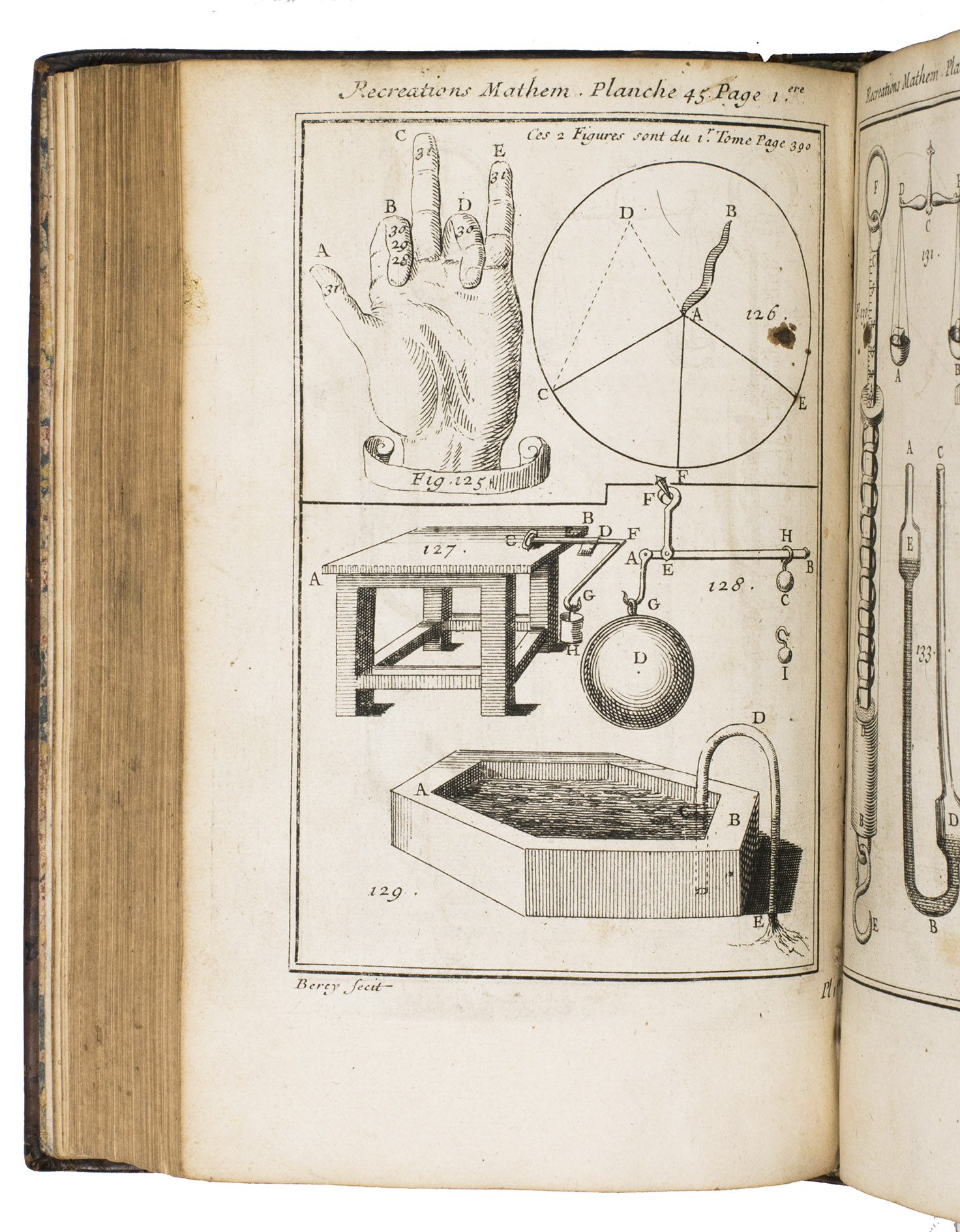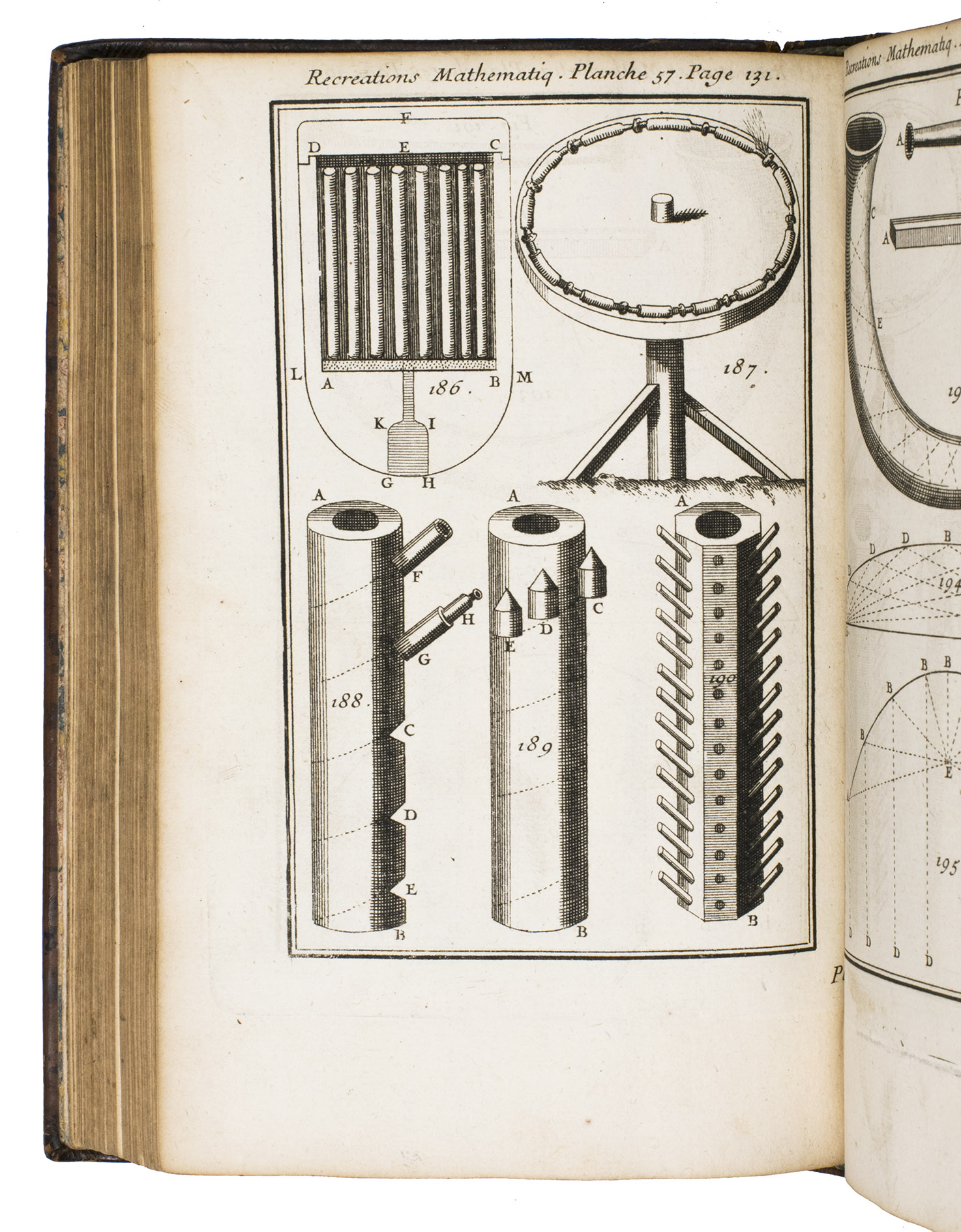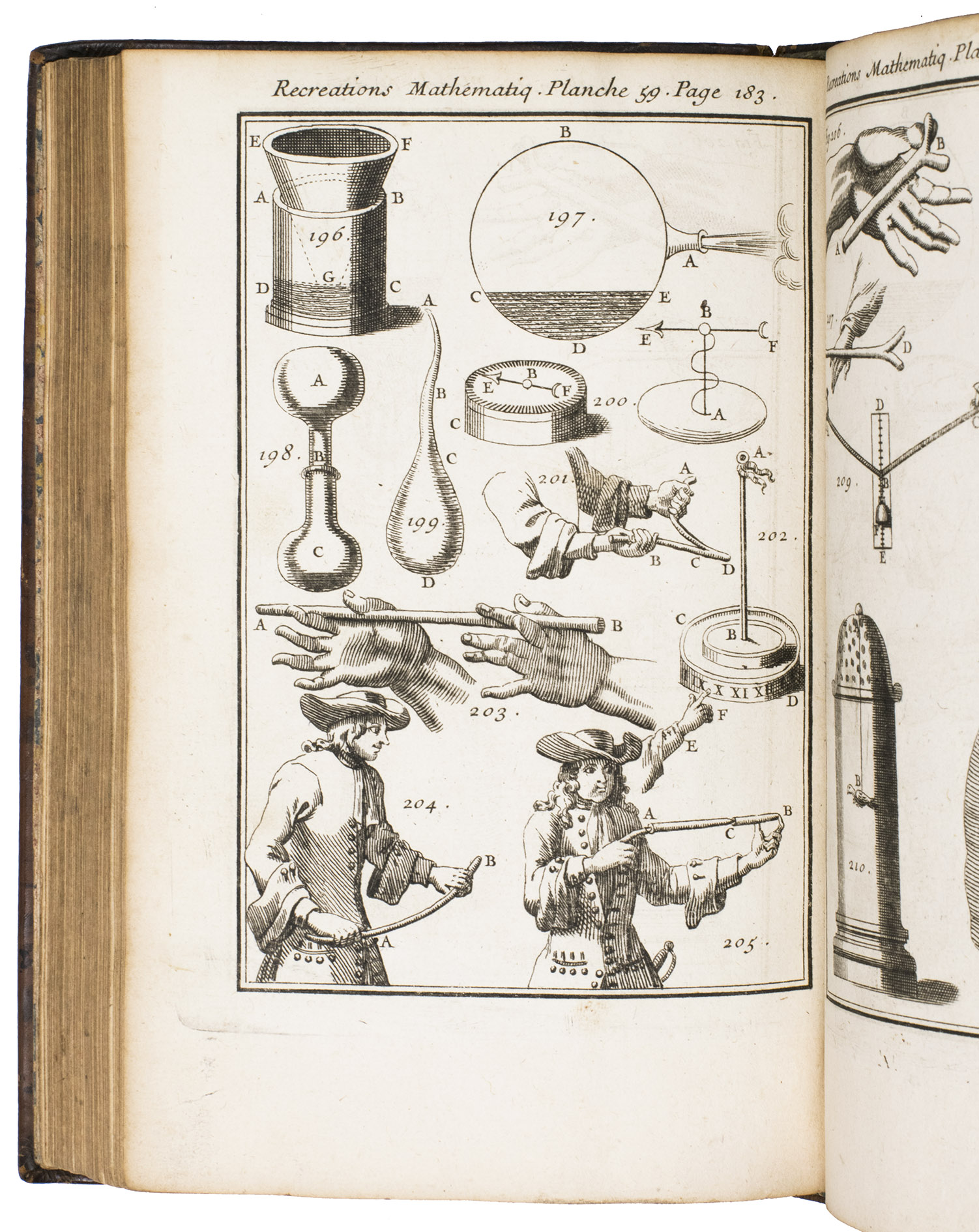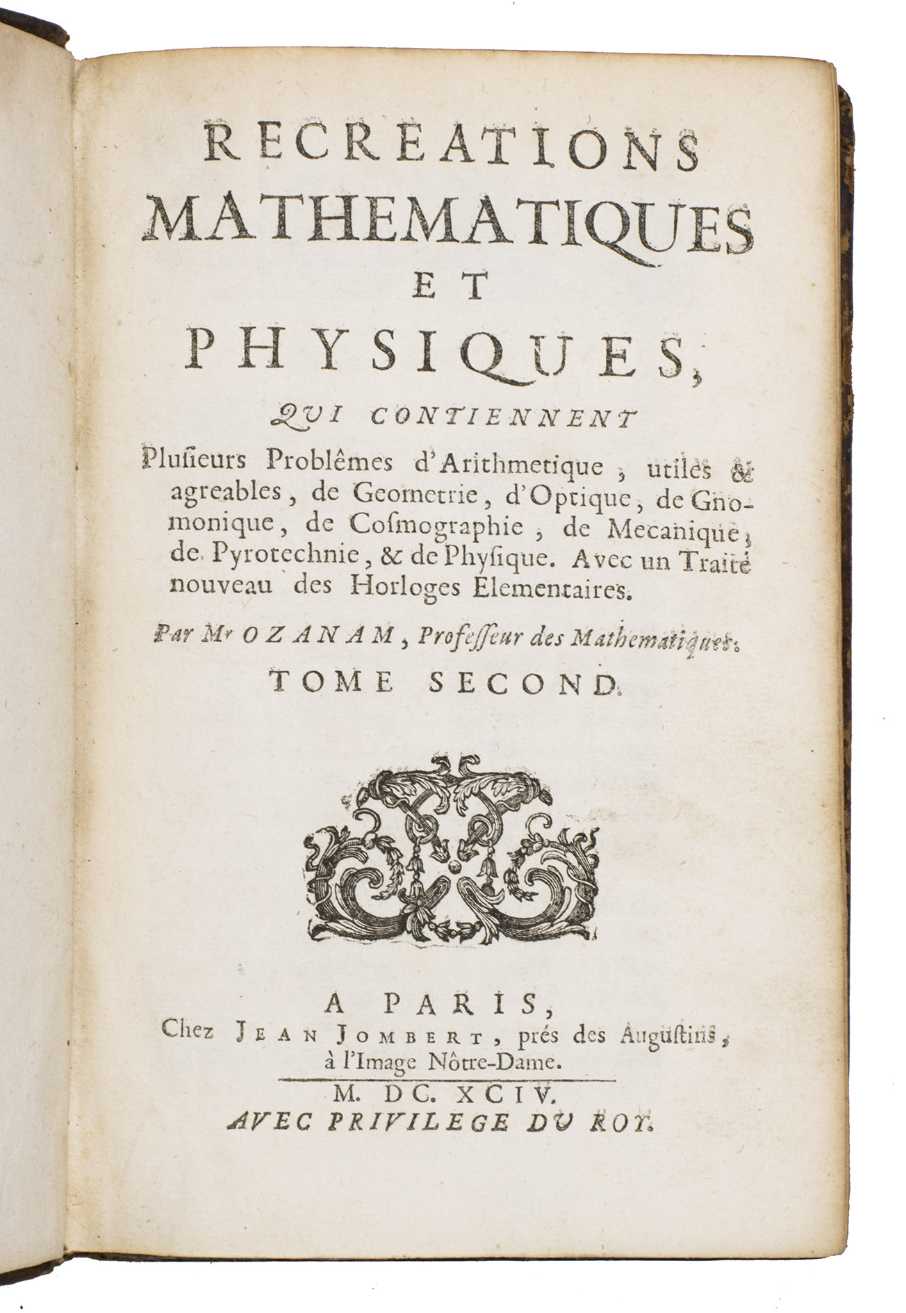 First edition of a popular compendium of science, presenting both serious scientific optical and physical demonstrations and experiments, and descriptions of conjuring tricks, fireworks, games with numbers, etc. The added treatise on clocks was based upon Martinelli's Horlogi elementari, with popular observations by Ozanam added. The present work became very popular and was used at schools as well as in the homes to teach youth all aspects of mathematical sciences.