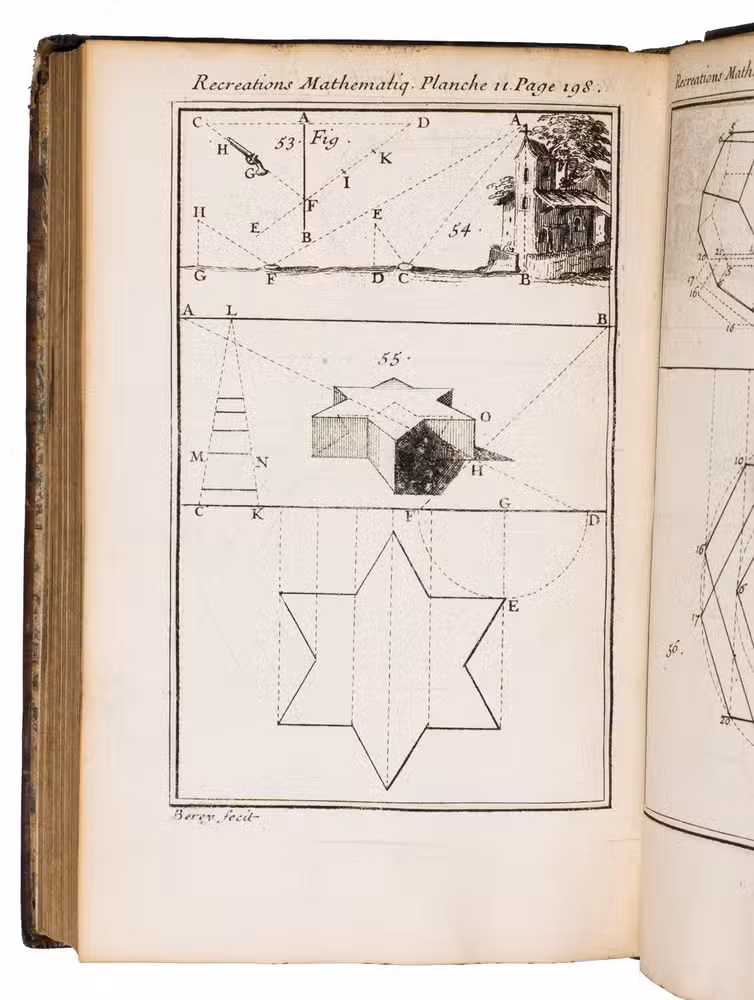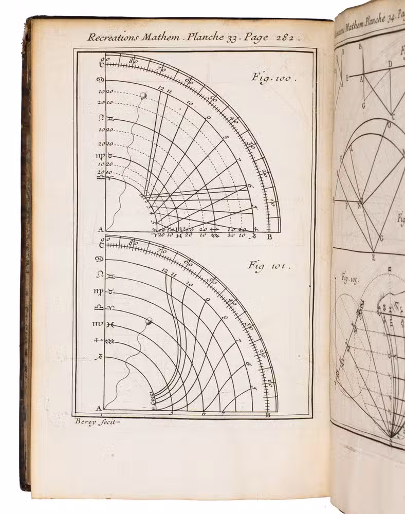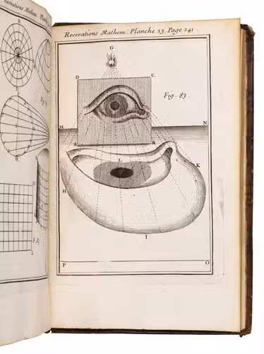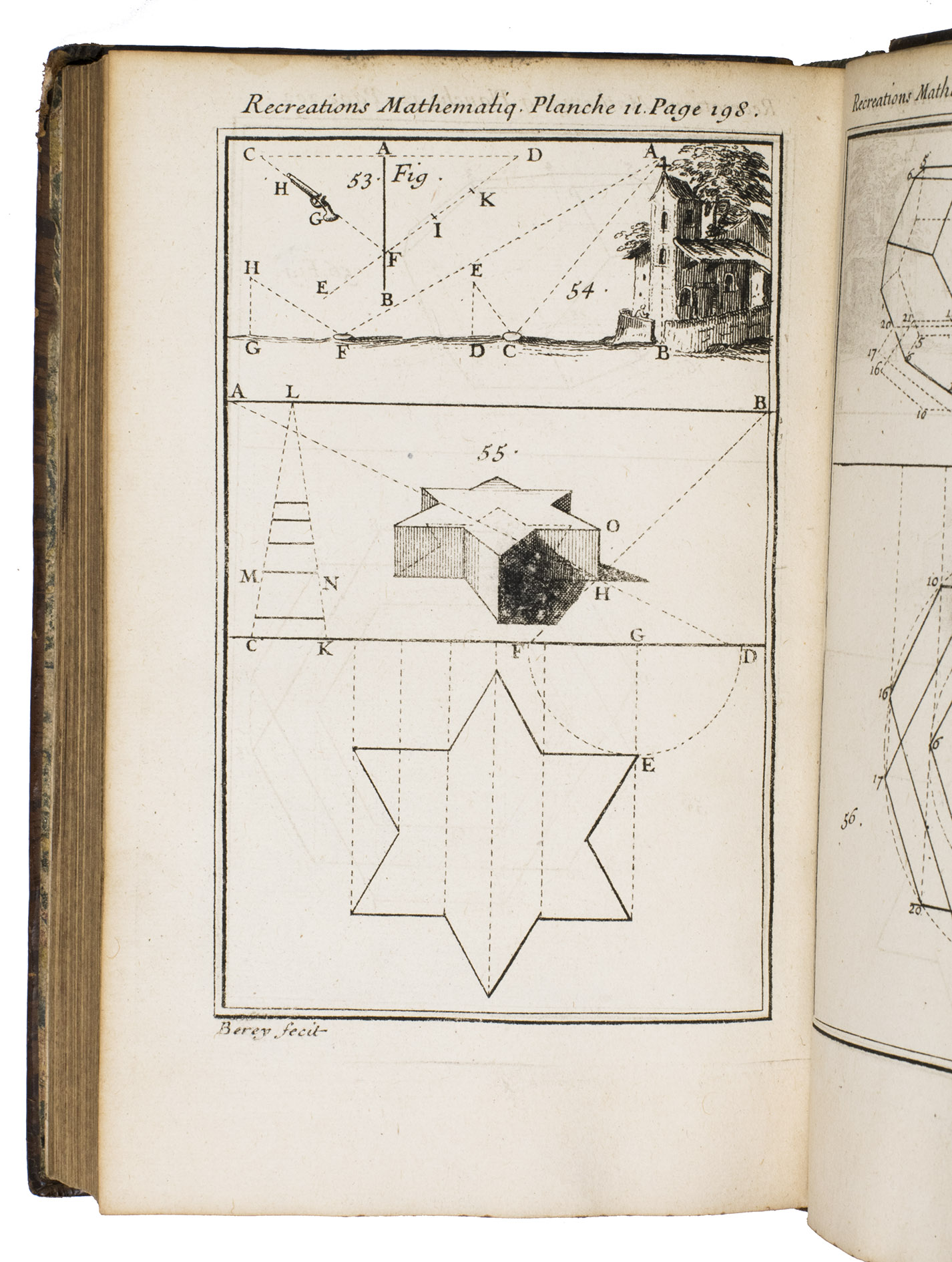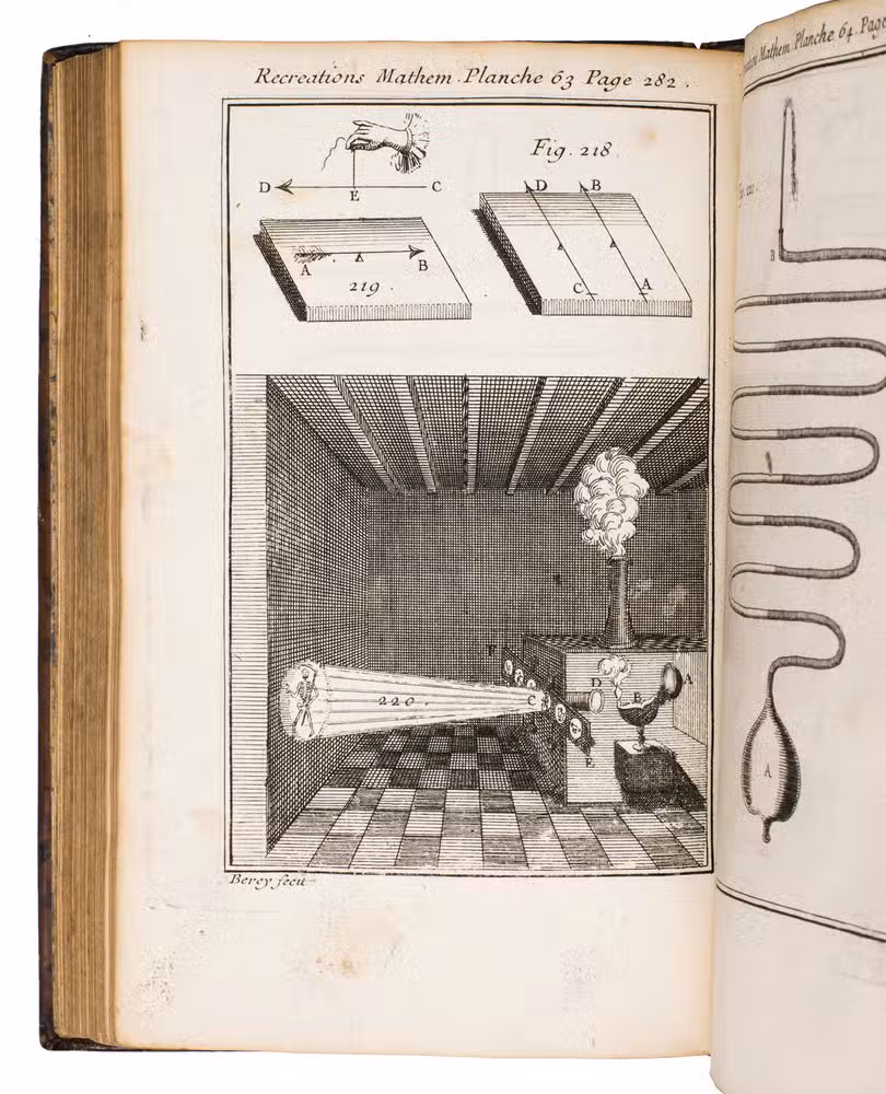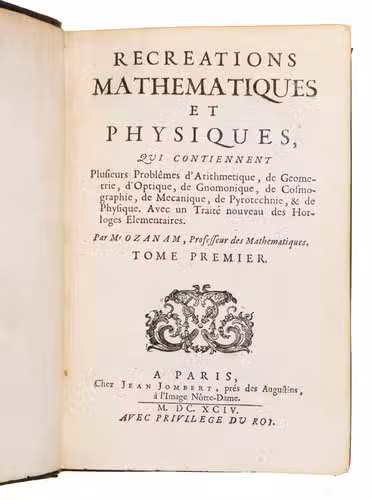 First edition of a popular compendium of science, presenting both serious scientific optical and physical demonstrations and experiments, and descriptions of conjuring tricks, fireworks, games with numbers, etc. The added treatise on clocks was based upon Martinelli's Horlogi elementari, with popular observations by Ozanam added. The present work became very popular and was used at schools as well as in the homes to teach youth all aspects of mathematical sciences.