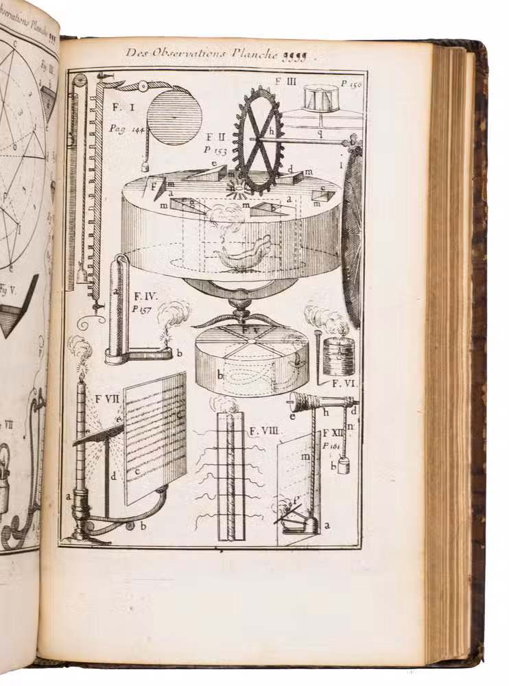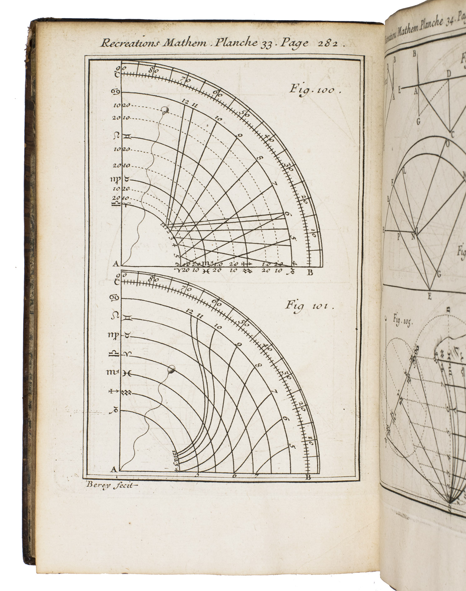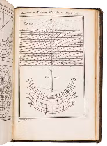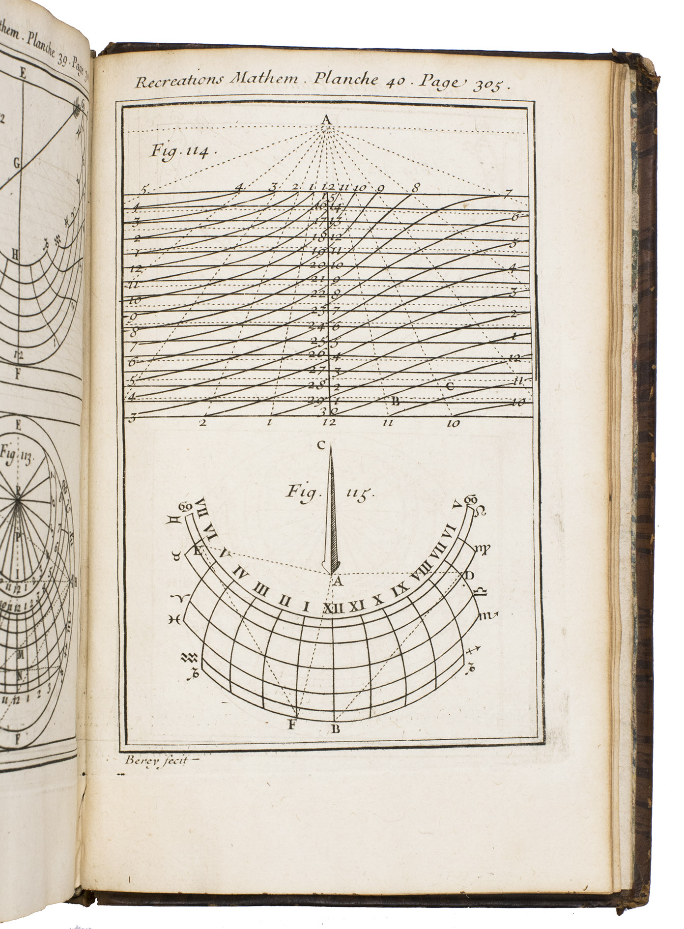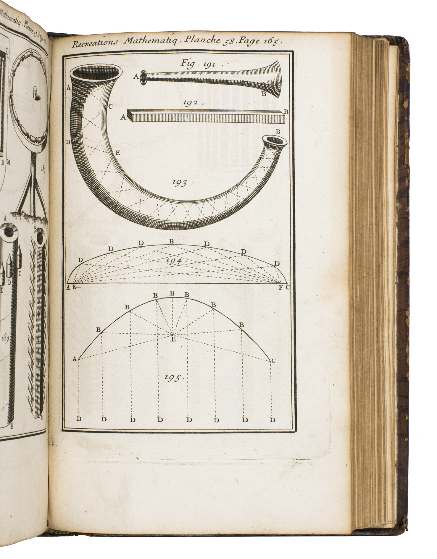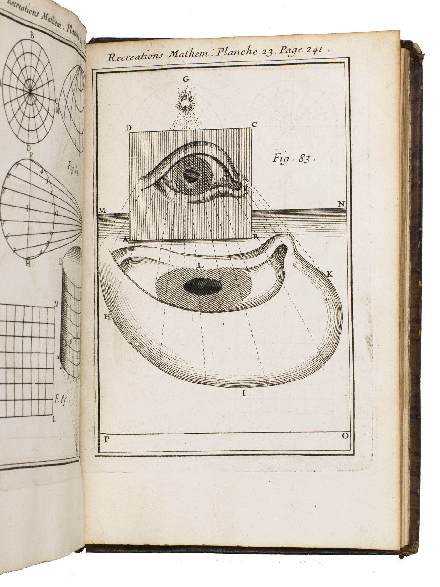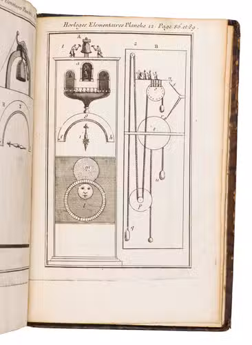 "Paris" [= Northern Netherlands?], Jean Jombert, 1694. 3 parts in 2 volumes. 8vo. With diagrams and tables in text, and numerous geometrical, perspectival, technical and scientific illustrations on 64 full-page plates in the main work, and numerous illustrations of parts and details of clocks and watches on 20 full-page engraved plates in the added treatise. Contemporary sprinkled calf. [32], 400; [16], 303, [1], 163, [1], [4] pp.
