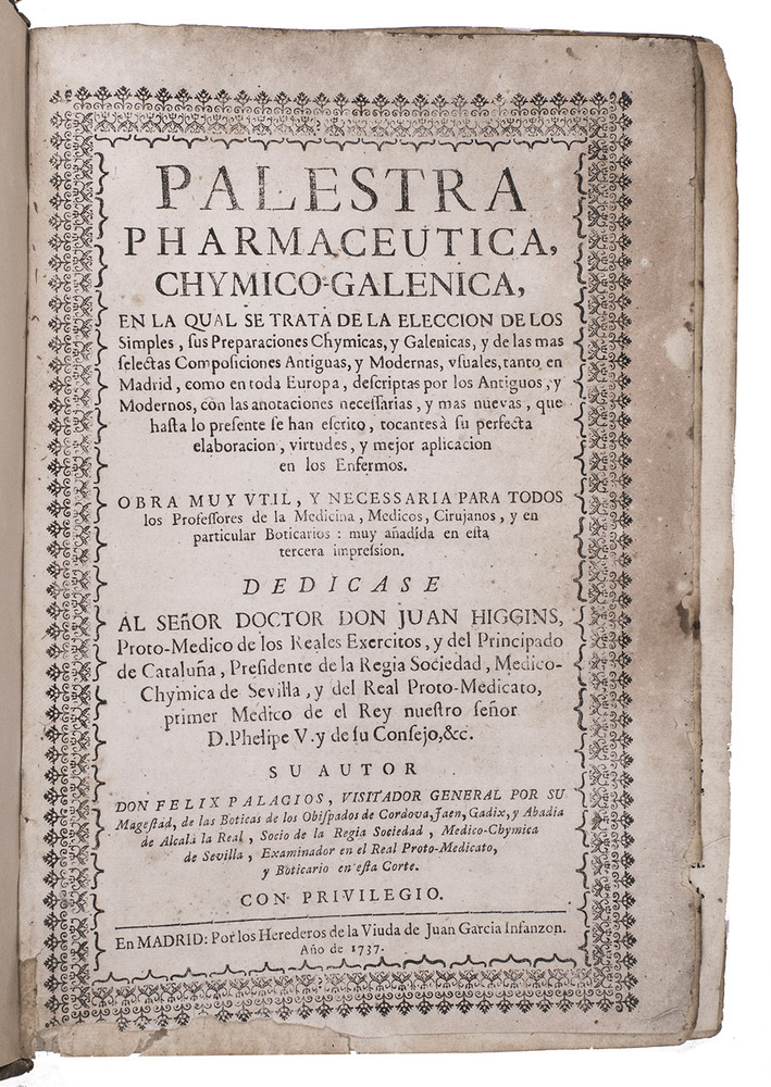 Palestra pharmaceutica, chymico-galenica, en la qual se trata de la eleccion de los simples, sus preparaciones chymicas, y galenicas, y de las mas selectas composiciones antiguas, y modernas, usuales, tanto en Madrid, como en toda Europa, descritas por los antiguos, y modernos, con las anotaciones necesarias, y mas nuevas, que hasta lo presente se han escrito, tocantes à su perfecta elaboracion, virtudes, y mejor aplicacion en los enfermos. Obra muy util, y necesaria para todos los profesores de la medicina, medicos, cirujanos, y en particular boticarios; muy anadida en esta tercera impression.