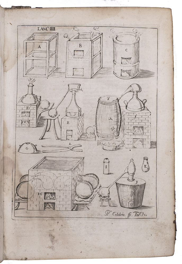 Rare fifth(?) edition, published in the year of the authors death, of a work on pharmaceutical chemistry written by the Spanish apothecary Félix Palacios (1677-1737). When the Palestra pharmaceutica appeared in 1706, it was the first work on the subject written in the Spanish language. Even though it became widely accepted and used in Spain, Palacios met strong resistance from his colleagues because he rejected the galenic, or plant based, medicines in favour of chemical medicines. With this he rejected the ideas of Galen, Mesue and Dioscorides, which were still the standard in most parts of Europe and the Middle East. The work starts with a preliminary text, followed by a chapter on the general principles of pharmacology and chemistry in the form of questions and answers. The other four chapters deal with the ingredients and making of the medicines. It discusses distillation and calcination methods with the engraved plates showing various tools and instruments: pots, furnaces, alambics etc.