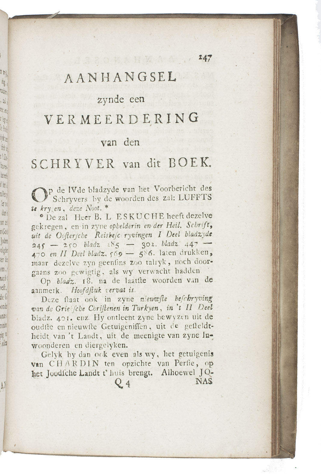Leiden, Johannes le Mair, 1762. 8vo. With 4 engraved plates. Contemporary vellum. [66], 287, [15], [2 blank] pp.