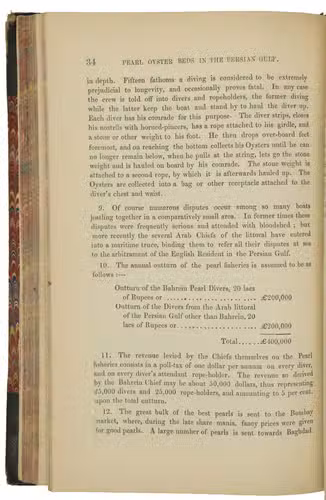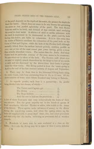 An early and valuable study of the pearl fisheries along the Arabian Coast by the British political officer Lewis Pelly (1825-92). The article covers the locations of the most fruitful beds at Bahrain, right of access, approximate number of boats (plus their ownership and division of profits), and annual yield. A vivid paragraph describes the divers, detailing their attire, including "horned-pincers" (p. 34) for the nose, and technique. Of particular interest is a brief note on the market for the pearls: a large number of white pearls are sent to Baghdad, while the "great bulk of the best pearls is sent to the Bombay market, where, during the late share mania, fancy prices were given for good pearls" (p. 34).
