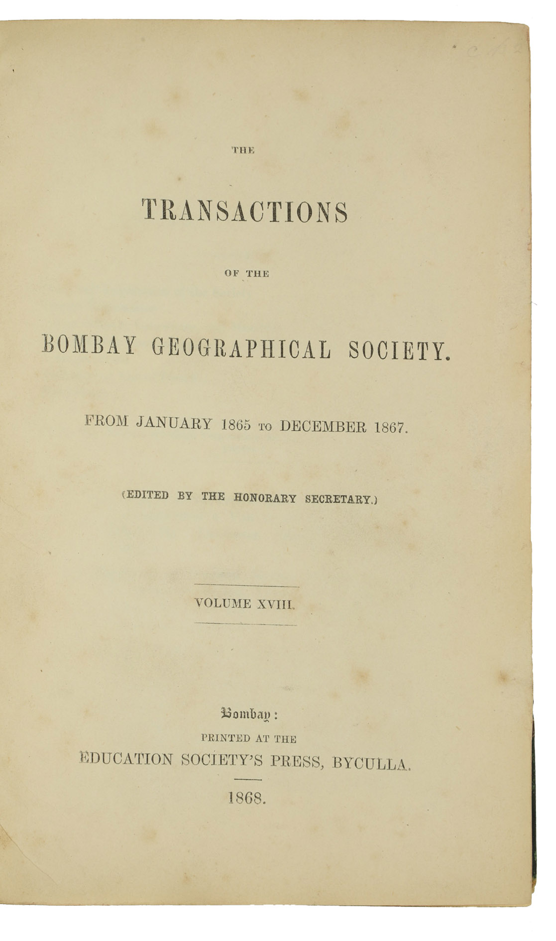 Bombay, printed at the Education Societys Press, Byculla, 1868. 8vo (14.5 x 21.7 cm). With 5 folding maps, including 3 hand-coloured, and an illustration in the text. Contemporary half green calf and marbled paper over boards. 16, cxiii, [1 blank], 117 pp. [The article: pp. 32-35].