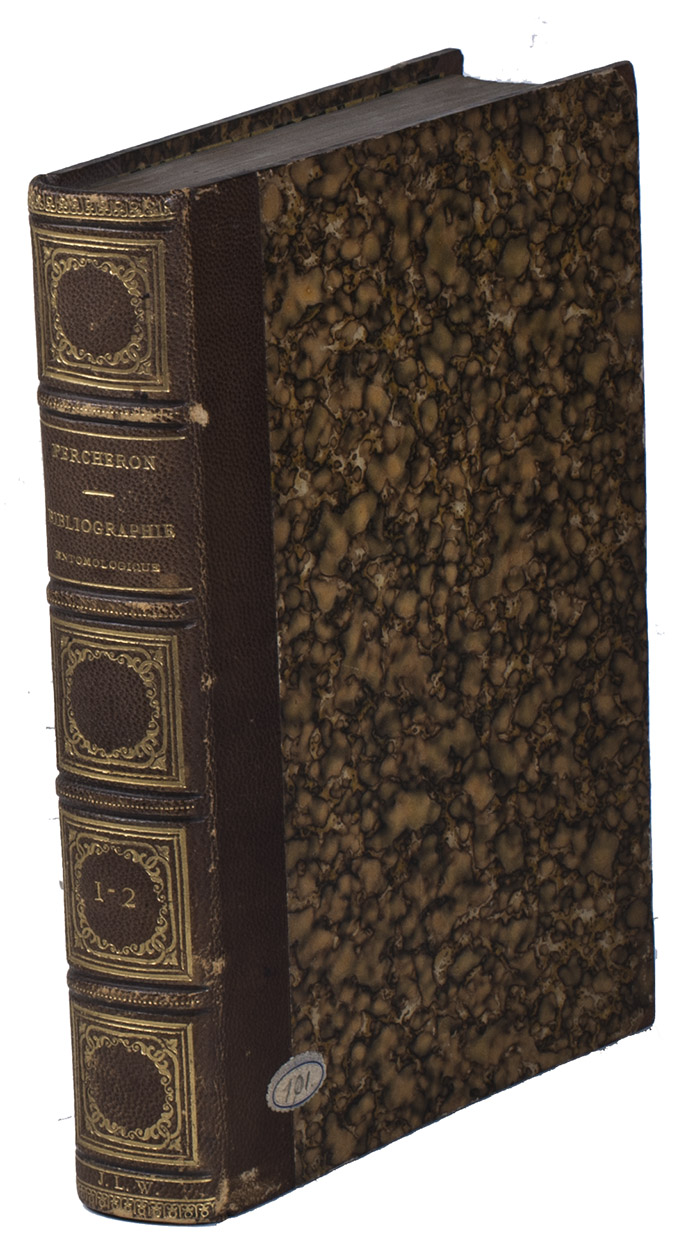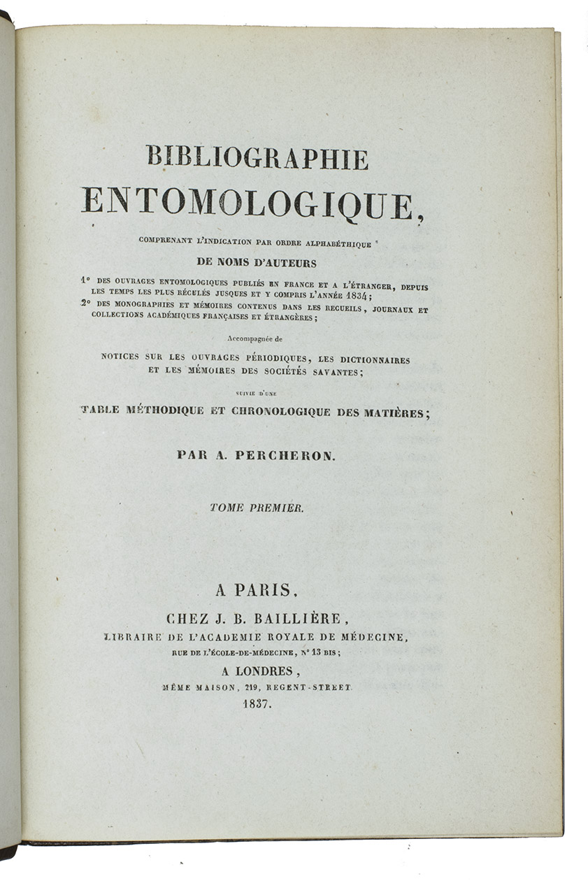 Early entomological bibliography which was followed 25 years later by Hagen's more detailed bibliography. Achille Rémy Percheron (1797-1869) was a French entomologist. "Les Français se sont peu interessé à la bibliographie. On peut seulement citer la 'Bibliographie Entomologique' jusqu'en 1834 de Percheron (2 volumes, 18370) avec 5000 références et 500 anonymes"(Gouillard p.26).