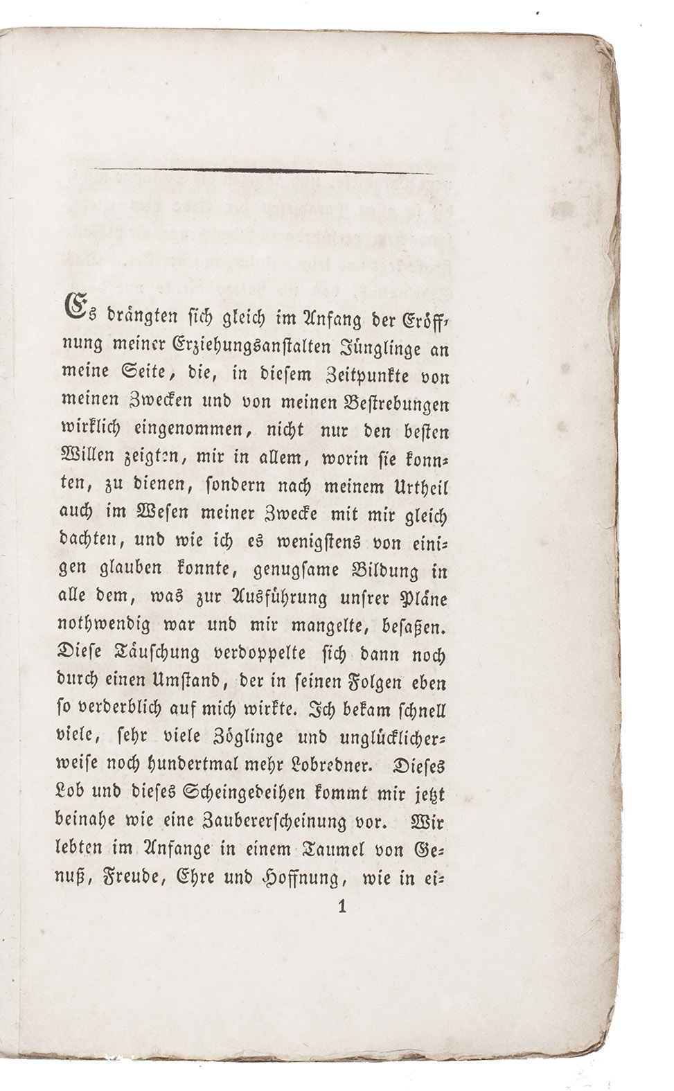 First edition of the public account, rendered by the famous Swiss educational reformer Johann Heinrich Pestalozzi (1746-1827), of what happened during his presidency of the pedagogical institutions in Burgdorf and Yverdun. He had hoped that with time the results of his work would silence the disputes around it, but now that he is forced to wind up his school almost completely, he feels he must no longer keep silent and gives a full account of what had happened at these educational establishments. The book explains about the animosity between two of his most gifted pupils and co-workers, Schmid and Niederer, and the Niederer family's lawsuit against him. Pestalozzi was acquitted of all charges.