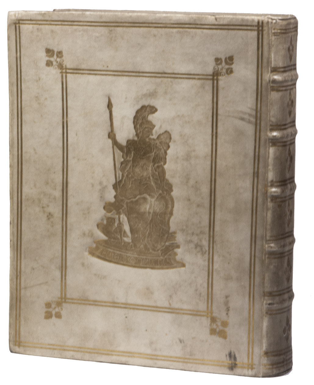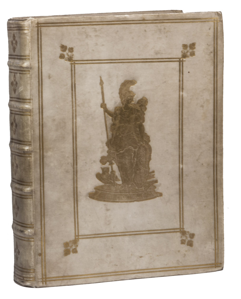 Amsterdam, R. & J. Wetstein, G. Smith, 1727. 4to. With a frontispiece of Aesop, including the portrait of William August (1721-1765) Duke of Cumberland. Vellum over thick boards, ruled in gold with gold corner pieces and a gilt stamp of Minerva with the coat-of-arms of The Hague in the center, ribbed spine gilt in compartments (price-binding of the Latin School in The Hague (Spoelder, The Hague, 3). [10], 88, [96] pp.
