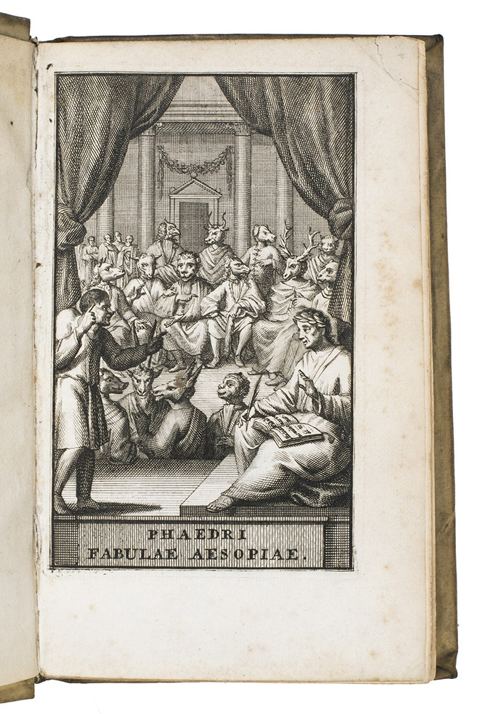 Amsterdam, Johannes Janssonius van Waesberge, 1703. 8vo. With an engraved frontispiece showing Phaedrus and Aesop on the stage of a theatre filled with men with animal-heads, title in red and black, some woodcut tailpieces and initials. Contemporary vellum, manuscript title on spine. [24], 156, [2], 157-218, 157-298, [2] pp.