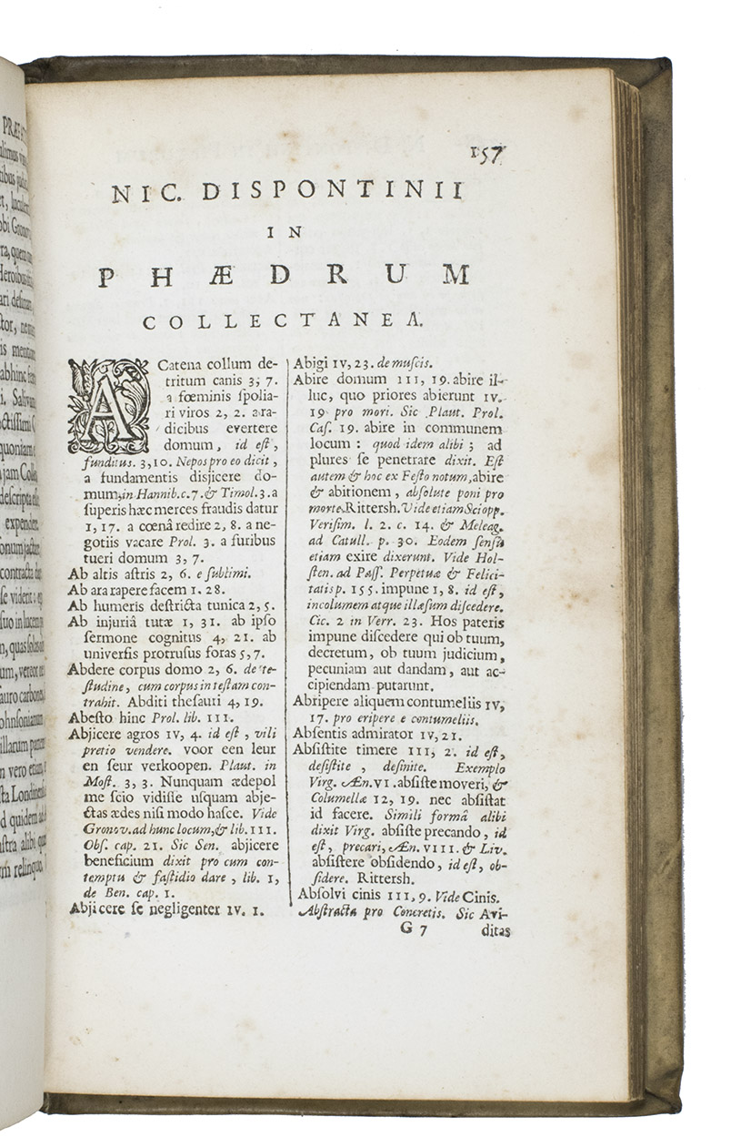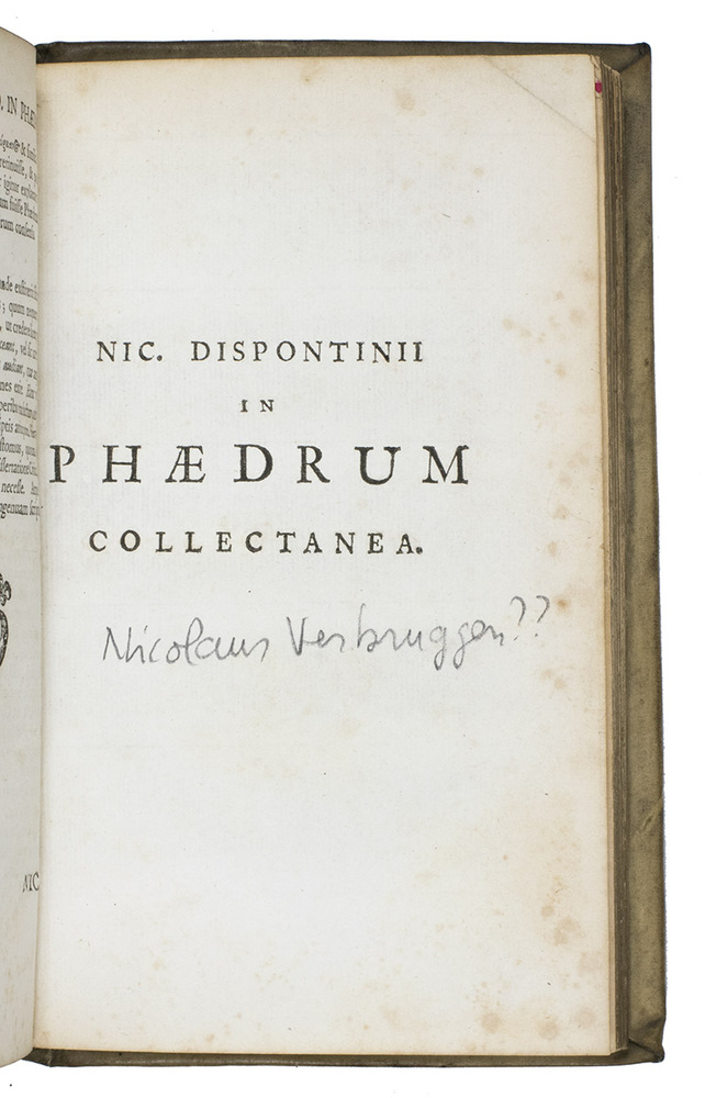 Edition by the apparently unknown Dutch scholar Nicolaus Dispontinus (Nicolaas Verbruggen?) of the Latin Phaedrus fables, who also added his Collectanea to the text (pp. 157-218) and some emendations by the Dutch classical scholar Jacobus Gronovius (1645-1716) and his father Johann Friedrich Gronovius.