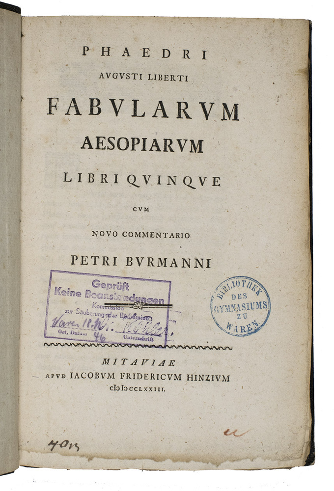 Re-edition of the complete and the most prestigious edition of the Burman recension of the 91 Fables of Phaedrus in Latin verses with Burmans extended commentaries printed in two columns underneath each fable (see nr. 31), without, however, the Epistola Critica, to H. B[land[, S[cholae] E[tonensis], I[nstructorem] by Francis Hare, dated London, 30 January 1727: against the edition published by the famous classical scholar Richard Bentley in 1726, being, according to the first short preface (p. iv), too offensive.