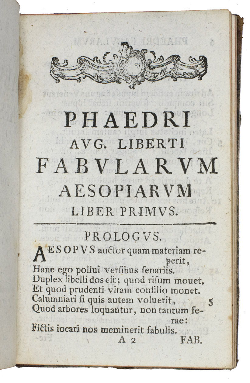 Apparently third edition of a little book containing only the text of the 94 Phaedrus Fables and the 34 Fables of the Appendix, including the fables found by Marquqtus Gudius (1635-1686), all in Latin verses, in the famous recension of Petrus Burmannus.