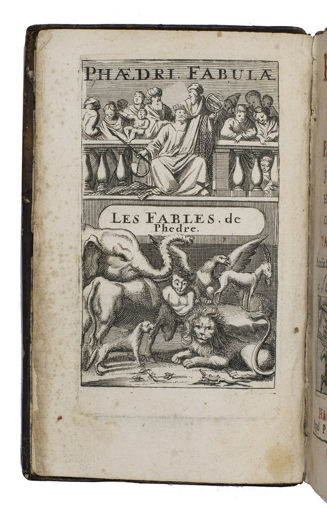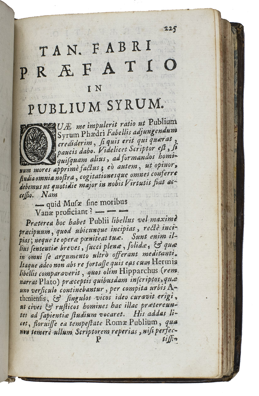 Sixth edition of this redaction of the Phaedrus Fables in verse together with the French translation on facing pages [except for Fable Lib.IV, XIV (p. 153): "LHonȇteté ne permet pas non plus quon traduise cette Fable"], after the fourth edition (Amsterdam, for Paul Marret, 1689), together with the annotations by Tanaquillus Faber (1615-1672), a French philologist and Professor of Greek at the University of Saumur, edited by J. Scheffer, who also added the congenial Sententiae by Publilius (often wrongly Publius) Syrus (fl. 85-43 BC), a Latin mime player and writer. All that remains of his corpus is this collection of Sententiae a series of moral maxims in iambic and trochaic verse. Each maxim consists of a single verse, and the verses are arranged in alphabetical order. In the course of time the collection was interpolated with sentences drawn from other writers, especially from apocryphal writings of Seneca the Younger. The Sententiae are published here with the preface by Faber, Testimonia, the few lines from Petronius Satyricon, ascribed to him, and the notes of Janus Gruterus (1560-1627), professor of History and librarian in Heidelberg.