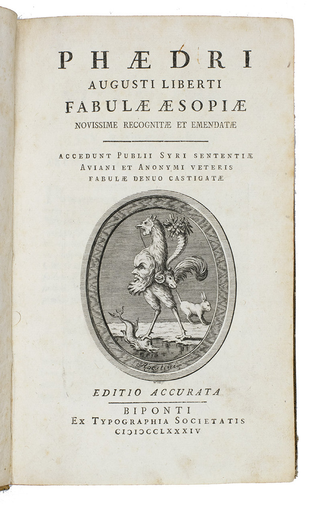 The well printed celebrated "Biponti society" edition of Phaedrus, part of a renowned series of Greek and Latin texts published in the German city of Zweibrücken (Biponti, a town near Sarbrücken), starting in 1779. The edition is partly based on the edition of Johann Albert Fabricius (1621-1736) as edited by Johann August Ernesti (1707-1781). Ultimately, however, the starting point of the edition was the Petrus Burman recension, with notes by Gudius and with fables added from the Romulus, the Niccolò Perotti (1430-1480) appendix and others, as well as the Avianus and Anonymous (i.e., "Anonymous Neveleti") fables mentioned. The book also contains the Vita Phaedri by Johannes Scheffer (1621-1679), and the "Notitia literaria de Phaedro ex Jo. Alb. Fabricii Bibliotheca Latina" by the editor Ernesti (pp. xiii-lii), and "De Anonymus vetere fabularum auctore..., latin. ed Ernesti" also by the editor.