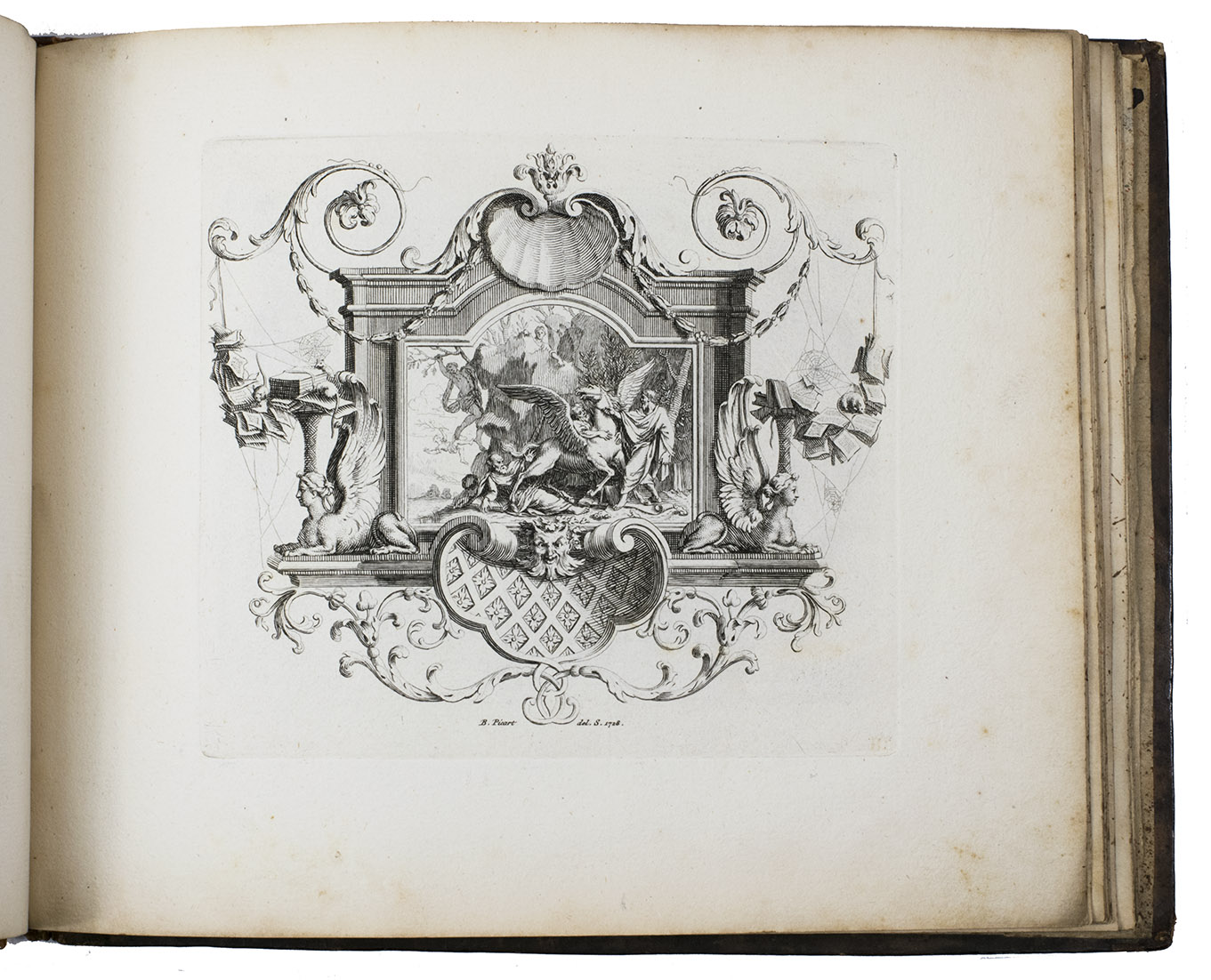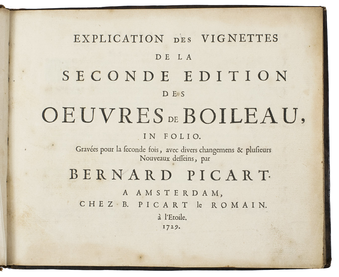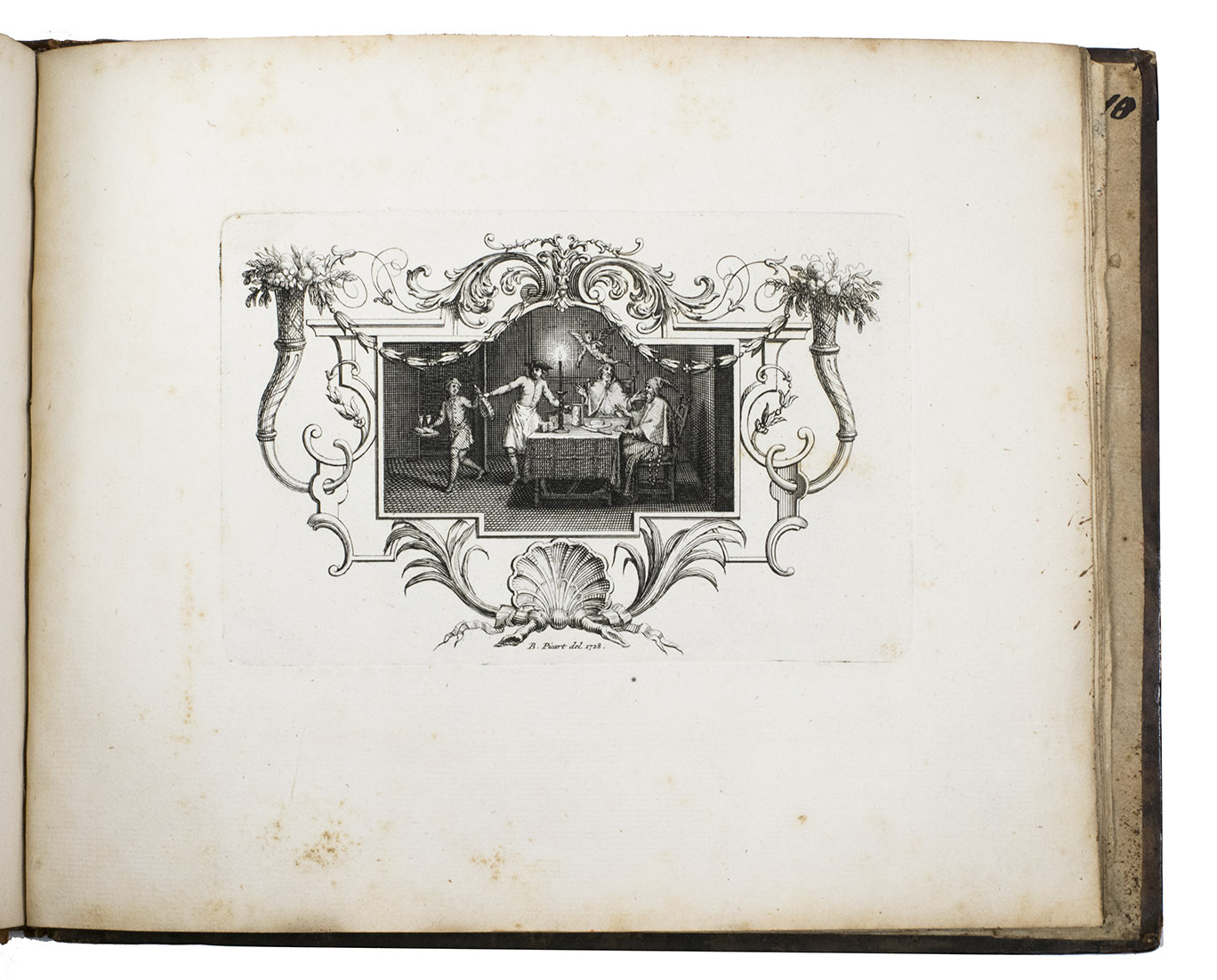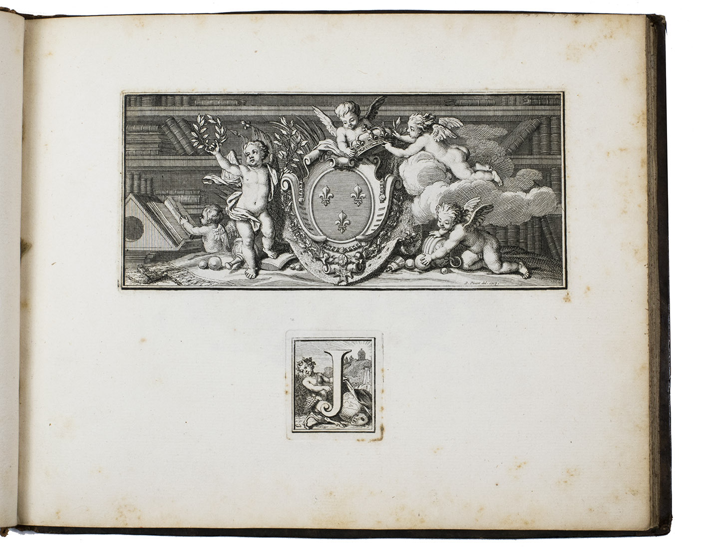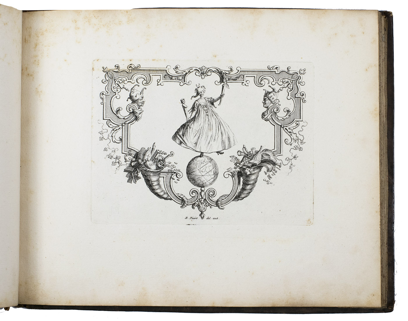 Very rare first and only edition of a collection of engraved vignettes by Bernard Picart (1673-1733) that were used as illustrations in the 1729 edition of Nicolas Boileau-Despréaux, Oeuvres, The Hague, Pierre Gosse & Jean Neaulme (Lewine, p. 73). For the present edition Picart engraved new plates with the same designs. The lavish vignettes are all signed and dated 1728 on the plate and include a portrait of Erasmus, the coat of arms of the Princess of Wales, the coat of arms of Grandmaster de Wignacourt, a portrait of Louis XIV of France, the coat of arms of Guillaume de Lamoignon (1617-1677) and theatrical and allegorical scenes. The first 8 text pages provide information about the scenes in the vignettes.