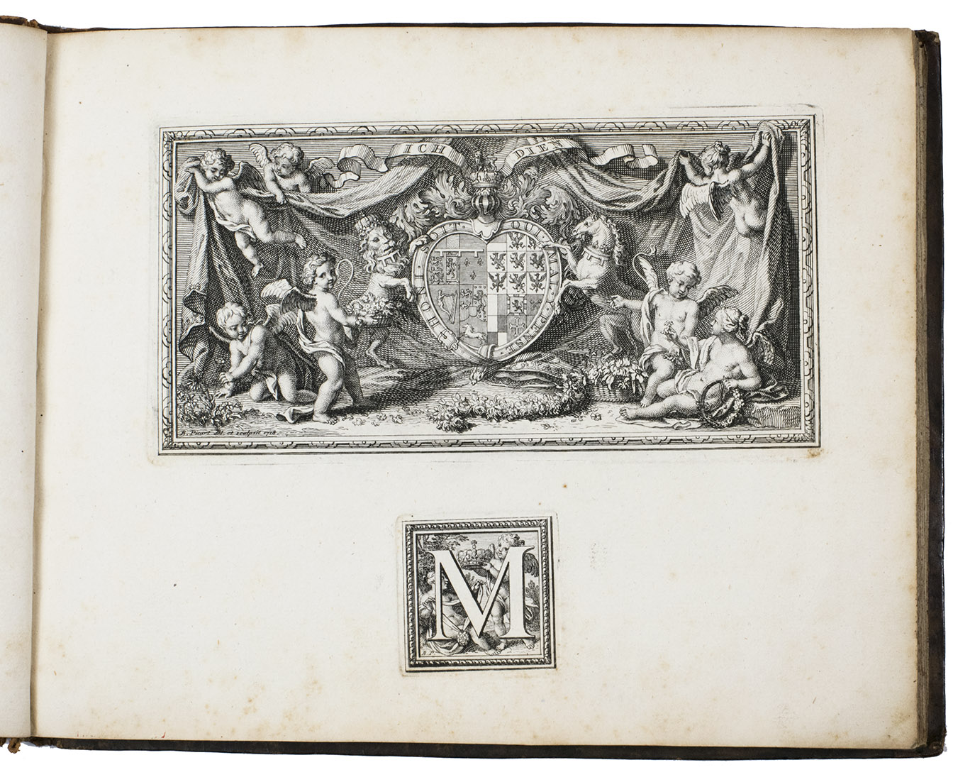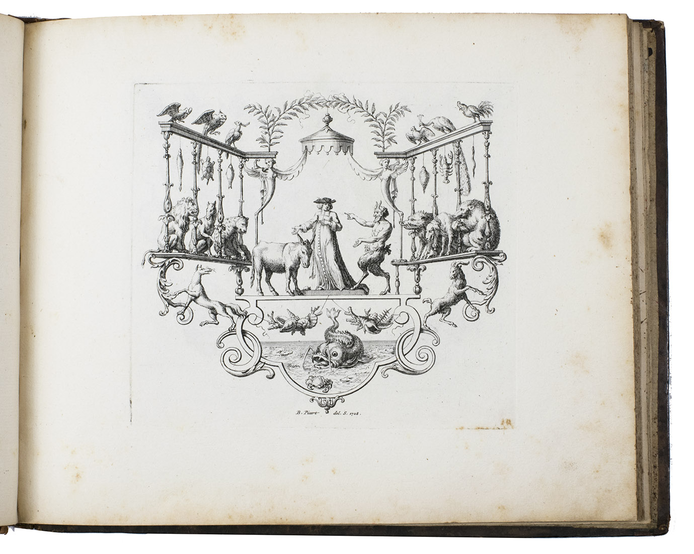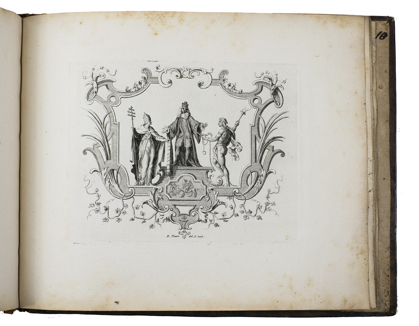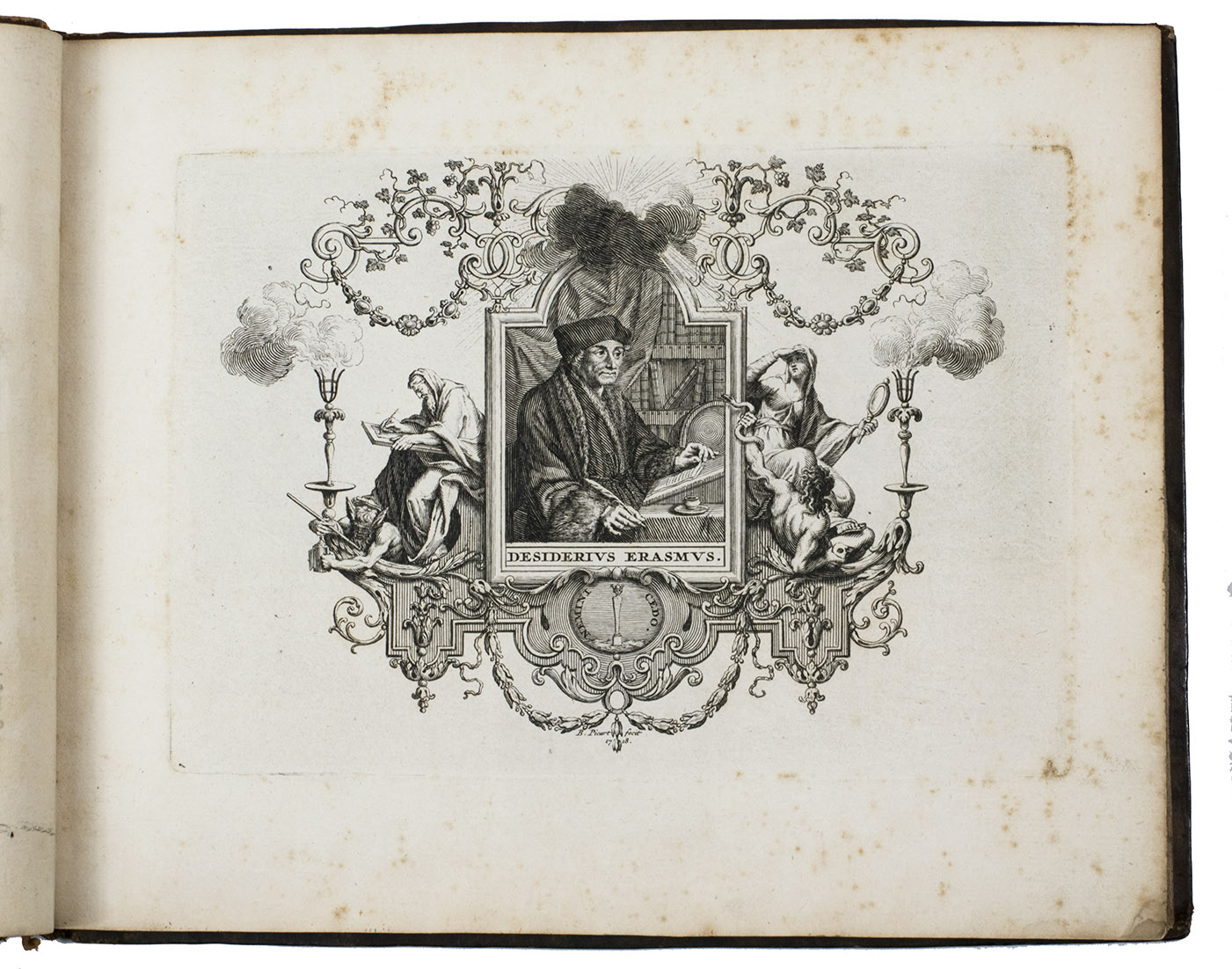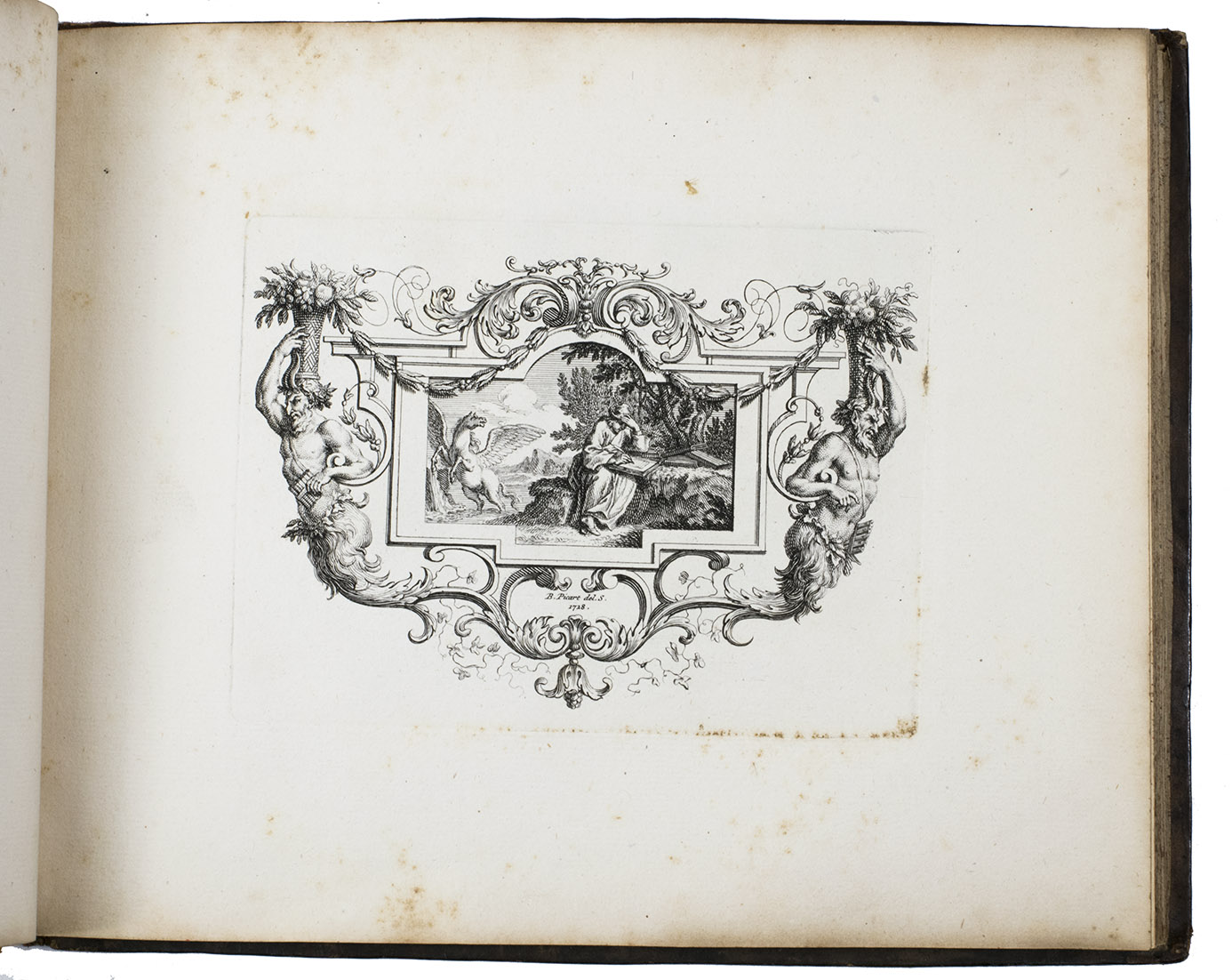 Very rare first and only edition of a collection of engraved vignettes by Bernard Picart (1673-1733) that were used as illustrations in the 1729 edition of Nicolas Boileau-Despréaux, Oeuvres, The Hague, Pierre Gosse & Jean Neaulme (Lewine, p. 73). For the present edition Picart engraved new plates with the same designs. The lavish vignettes are all signed and dated 1728 on the plate and include a portrait of Erasmus, the coat of arms of the Princess of Wales, the coat of arms of Grandmaster de Wignacourt, a portrait of Louis XIV of France, the coat of arms of Guillaume de Lamoignon (1617-1677) and theatrical and allegorical scenes. The first 8 text pages provide information about the scenes in the vignettes.