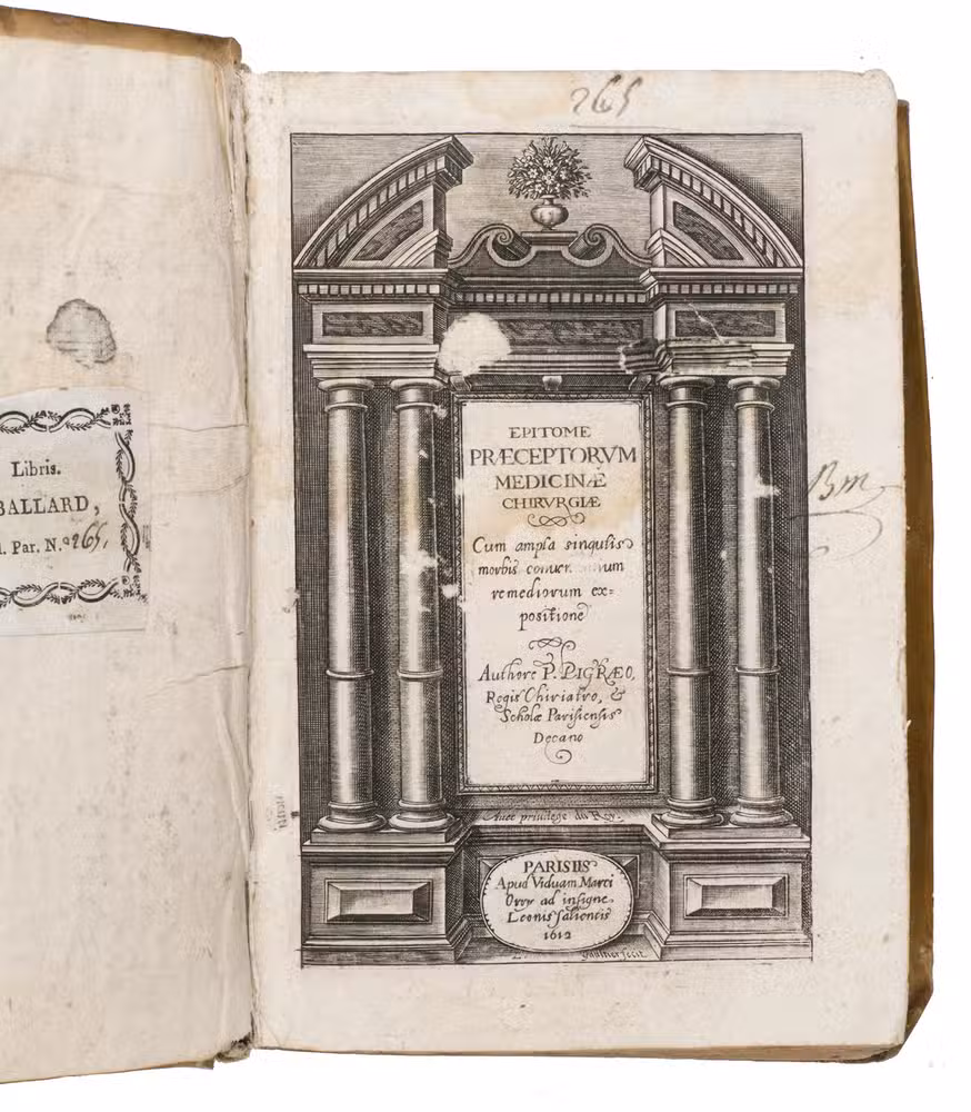 Rare first edition of a remarkable Latin medical manual by the French surgeon Pierre Pigray (ca. 1532-1613), also known as Petrus Pigraeus. Drawing on decades of practical experience and the teachings of his mentor, the well-known Ambroise Paré (1510-1590), Pigray offers a comprehensive guide to surgery, diseases, wounds, fractures, and other medical conditions.