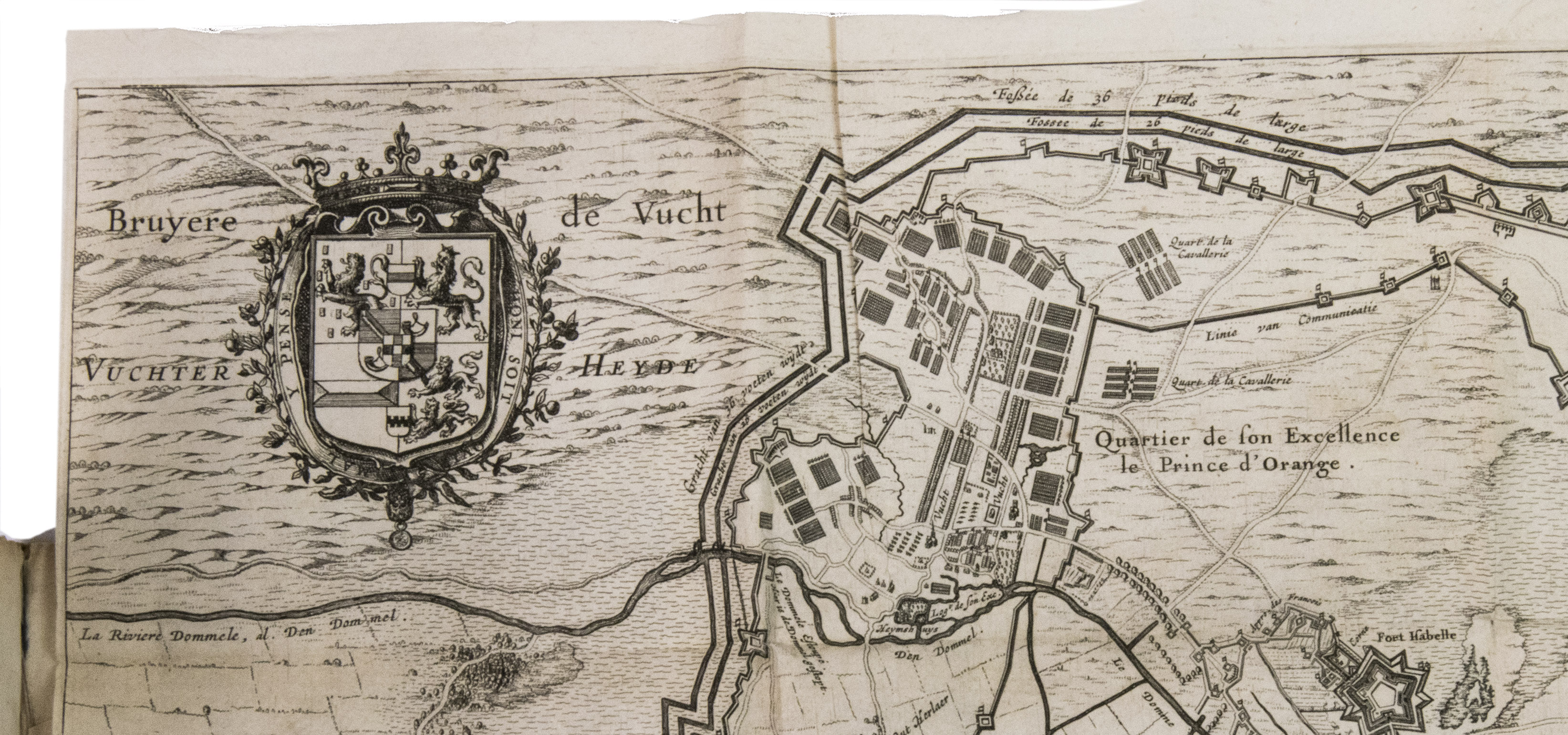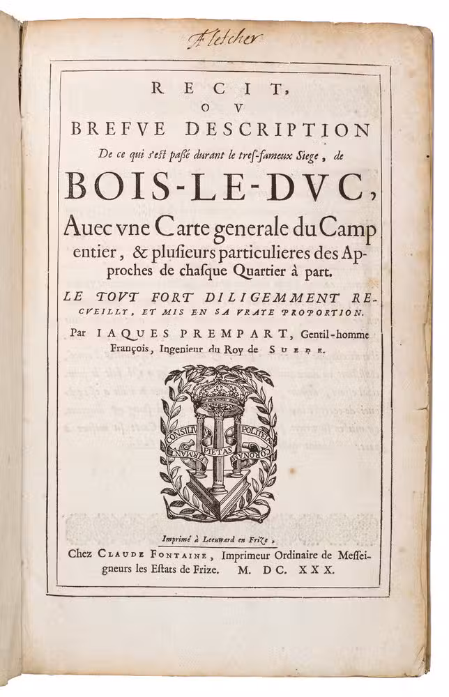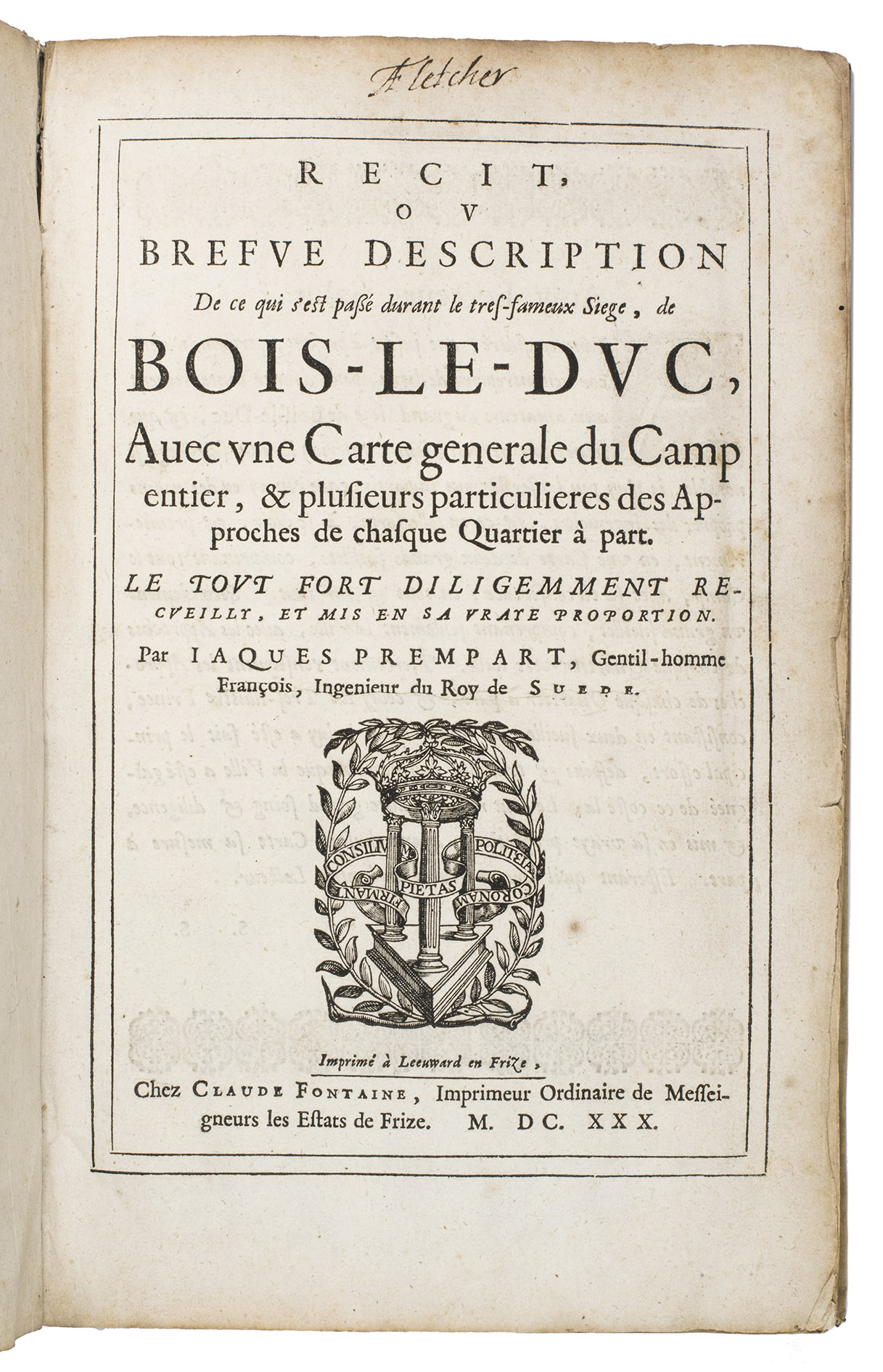 Very rare account of the famous siege of 's Hertogenbosch in North-Brabant in the summer of 1629, illustrated with large maps and plans. The city was in the hands of the Spanish, but the Dutch, commanded by Prince Frederik Henry of Orange, were able to capture it. The text presents a detailed account of the actions the besieging army, including the final victory and the taking of the city. Added are also the articles of surrender for the civil government of 's Hertogenbosch as well as for the military governor, Baron Van Grobbendonck, and his Spanish army. The present copy comes from the library of the Scottish writer and politician Andrew Fletcher of Saltoun (1655-1716).