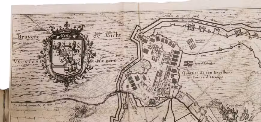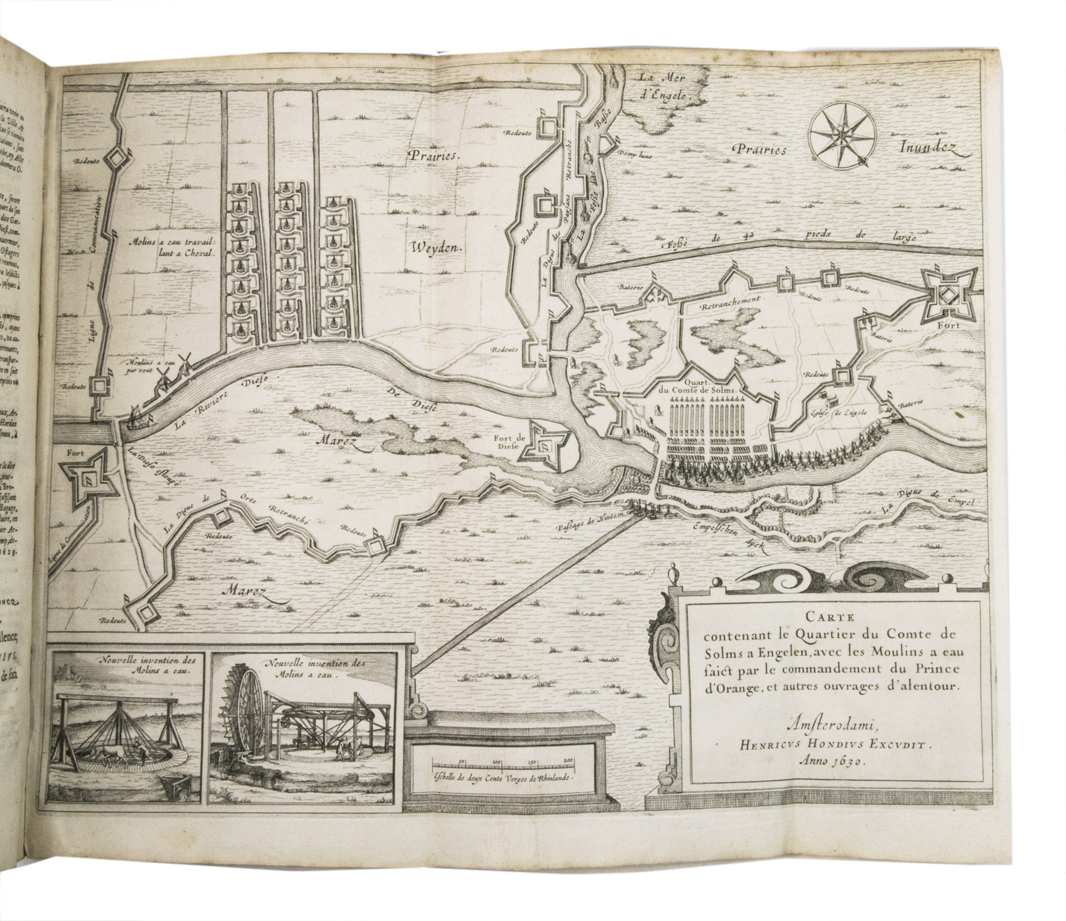 The detailed plans show the approach of the city from different directions by the Dutch army. These approaches were respectively conducted under the command of Prince Frederick Henry of Orange, Count Ernest Casimir of Nassau, Count Willem of Nassau, Baron Van Brederode, and Pinsen, the Governor of Rees. The siege was very challenging due to the swamps surrounding the city, but Frederick Henry was able to drain them. The last of the plans shows the camp of the Count of Solms and the water-mills which were used for this, the working of which is demonstrated on two insets. All the plates were drawn by the author, Jacques Prempart (dates unknown), who was a military engineer, and engraved by Henricus Hondius II (1597-1651).