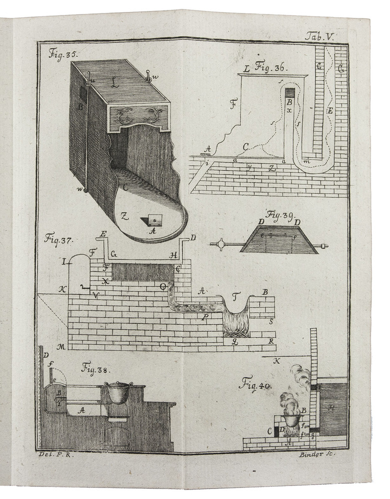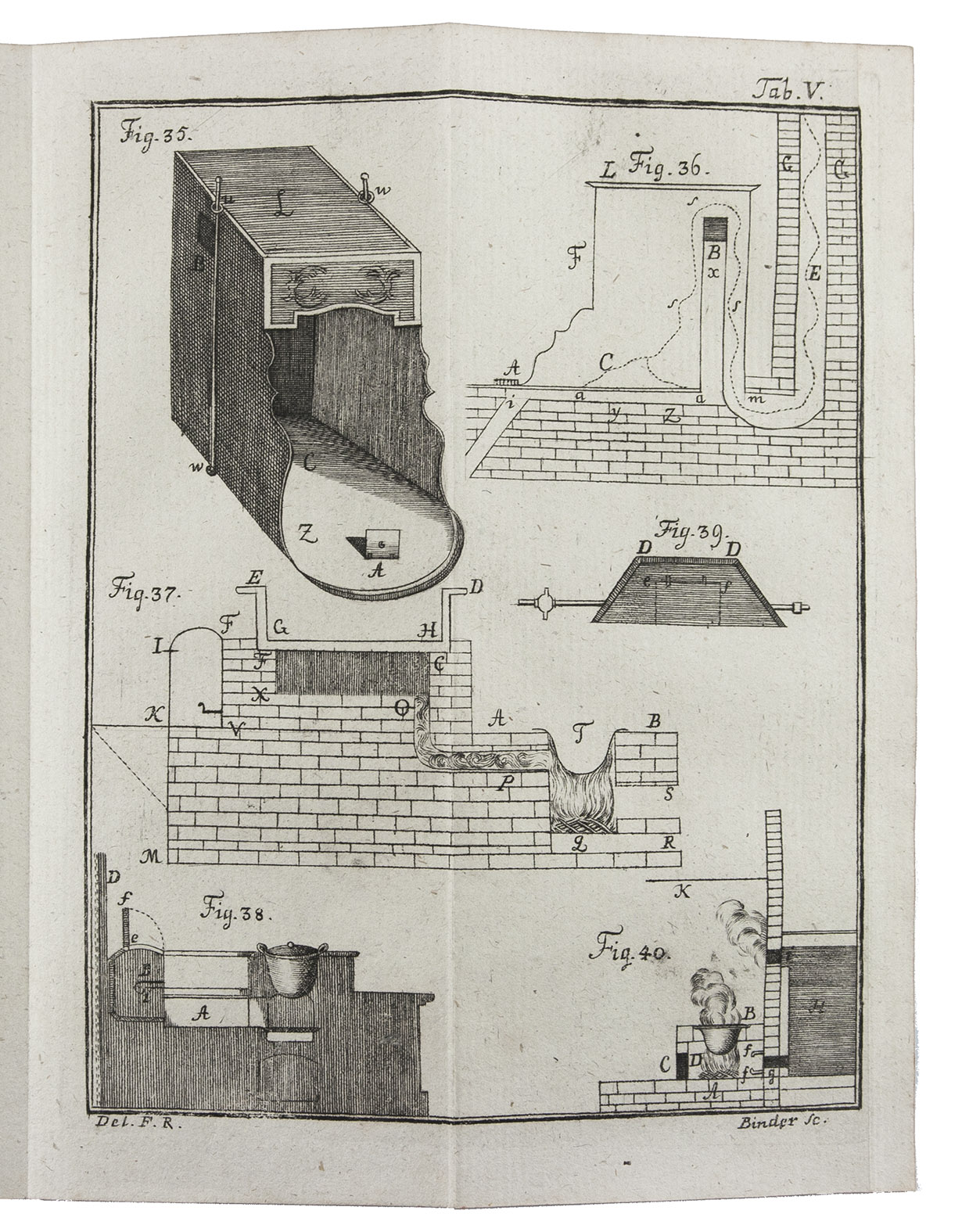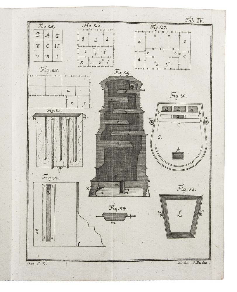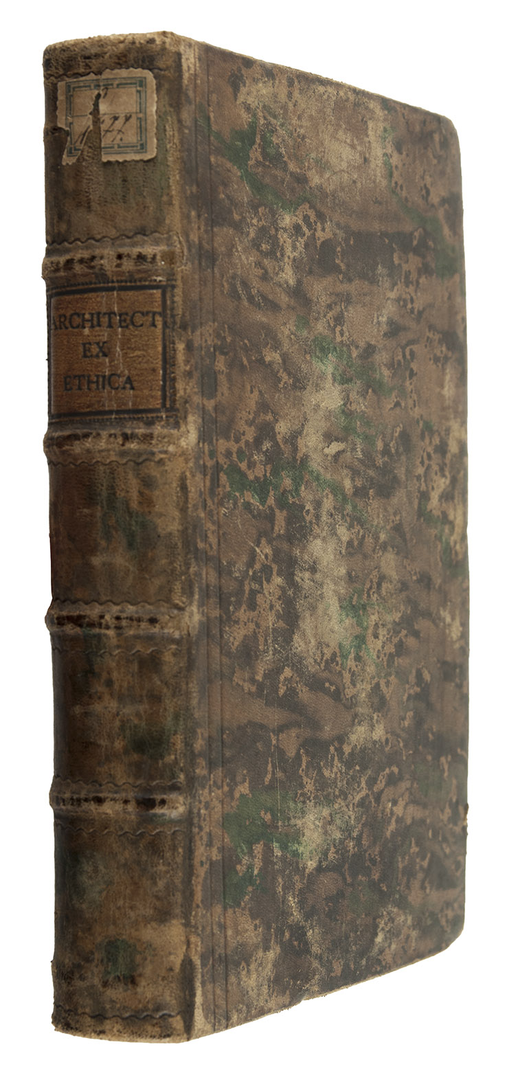 Budapest, Typis Regiae Universitatis, 1779. 2 works in 1 volume. 8vo. With 76 architectural illustrations and figures on 11 folding engraved plates. With: BAUMEISTER, Friedrich Christian. Philosophiae moralis institutiones ius naturae, ethicam, et politicam complexae.