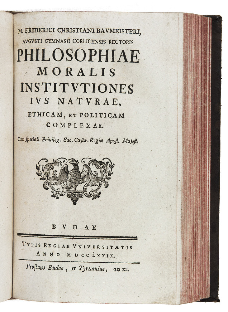 The second work is a Budapest University imprint of one of the popular text books on philosophy by the Rector of the Latin School at Görlitz in Germany, Friedrich Christian Baumeister (1709-1785), a follower of the German Philosophical School of Wolf.