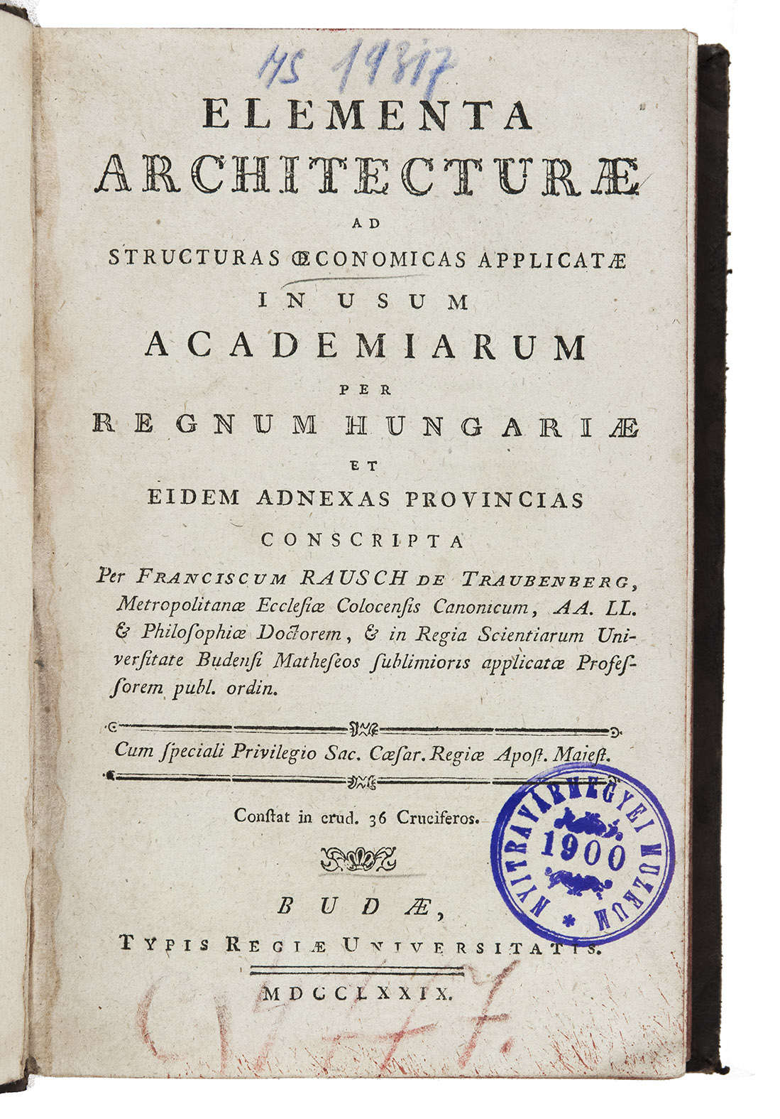 Two rare text books published by and for the University of Budapest in Hungary. The first is an original edition of a practical manual on contemporary architecture, by the German professor in Mathematics at the University of Budapest, Franz Rausch von Traubenberg (1743-1816). "This was probably the first original architectural book to be published in Hungary. [...] the text is intended to be of practical use to builders and architects and is divided in three sections. The first deals with building materials and theory, the second discusses the design, erection and heating of inexpensive domestic and rural buildings, and the third describes methods of calculating the proportions of rooms and buildings, measuring materials and estimating costs" (BAL). A second edition appeared in 1799. The work is of particular interest for the views on economic architecture in Hungary in the 18th century.