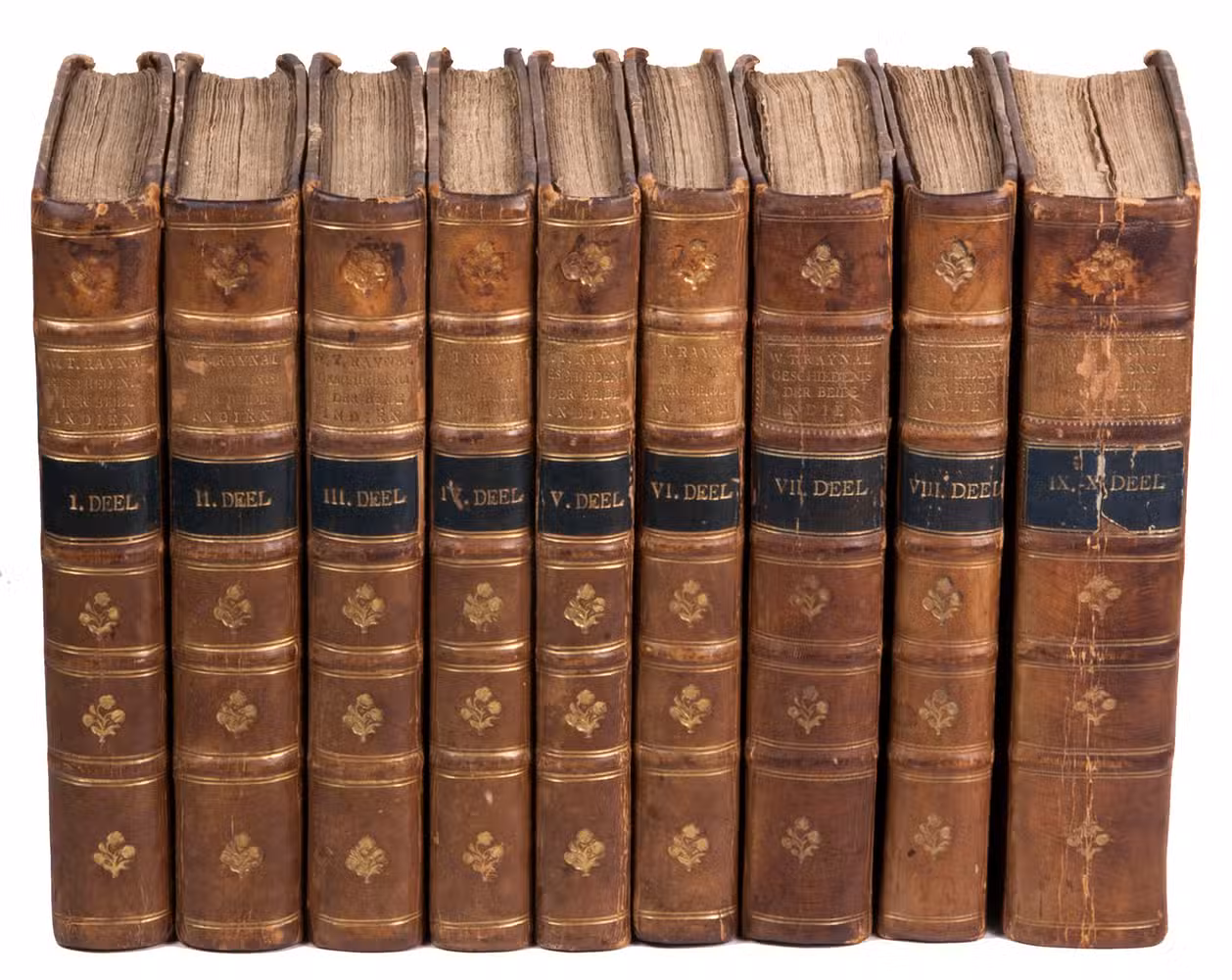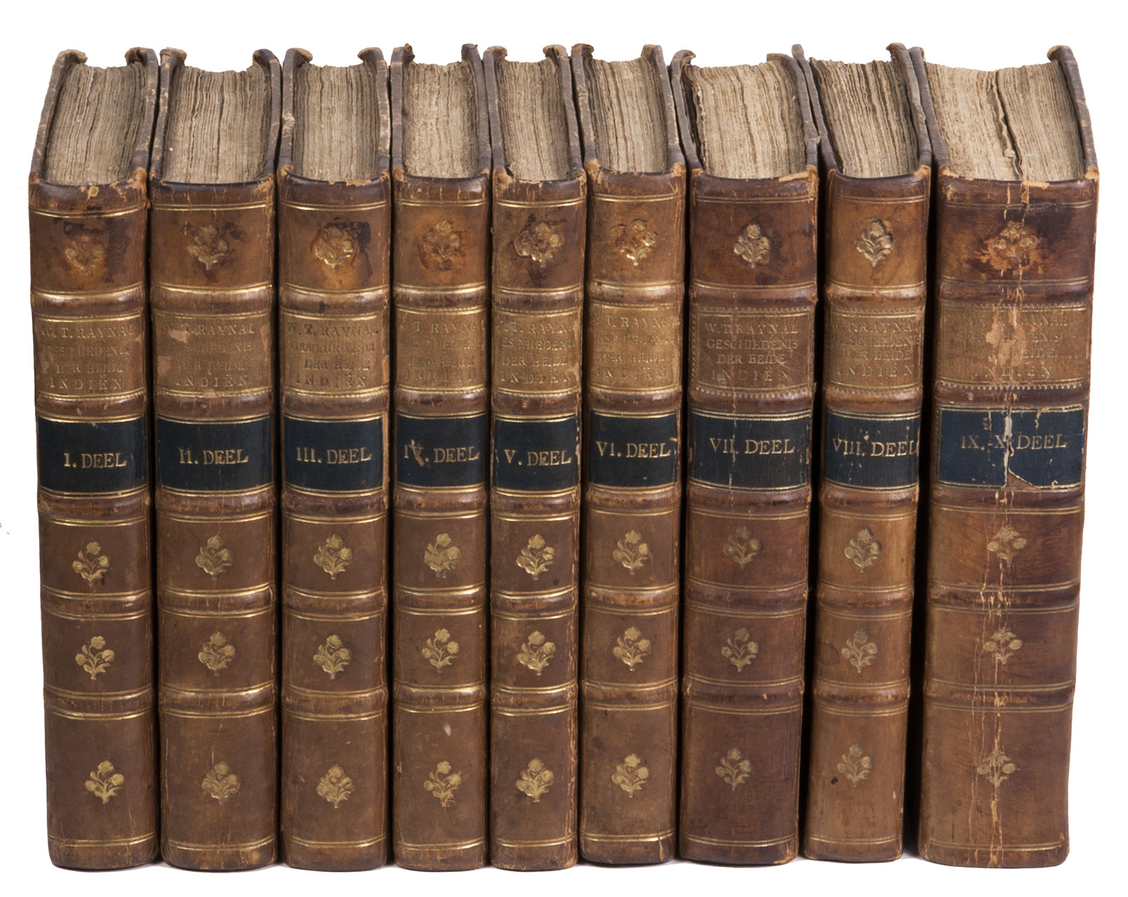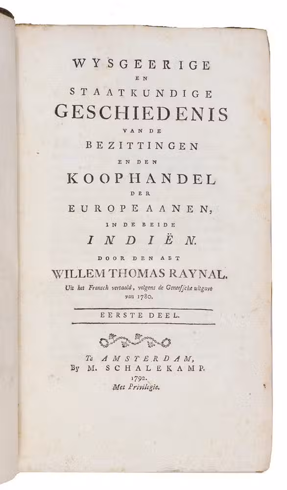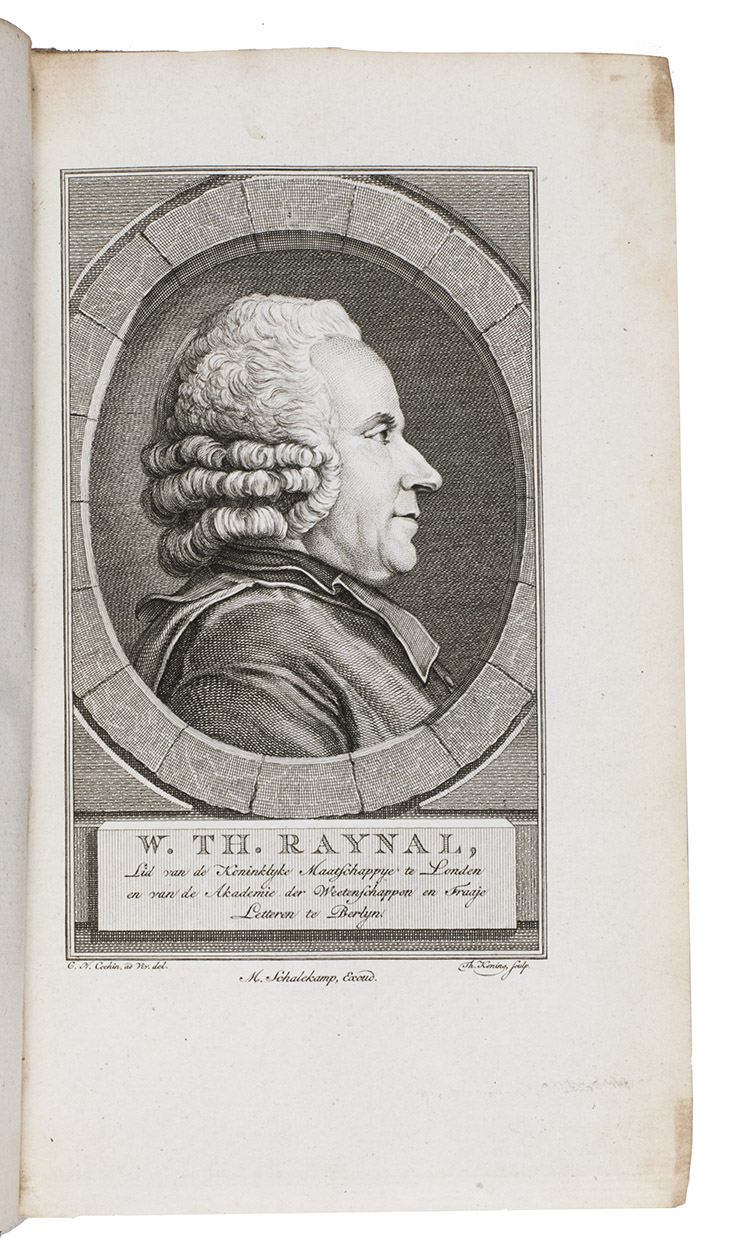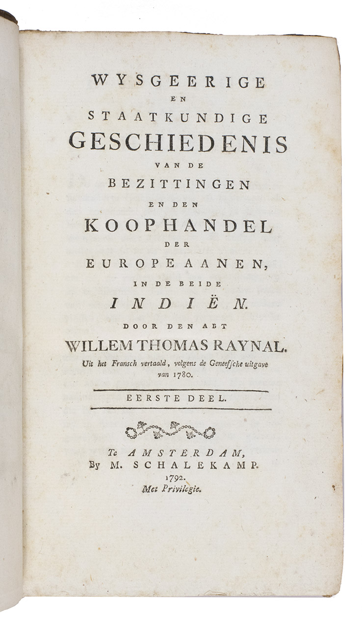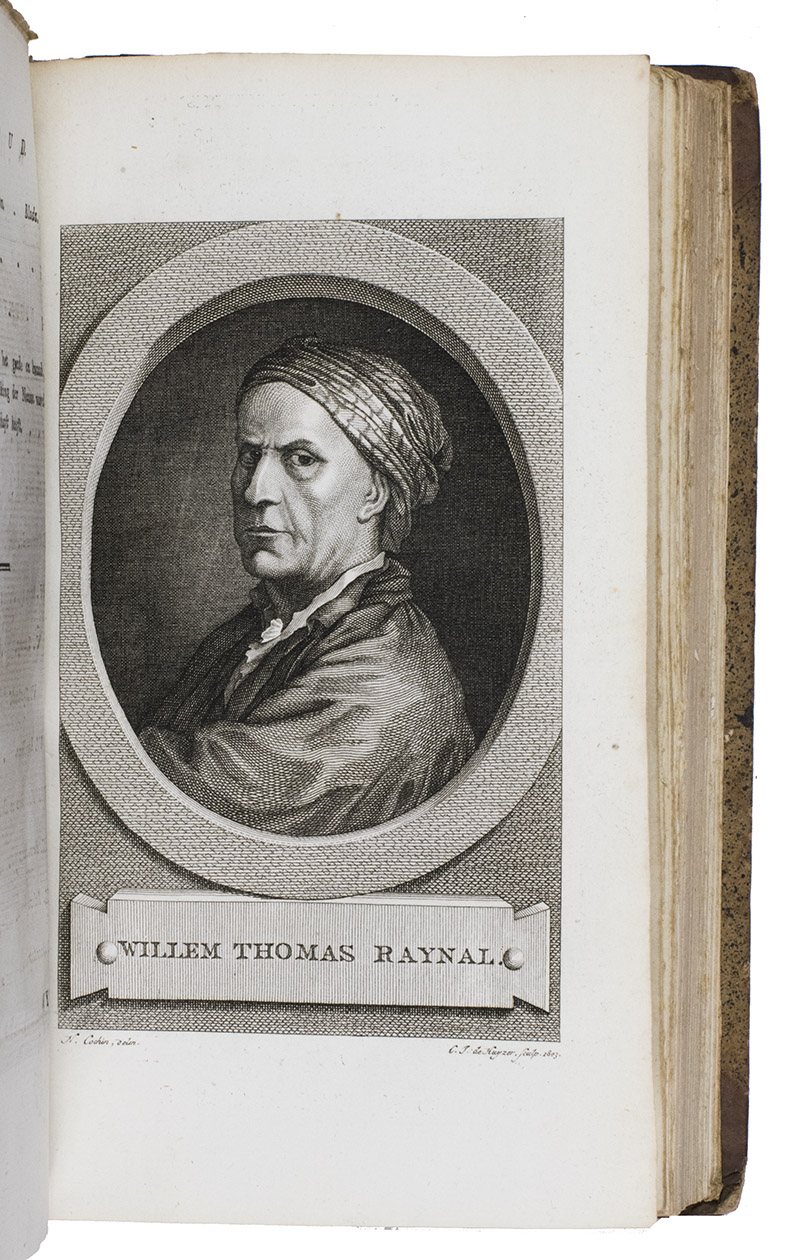 Second copy located, of the second edition of the Dutch translation of an extensive and widely published radical critique of European overseas expansion, written by the French author Guillaume Thomas François Raynal (1713-1796) in collaboration with figures associated with the Encyclopédie, above all the famous French philosopher Denis Diderot (1713-1784). The contents are partly based on travel accounts and data gathered from an unprecedented number of government documents, furnished by a network of officials and informants in all the colonial powers.
