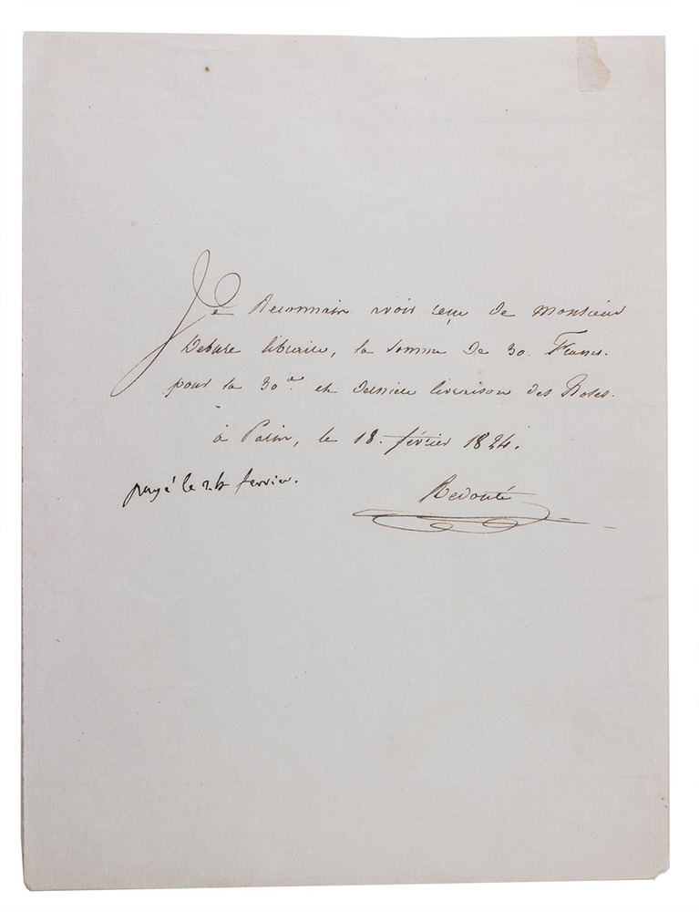 A signed autograph letter by Pierre-Joseph Redouté, acknowledging his reciept of 30 francs from "Monsieur Debure libraire" for the 30th and final part of Les Roses, Redouté's most famous work, which was published in installments between 1817 and 1824. This must be the Paris bookseller Jean-Jacques Debure (1765-1853) or his younger brother Marie-Jacques Debure (1767-1847), who were "libraires du Roi et de la Bibliotheque du Roi" from 1821 to 1830. The book was printed and published by Firmin Didot. Oddly, an addition by a different hand below left notes "payé le 26 fevrier" (paid 26 February). Perhaps Redouté is writing to Firmin Didot and he was to reimburse Debure for this expense. It in any case suggests that Debure is not merely buying copies of the book to sell but was involved in the publication of Redouté's Les Roses in some manner.