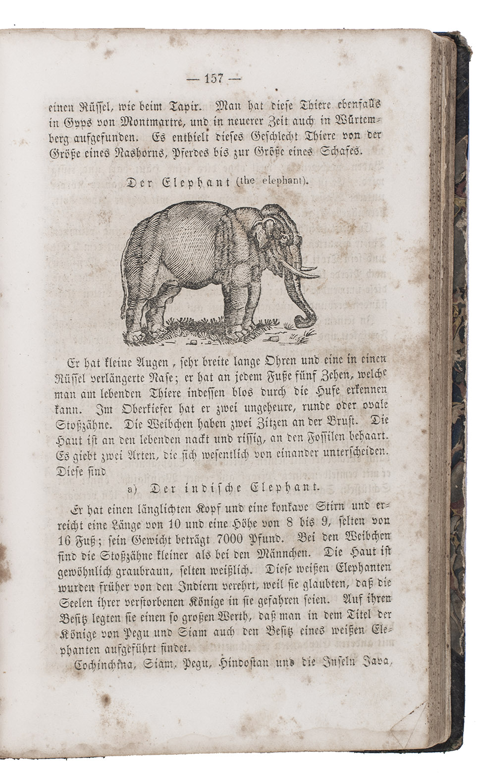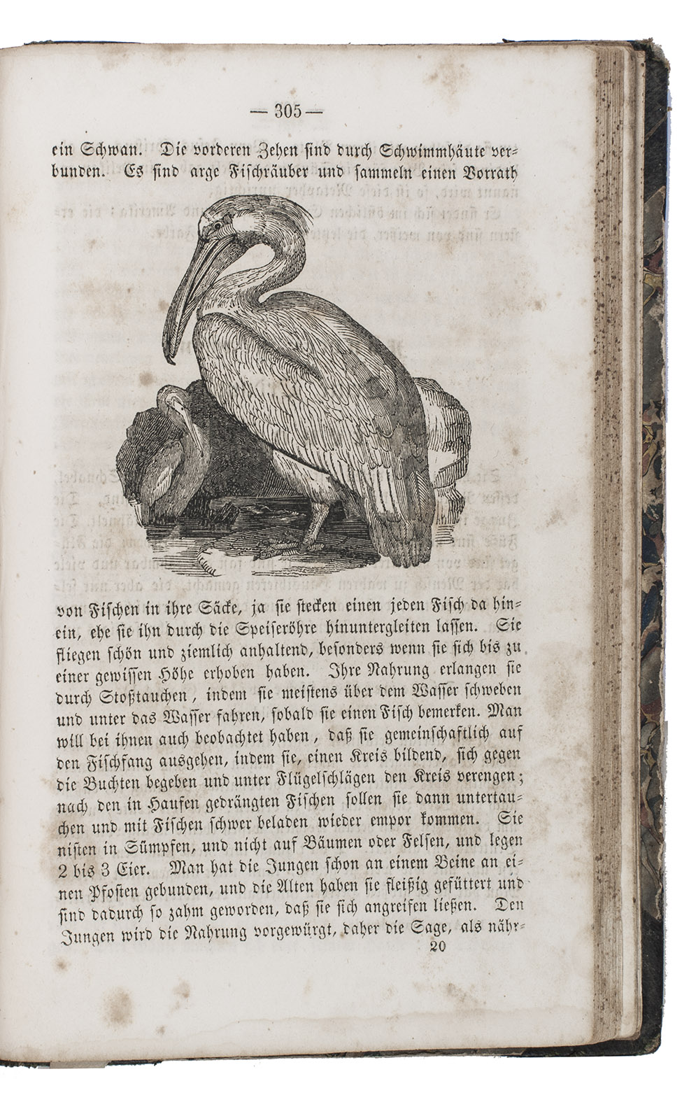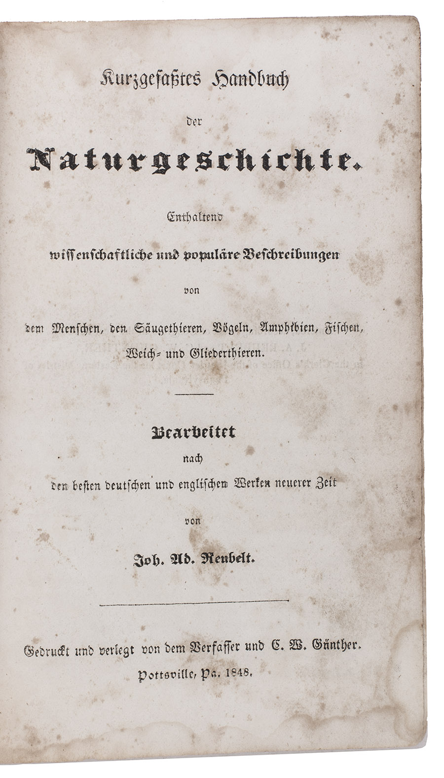 First and only edition of a zoology textbook written for the German youth in Pennsylvania. The author, John Adam Reubelt (1819-1902), was concerned by the absence of an up-to-date introduction in zoology in German, thus he compiled the present work based on new English and German studies. The Kurzgefaßtes Handbuch deals with man, mammals, birds, amphibians, fish, vertebrate and invertrebrate animals, of which some are depicted in the numerous woodcuts.