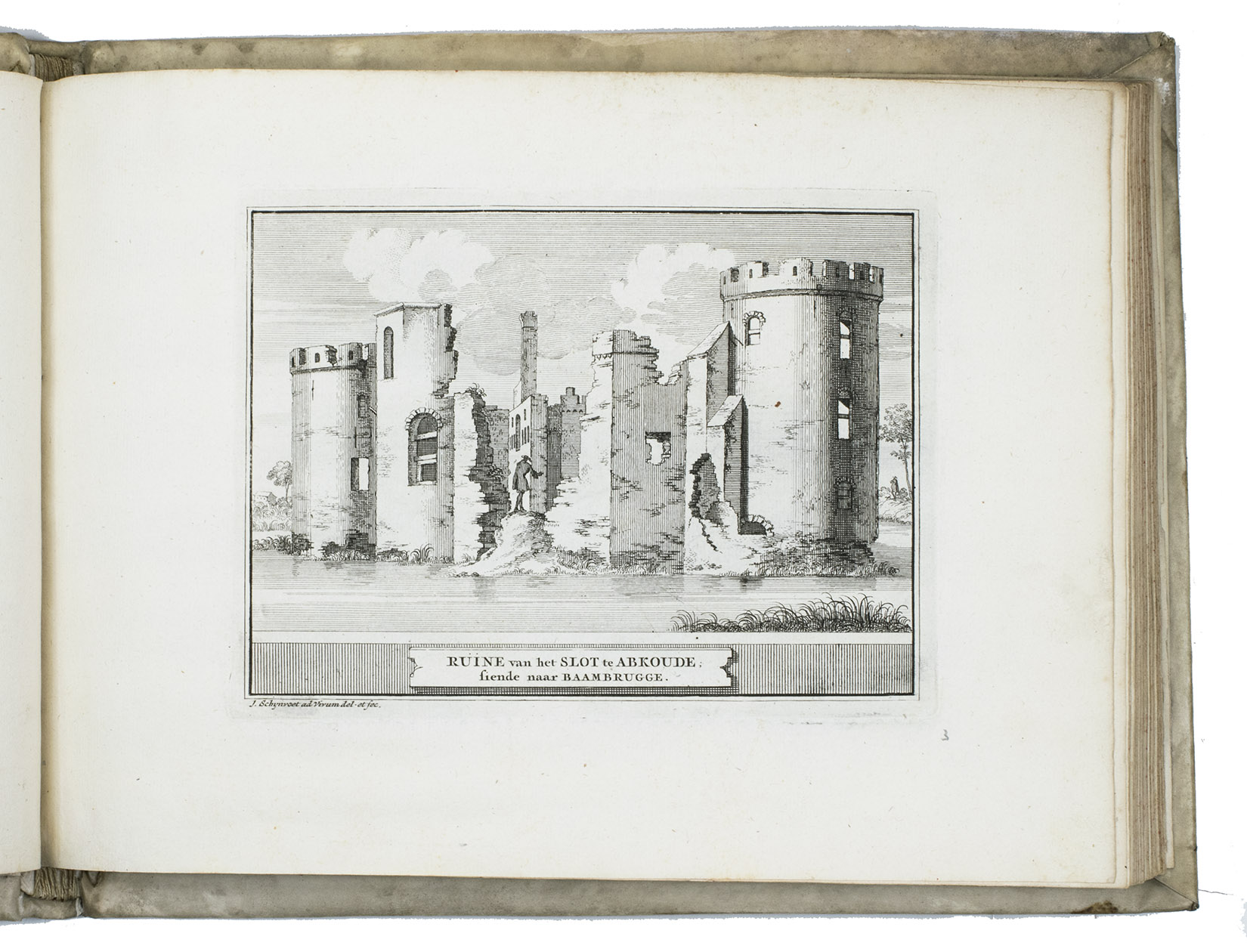 Very rare second separate edition of a series of sixty views of ruins, castles and noble residences, drawn mostly by Roeland Roghman (Rochman), engraved by Jacob Schynvoet and first published in 1711. Most are in the province of Holland, but some come from other parts of the Netherlands. Each view has a panel at the foot with the title, often on a scroll or drapery. Schynvoet signed most with only his initials, but one that he drew himself he signed, "J. Schynvoet ad Vivum del. et fec." One caption indicates that the building no longer existed when the plate was engraved. The views are bound in alphabetical order by the name of the house or the place where it is located, as indicated by the list of plates, but fifteen of the views are lettered A-P at lower right, indicating a different order.