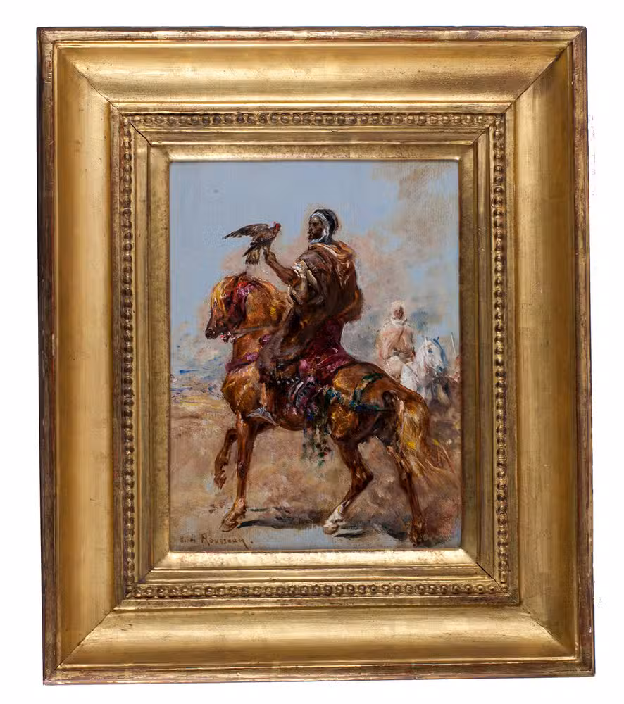 Colourful panel painting by the leading orientalist painter Henri-Émilien Rousseau of a mounted Bedouin falconer, one of Rousseau's favourite subjects. While the sport of falconry was an important status symbol in the Middle East and Europe generally, for the Bedouins it was a means of survival.