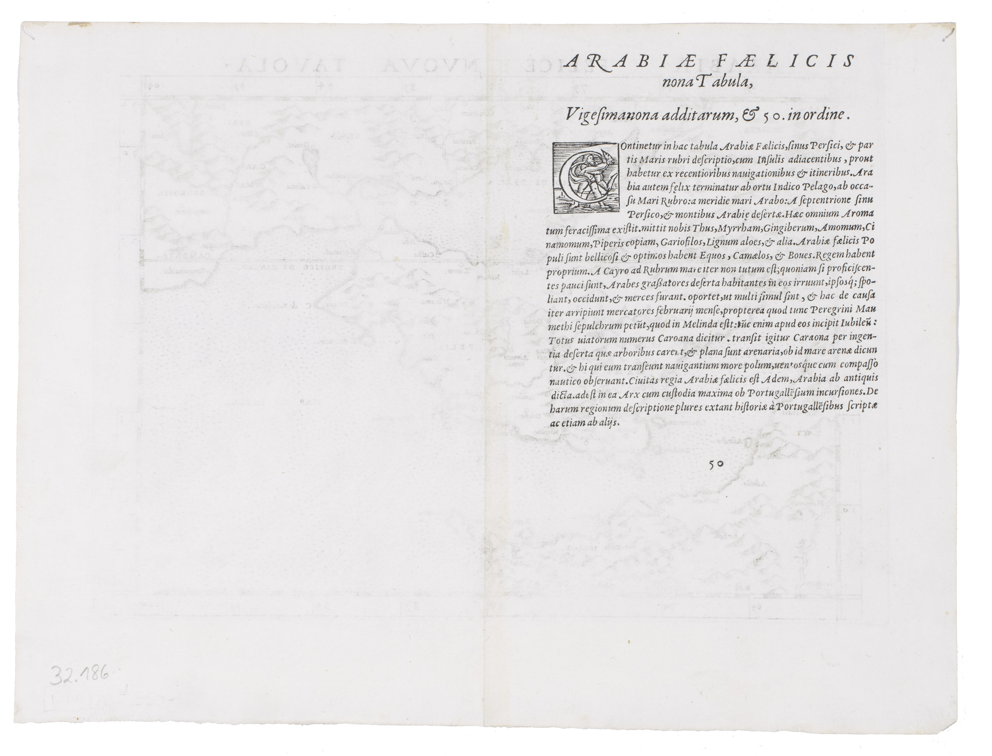Ruscelli's modern map of Arabia from his La Geographi di Claudio Tolomeo. A feature of this first state is that no map has a platemark at top: two maps were engraved on the same plate and the resulting sheet halved. Tibbetts 27.