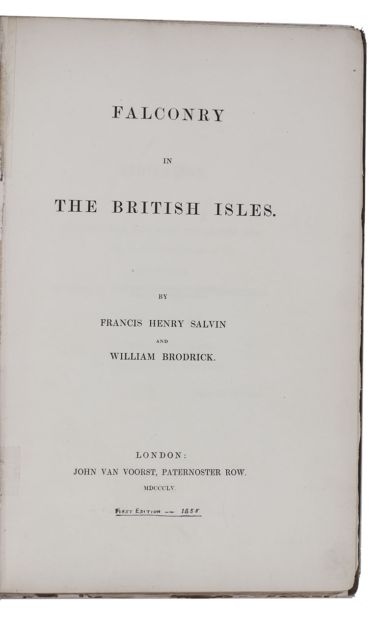 First edition of a complete and important treatise on the art of falconry by Francis Henry Salvin (1817-1904), in which he describes the various species of birds used in England, both hawks and falcons. ''The best English book on falconry and a very attractive publication'' (Schwerdt). The treatise is illustrated with lithographs by William Brodrick (1814-1888); they show 21 falcons and 5 hawks; plates 22-24 depict equipment used for falconry. The stones for the first edition were destroyed after publication so the plates for the second edition (London, 1873) had to be redrawn.
