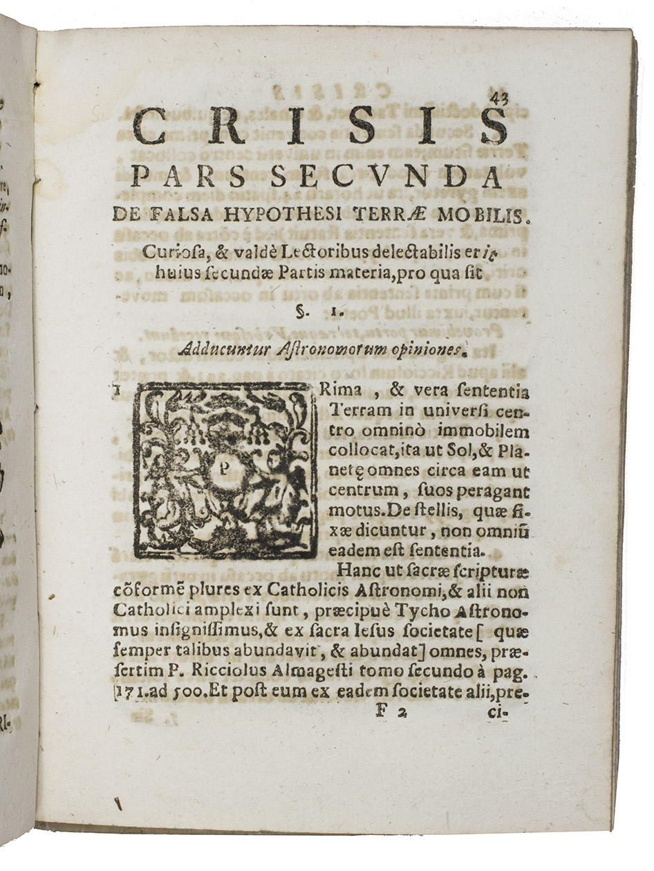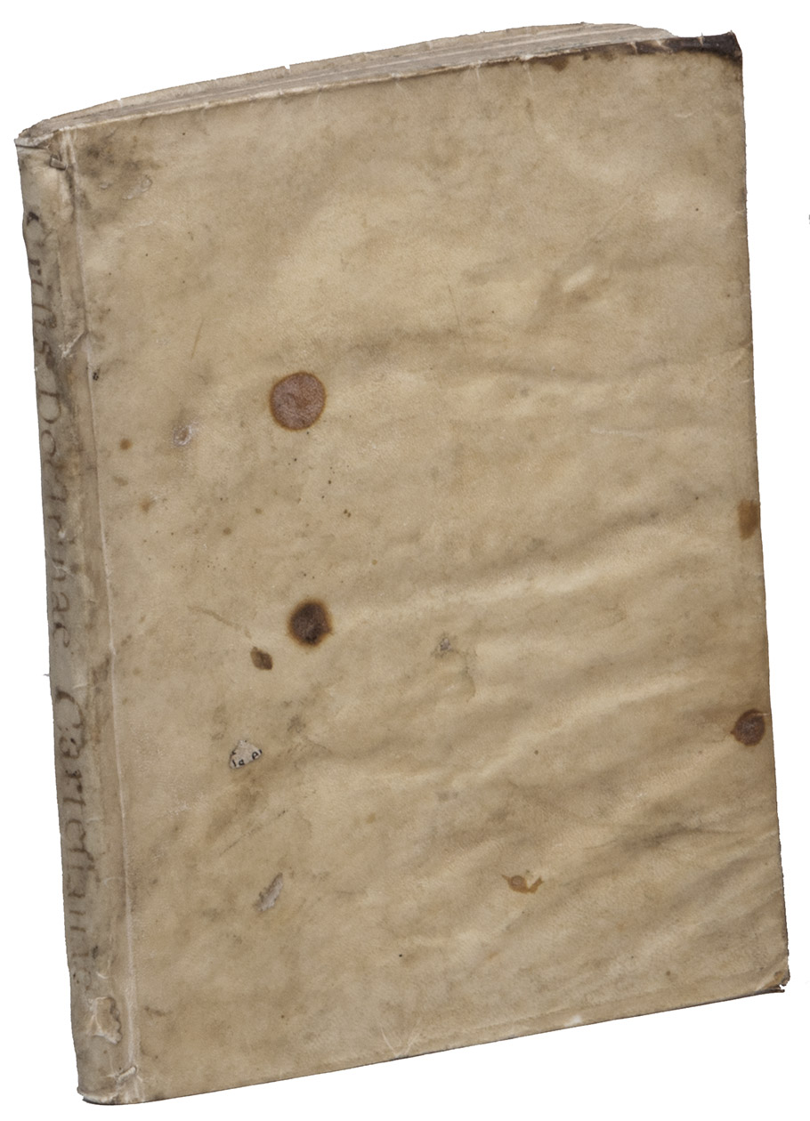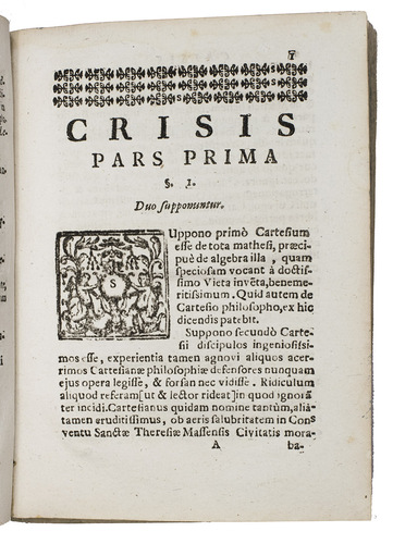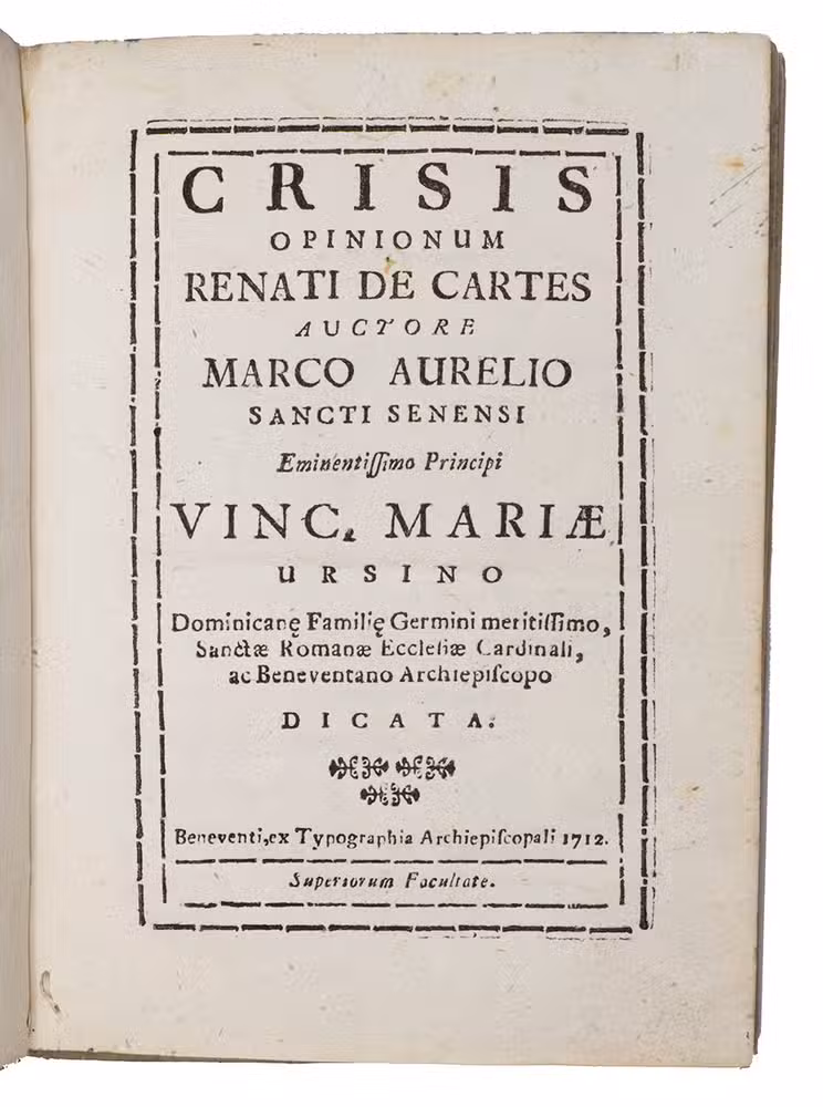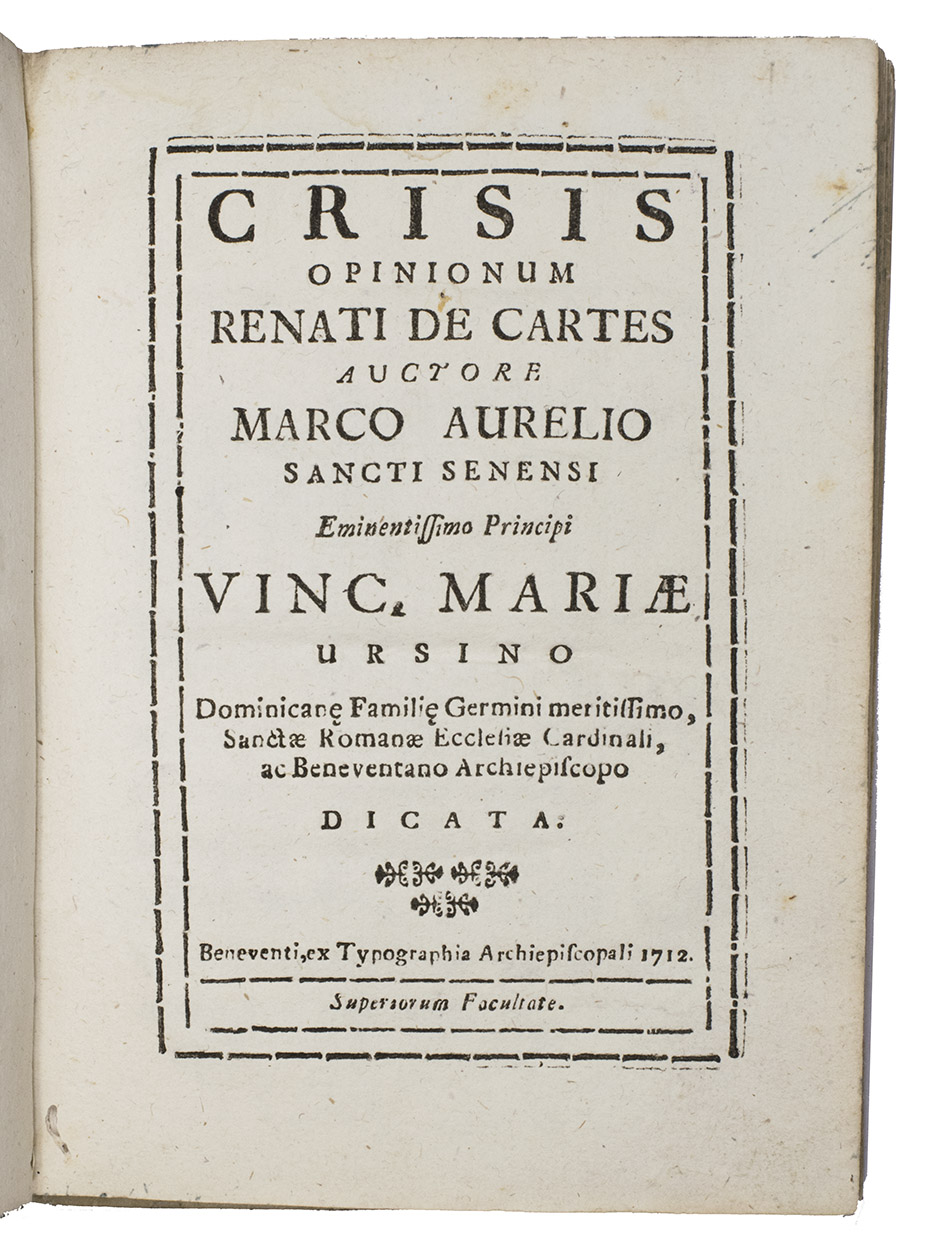 First and only edition of a very rare essay on the philosophical and scientific theses of René Descartes (1596-1650) by Marco Antonio Sancti (dates unknown) from Siena, who lived in Benevento at the time. After the half-title and title-page follow the authors dedication to Cardinal Vincentio Maria Ursino, archbishop of Benevento, "Ad lectorem", two imprimaturs, dated 1 & 4 February 1712 respectively, and the "Praeambula". The text is divided into two parts, but they share a single series of page numbers (1-63) with a drop-title for the second part on F2 (p. 43), so they were never issued separately. The work ends with indices and errata.