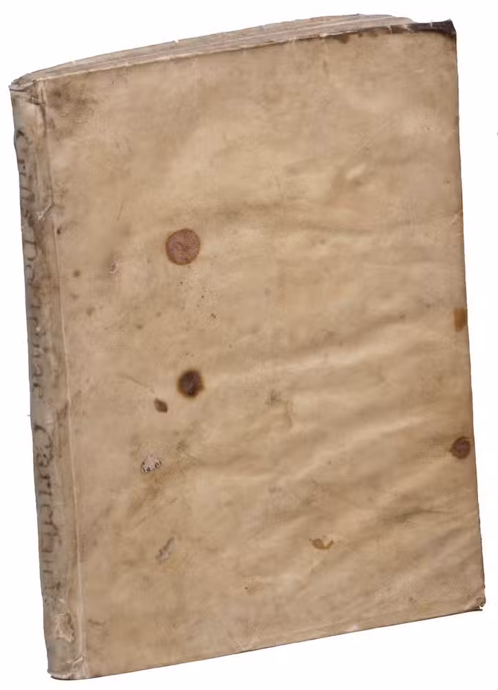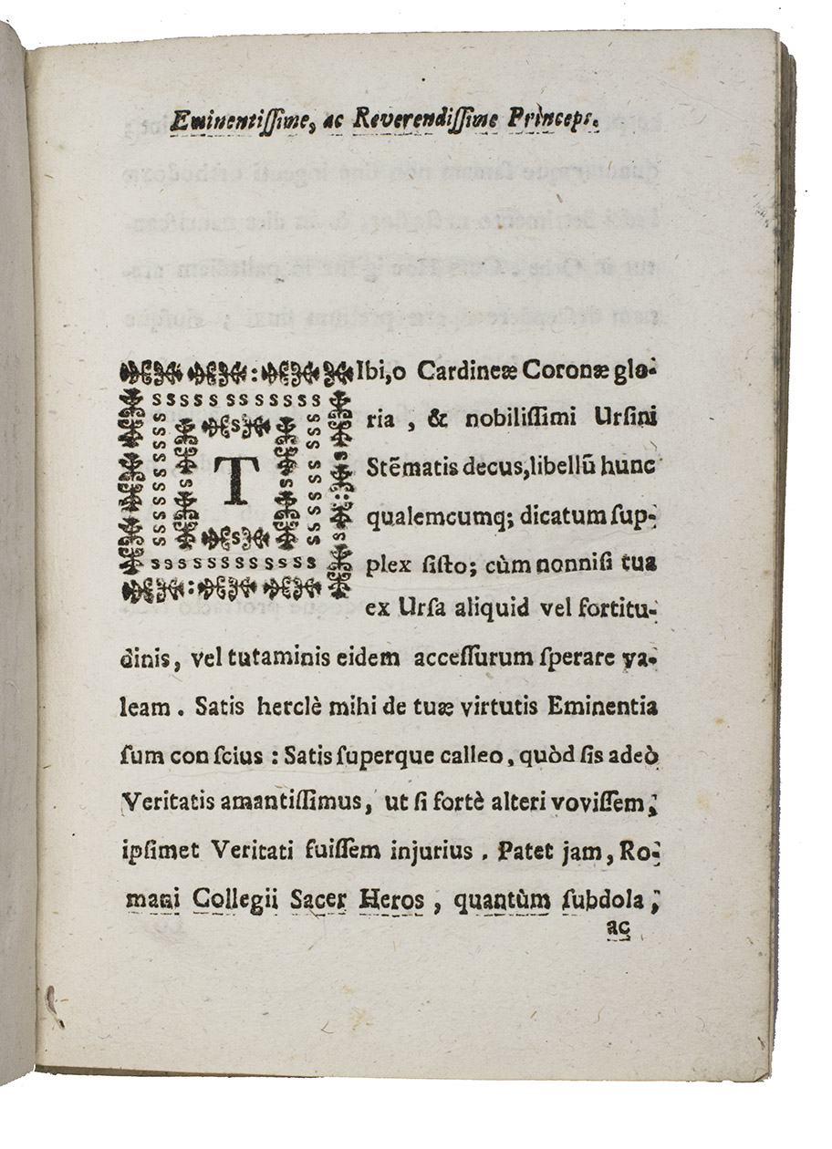 Benevento, Typographia Archiepiscopali, 1712. 4to. With the title in a double-line frame built up from short rules, a woodcut tailpiece, a factotum (plus one repeat with a different letter), and a factotum and other decorations built up of typographical ornaments. Contemporary limp vellum with the manuscript title on the spine, blue marbled edges. [12], 63, [5] pp.