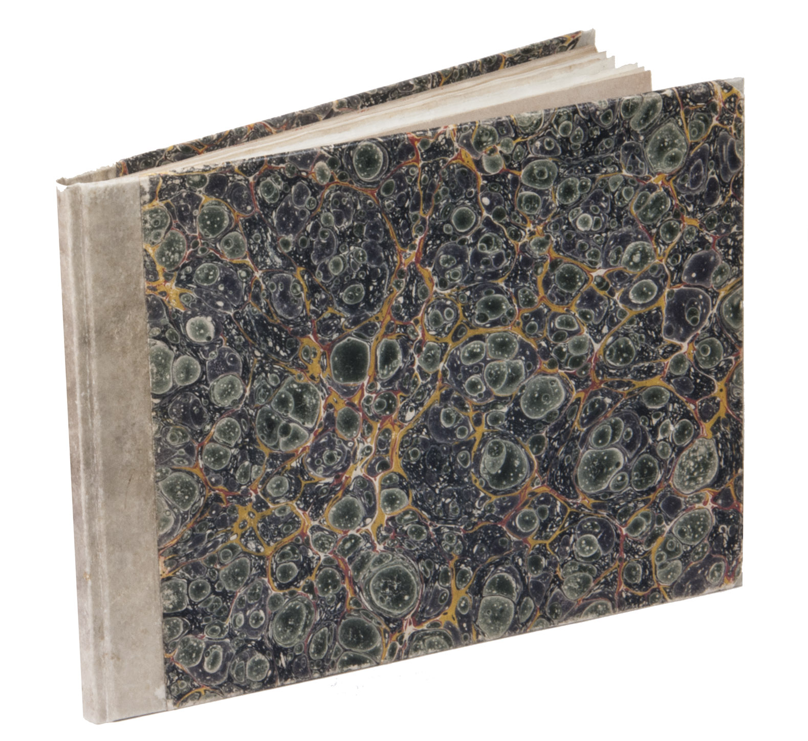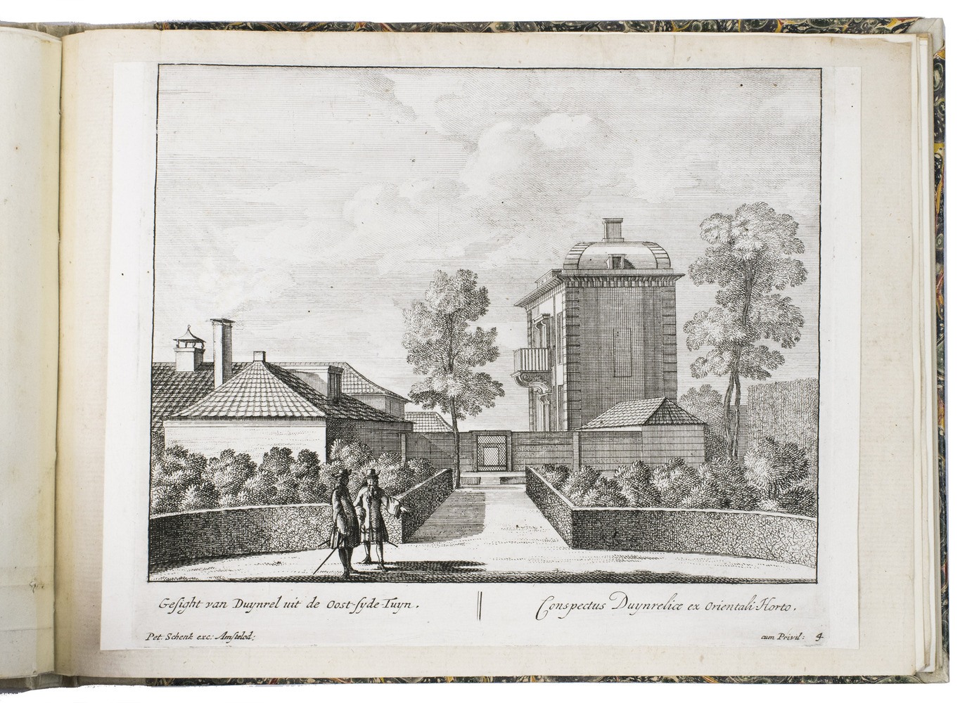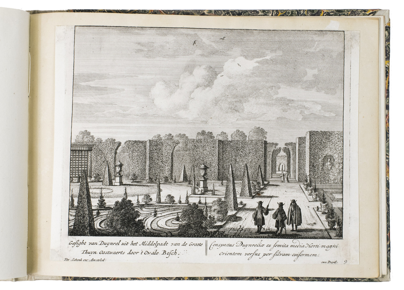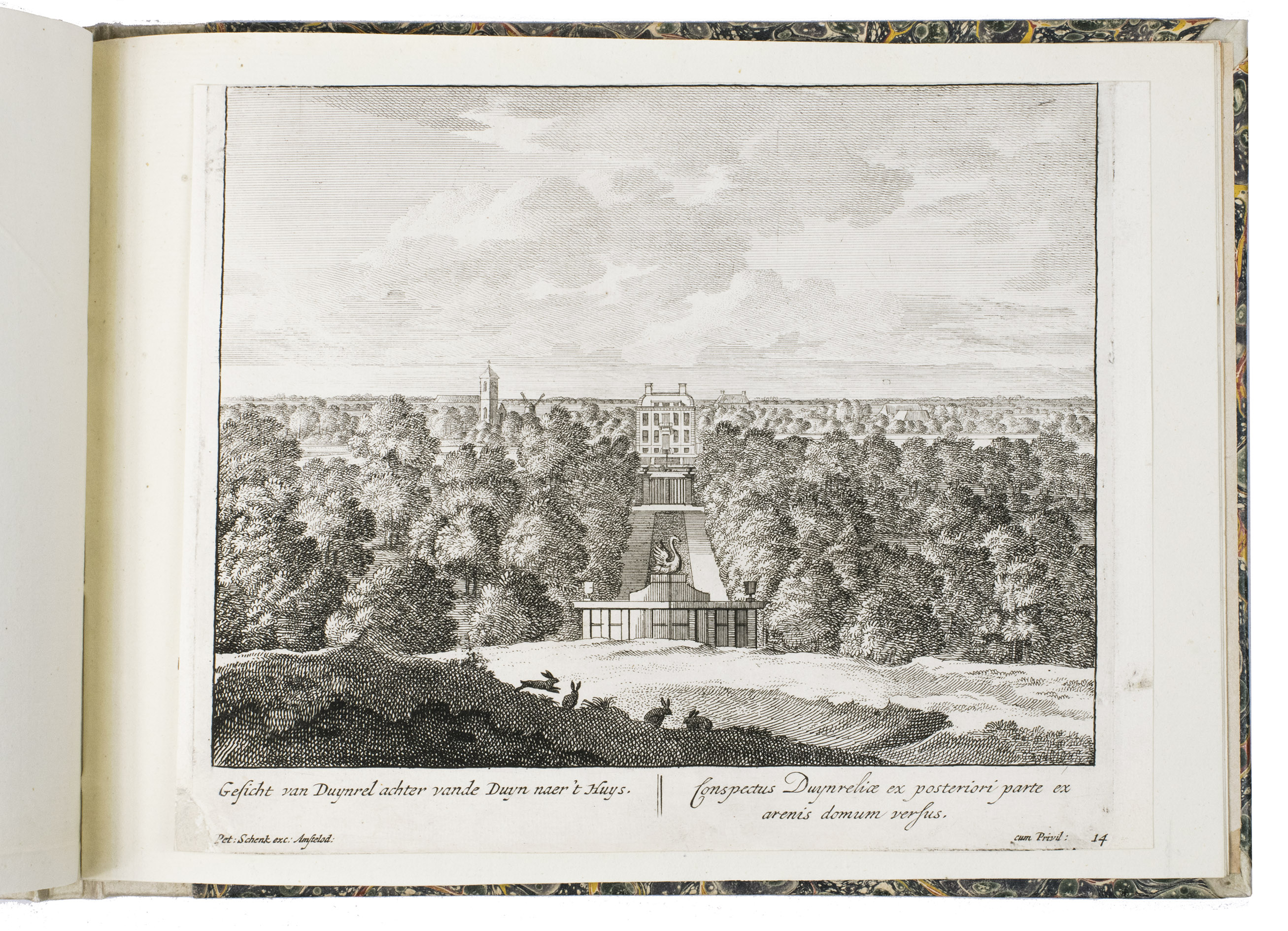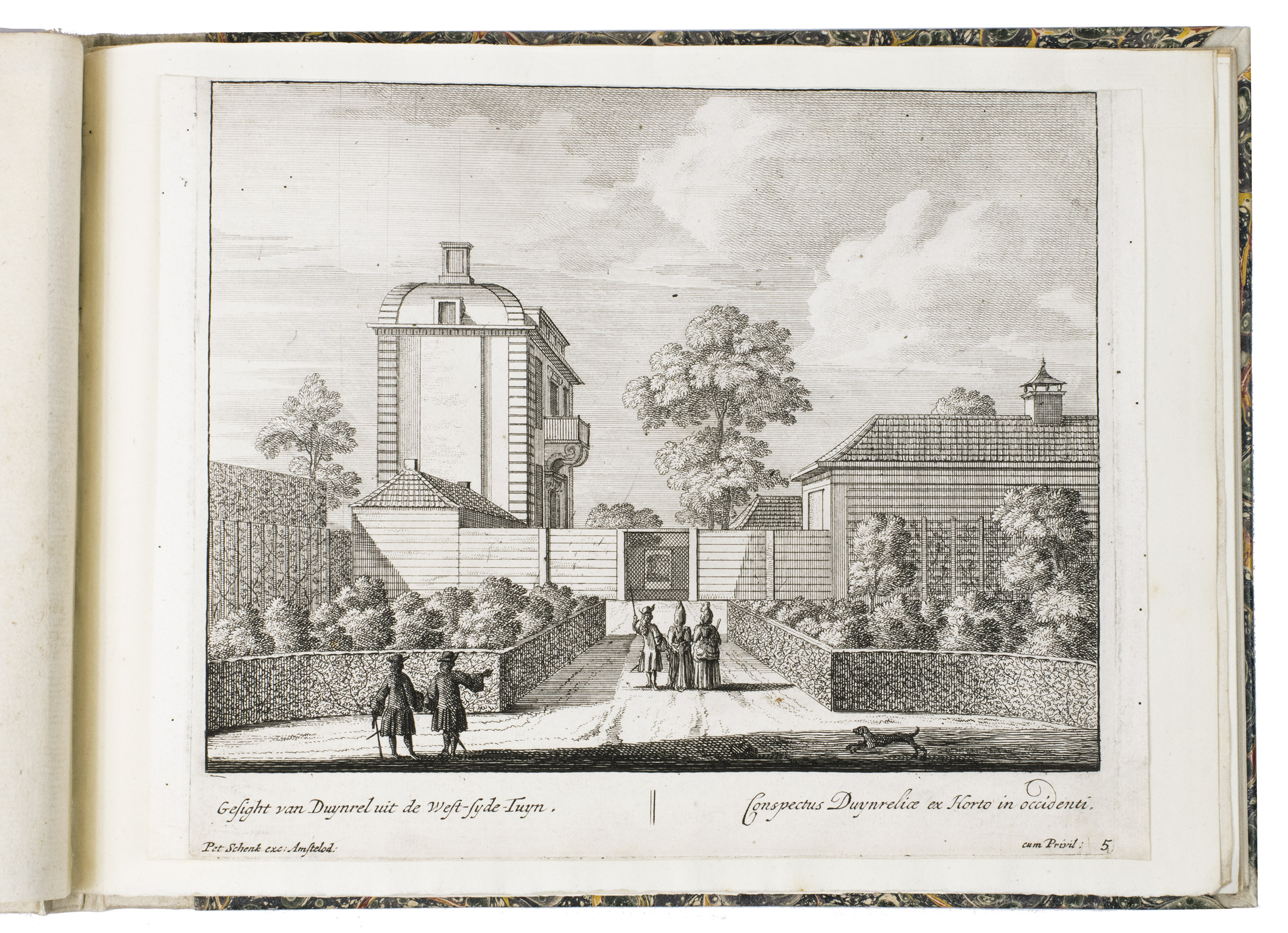 [Amsterdam, Pieter Schenk, 1702]. Oblong album (ca. 18.5 x 25.5 cm). With an engraved dedication, and 16 numbered engraved numbered views (ca. 170 x 205mm) of the manor house and gardens of Duinrel in Wassenaar, near The Hague. The 16 plates each show an engraved caption in Dutch and Latin beneath the view. The dedication leaf and the 16 views (each ca. 17 x 20.5 cm) are mounted (attached only at the top of each leaf) on blank leaves (ca. 18.5 x 25.5 cm). Later half vellum, marbled paper sides. [17] ll.