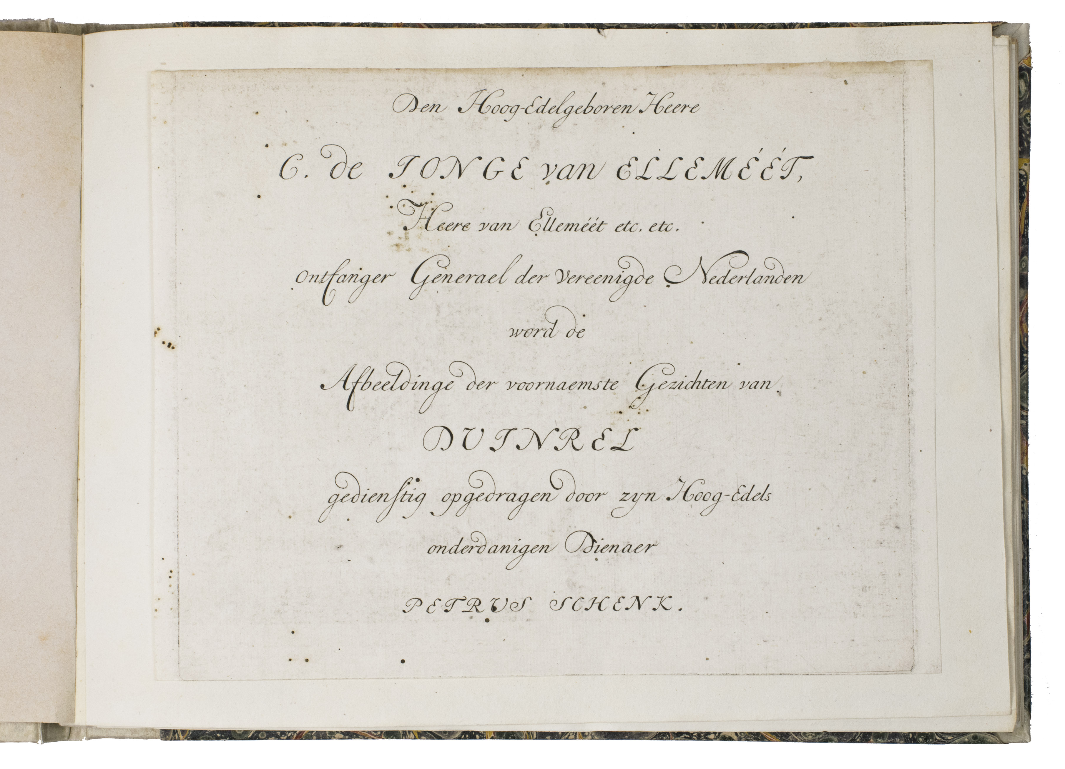 Beautiful complete print series with an engraved dedication leaf to the owner of the depicted estate, Mr. Cornelis de Jonge van Ellemeet (1646-1721). The 16 numbered engraved plates show the beautiful manor house, which is located in Wassenaar, near The Hague. De Jonge van Ellemeat was General Receiver of the Dutch Republic from 1674-1707, and the post supplied him with high annual revenues, and he could be counted among the richest in the country. In 1680, De Jonge bought the estate of Kruytenbosch and Duinrel, which was to become a part of the landed estates of about 190 hectare (470 acres) around Wassenaar, with most of the land being farmed out. Unlike other country estates, the layout of this park has developed more in breadth than in length, probably because it was located so close to the dunes and thus the North Sea. The park was made up of paths running in a star shape through woods grouped around two meadows. The Duinrel park closely resembles the parks of English country estates around the end of the 17th century. From Coenraad Droste's country-house poem we can learn that at Duinrel things were done on a large scale. His extensive description of the painted ceilings, Chinese lacquer work etc. contrasts freely with the traditional sublimation of the simplicity of country-life.