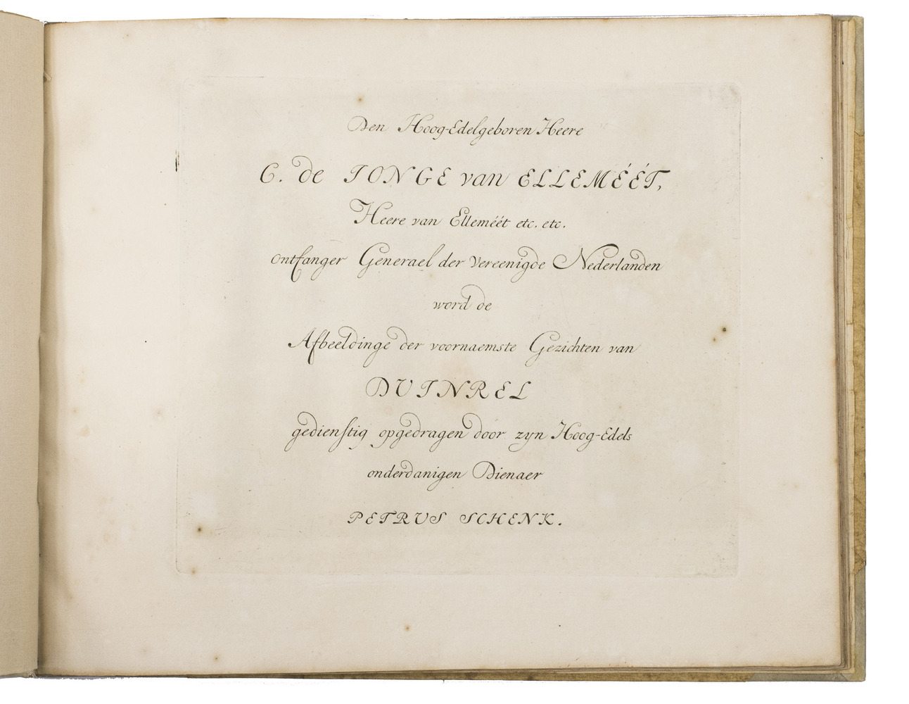 This suite of prints was published as part of the series Paradisus oculorum, sive conspectus elegantissimi centum (1702) by Pieter Schenk I (1660-1711), together with print series of The Loo, Dieren, Voorst, Rosendael, and the "Praetorium" of the Swedish King. The six parts were also issued separately with the dedications to the owners serving as title-pages, as is the case here. When Ellemeet (1646-1721), Procurer General for the Dutch Republic, bought the estate in 1680, much of it was still wild land and dunes. In the next two decades, he turned it into the lavish wooded estate shown in the present engravings. While many great estates of the time appeared in different print series over the years, this was not the case for Duinrel. As it was demolished in 1968, the various views by Schenk are nearly the only surviving images of it. The present set is watermarked Strasbourg Bend = IV (similar to Heawood 73 & 78, from ca. 1720), so it may have been published by Pieter Schenk II (1693-1775) soon after his father's death.