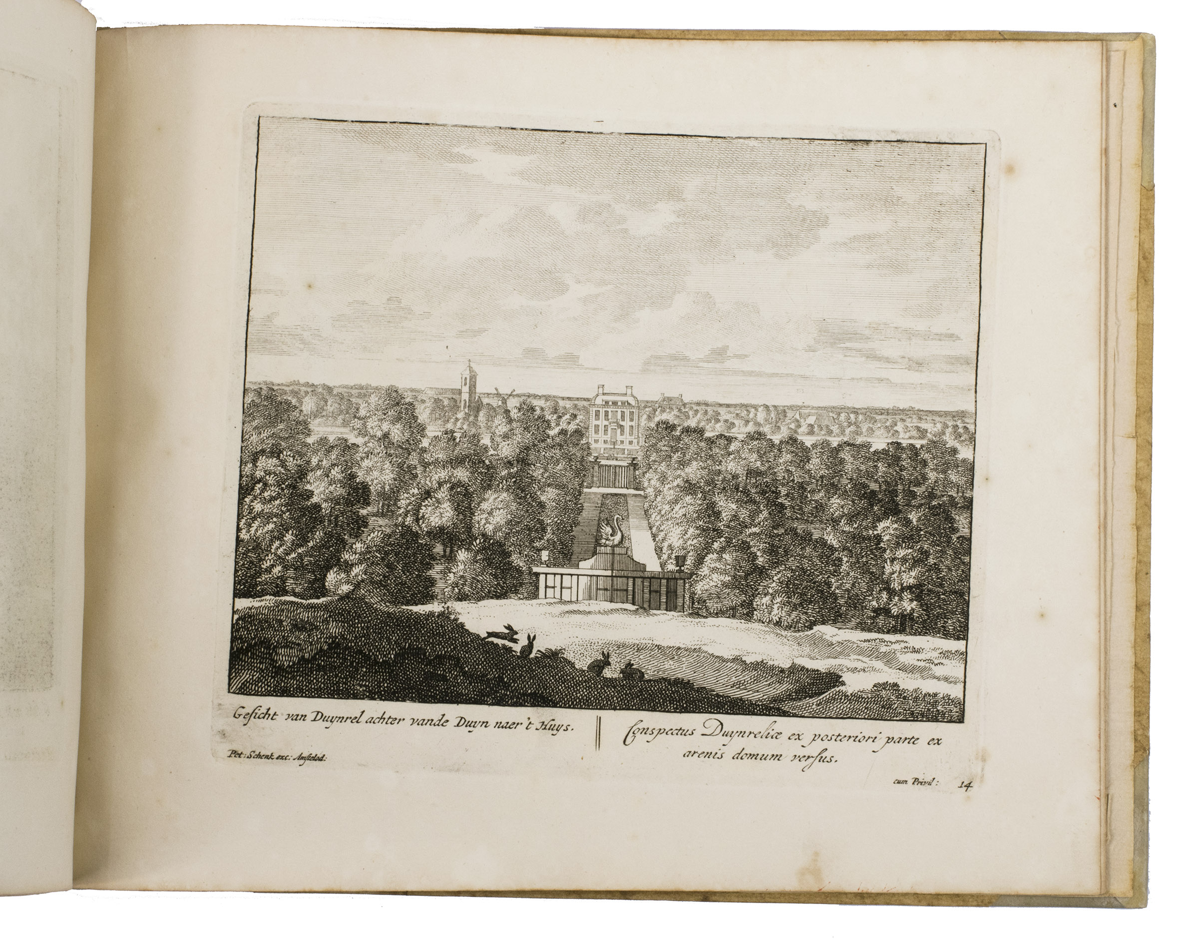 A complete set of 16 numbered views of the magnificent buildings, gardens, and woods of Cornelis de Jonge van Ellemeet's "Duinrel" estate near Wassenaar. Like the other great Dutch estates of the 17th century, it included gardens, fountains, mazes, and pavilions, but it is distinguished from the others by its extensive woods, uncultivated land, and its location at the edge of the sand dunes near the coast. This silvan flavour is also reflected in the emphasis on the Greco-Roman goddess Diana in the decoration, which is visible on some of the prints.