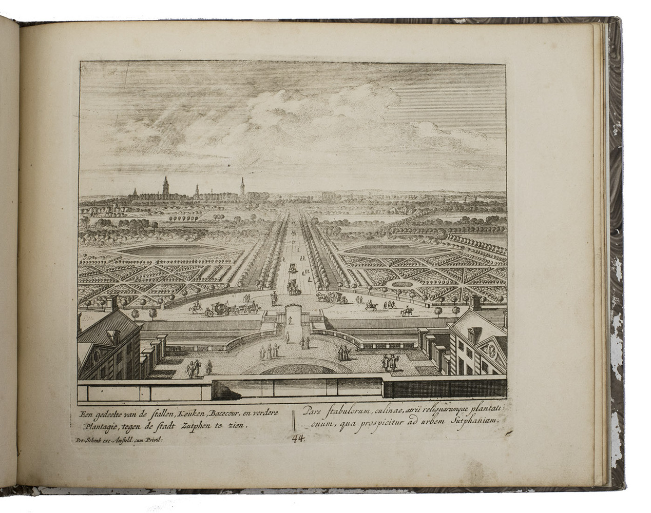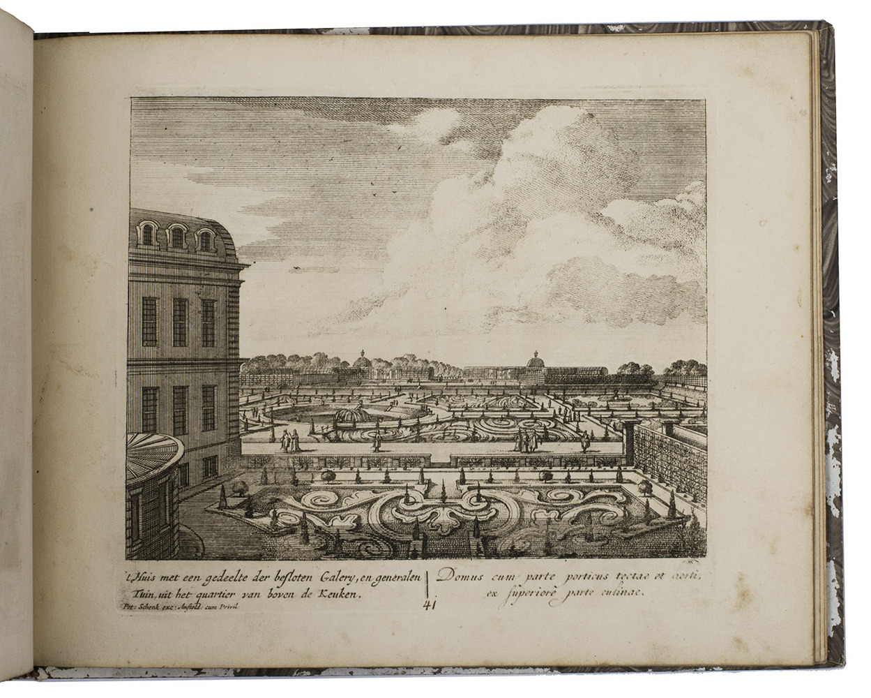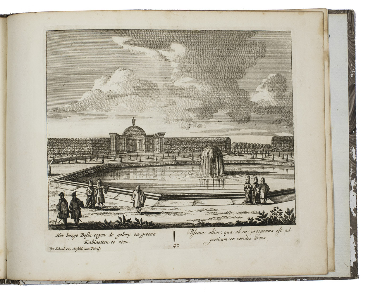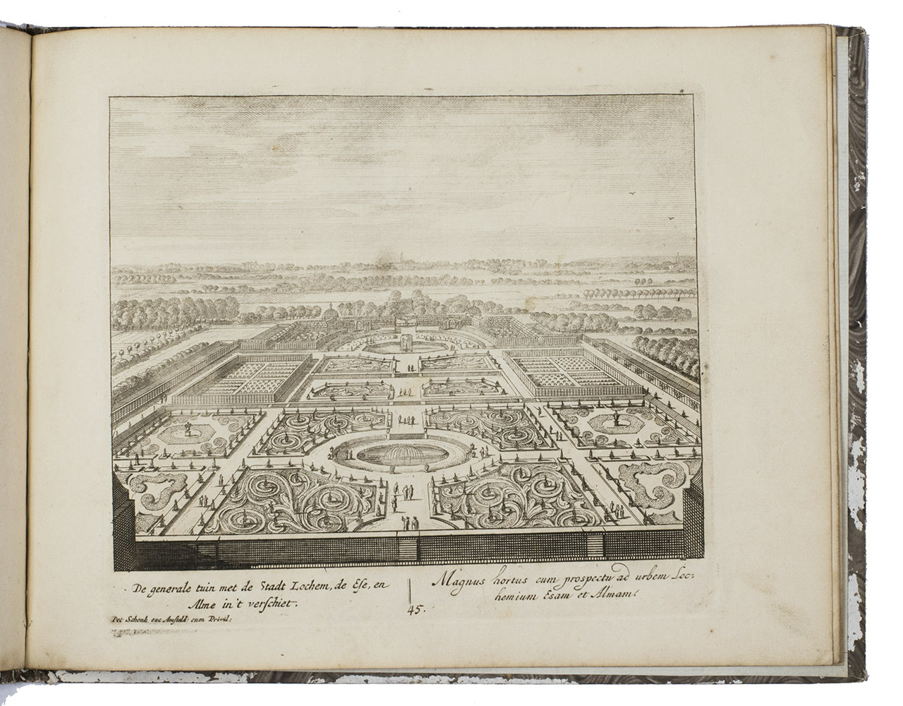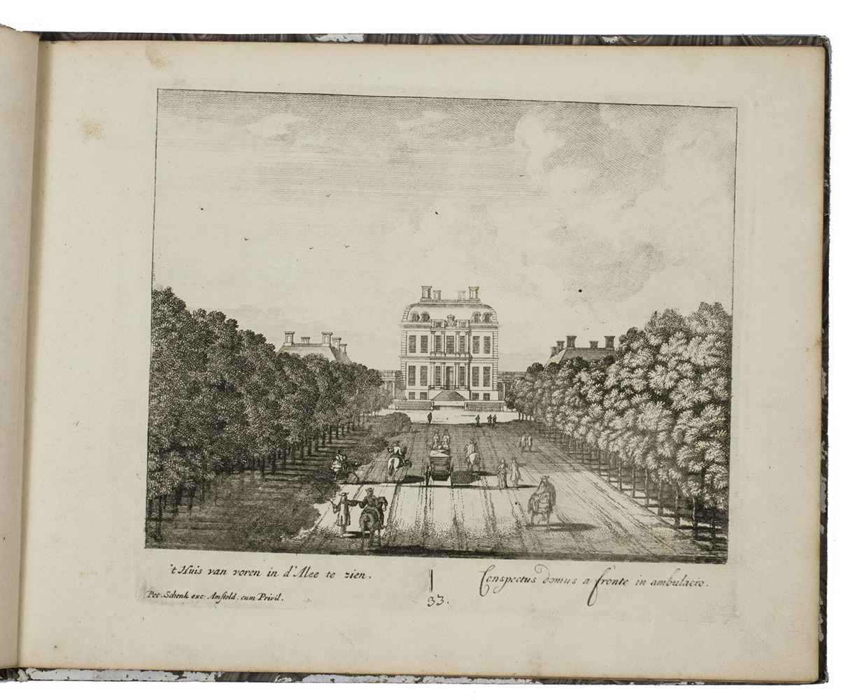 A magnificent series of 16 views of the house and gardens of "De Voorst", the country estate of Arnold Joost van Keppel (1669/70 - 1718), Baron of Ashford, Margrave of Bury and Count of Albemarle, built by the architect Jacob Roman (1640 - ca.1716). Each view has a caption in Dutch and Latin below, mostly in two lines.Van Keppel inherited the estate near Zuthphen in 1686. At the expense of King William III of England (formerly the Dutch Stadtholder Willem III), he replaced the modest buildings and grounds with the lavish palace and gardens that contemporaries dubbed "the Versailles of the Achterhoek". After the death of Van Keppel's widow the estate declined, parts were torn down in the 19th century and a fire destroyed the interior in 1943. The estate was restored in the 1950s and 1990s to the present state. Schenk's present architectural and horticultural series gives a detailed view of the buildings, gardens and fountains soon after they were built during the heyday of "De Voorst".