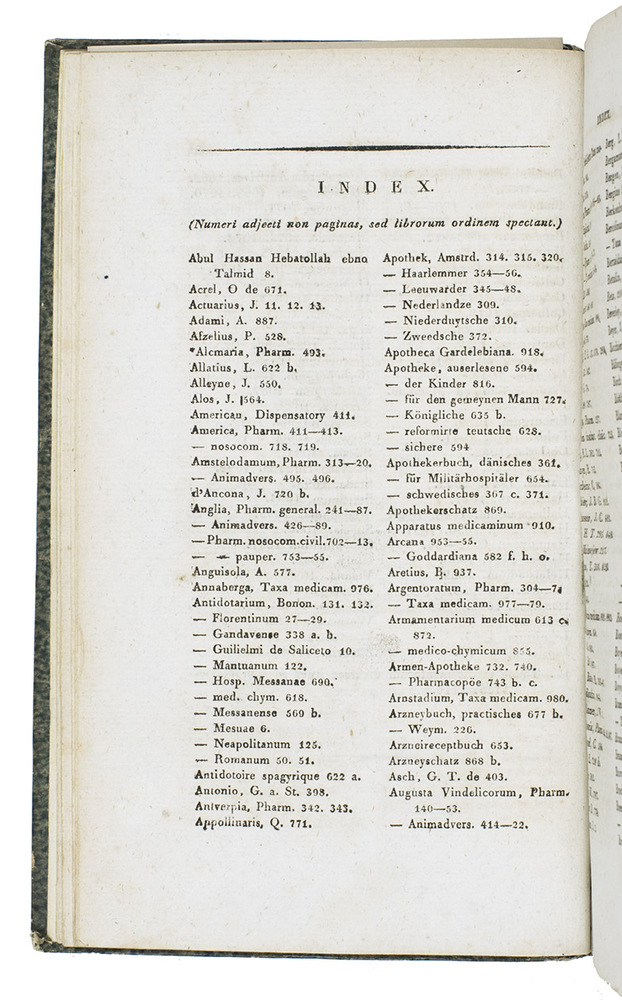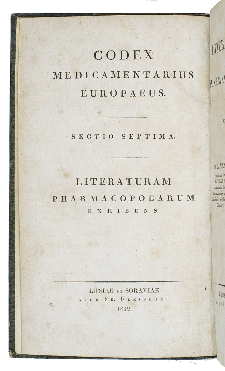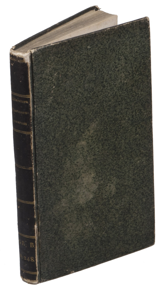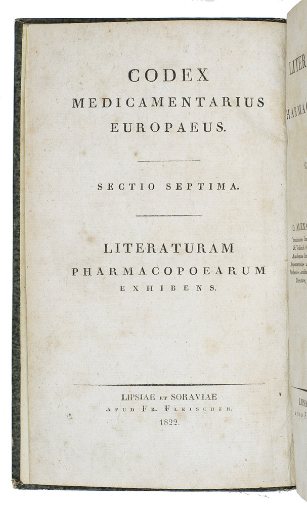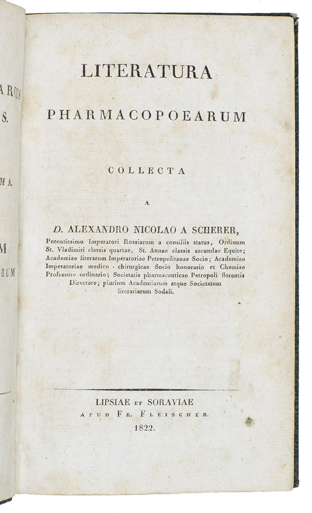 Rare first and only edition of a bibliography of European pharmacopoeiae published to ca. 1820, by Alexander Nicolaus Scherer. It is arranged systematically on publication place and the relatedness of the pharmacopoeias. The book contains over 1100 titles and appeared as the last volume in a series of pharmacological texts (vols. 1-7, 1818-1822).