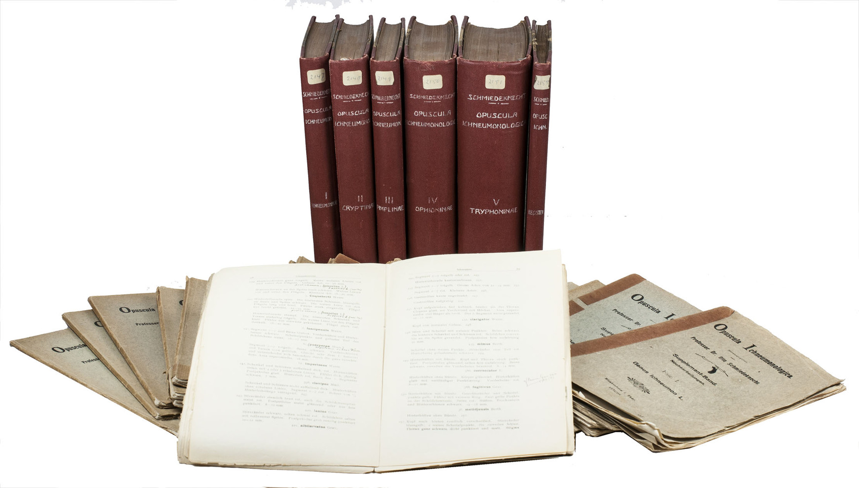 Complete set of a standard hymenopterological work on ichneumon wasps by the German entomologist Otto Schmiedeknecht (1847-1936). The set consists of 6 volumes, including a register, and 25 supplement volumes, numbered Fasc. I-XXV. "... (at the turn of the 20th century) extensive work was carried out by ichneumonologists ... All of the research done in this period has been recorded in Schmiedeknecht's (1902-1936) multivolume work, Opuscula ichneumonologica. In the division of the subfamily Tryphoninae, Schmiedeknecht followed Holmgren's system but treated the tribe Tryphonini within the limits set by Thomson ... He included 13 genera comprising some 120 species of Palearctic (predominantly European) fauna" (Kasparyan).