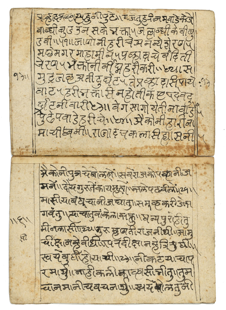 A fine and early specimen of written Marathi, an Indic language spoken mainly in the western Indian state of Maharashtra, but also in Goa, Karnataka, Tamil Nadu, Telangana, Gujarat, and Kerala. One of the 22 scheduled languages of India, with 83 million speakers, Marathi has the third largest number of native speakers in India, after Hindustani and Bengali, and ranks 13th in the list of languages with most native speakers in the world. It can boast some of the oldest literature of all modern Indian languages.
