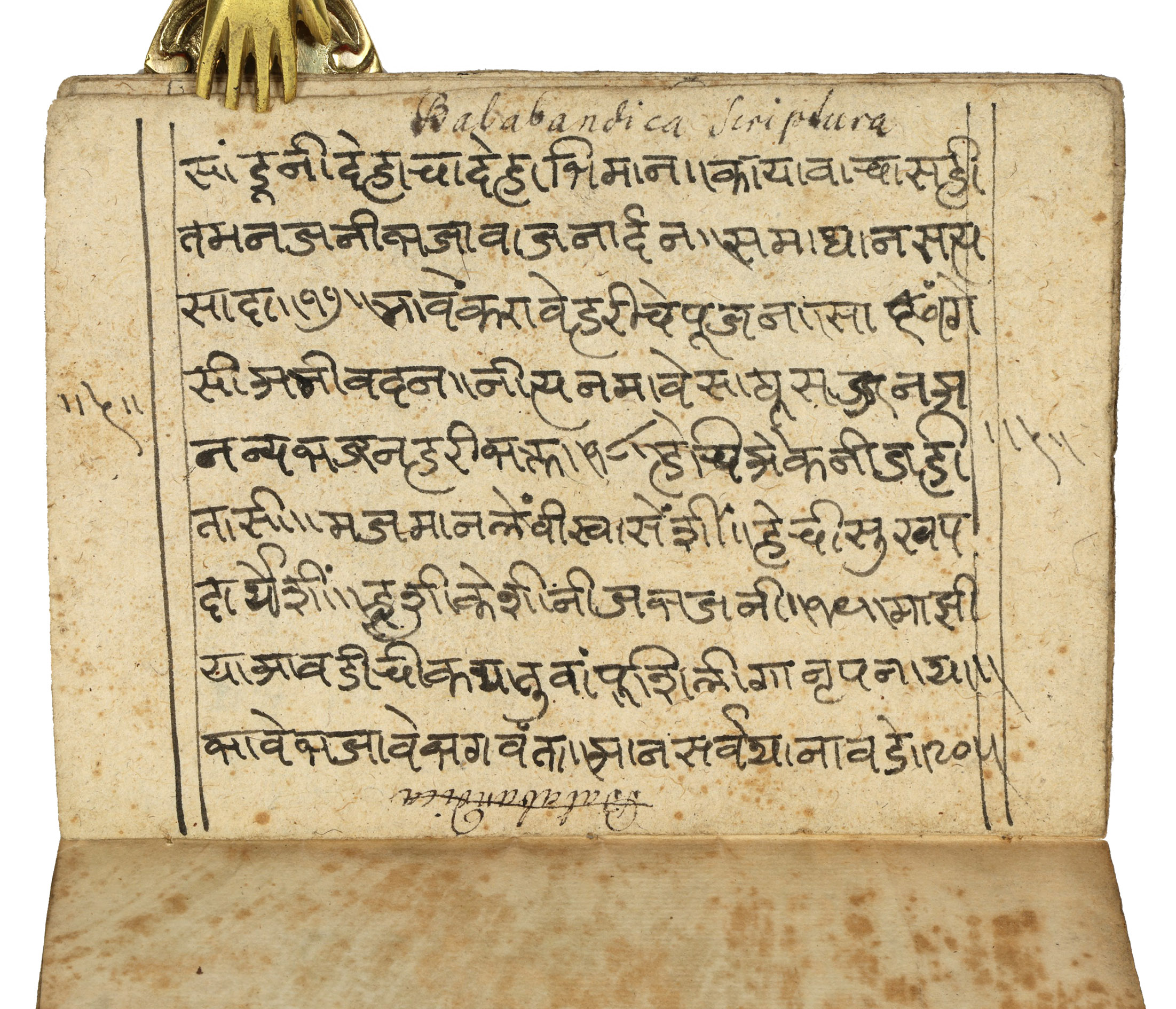 On the verso of the front cover, the work is titled and gifted in a contemporary hand: "Liber Scripturae Balabandu in charta Indica. Lingua haec sacra est Maratharum in India, eadem fere quae popularis sed litteris diversis, quae fere congruunt cum litteris Brahmanicis superioris Indiae. Donum Domini Beniaminas Schulzii, missionarii in Madrasta". The following page is superscribed, "Scriptura Balabandica Maratharum sacra". A rare survival of an 18th-century manuscript written in the Marathi language.